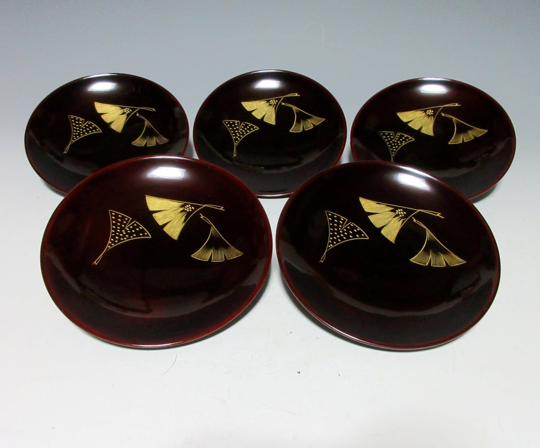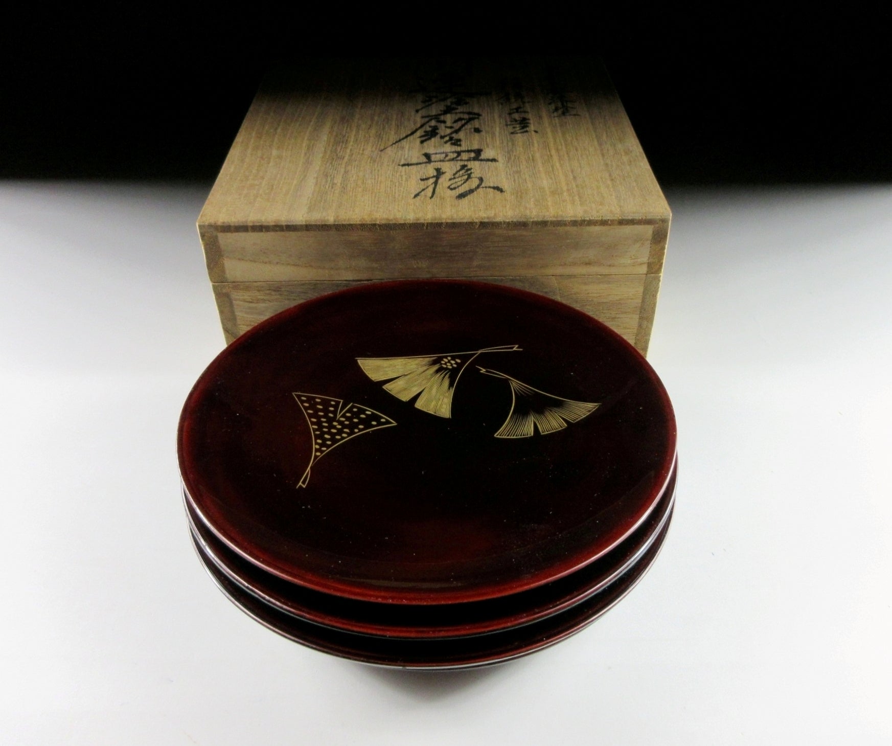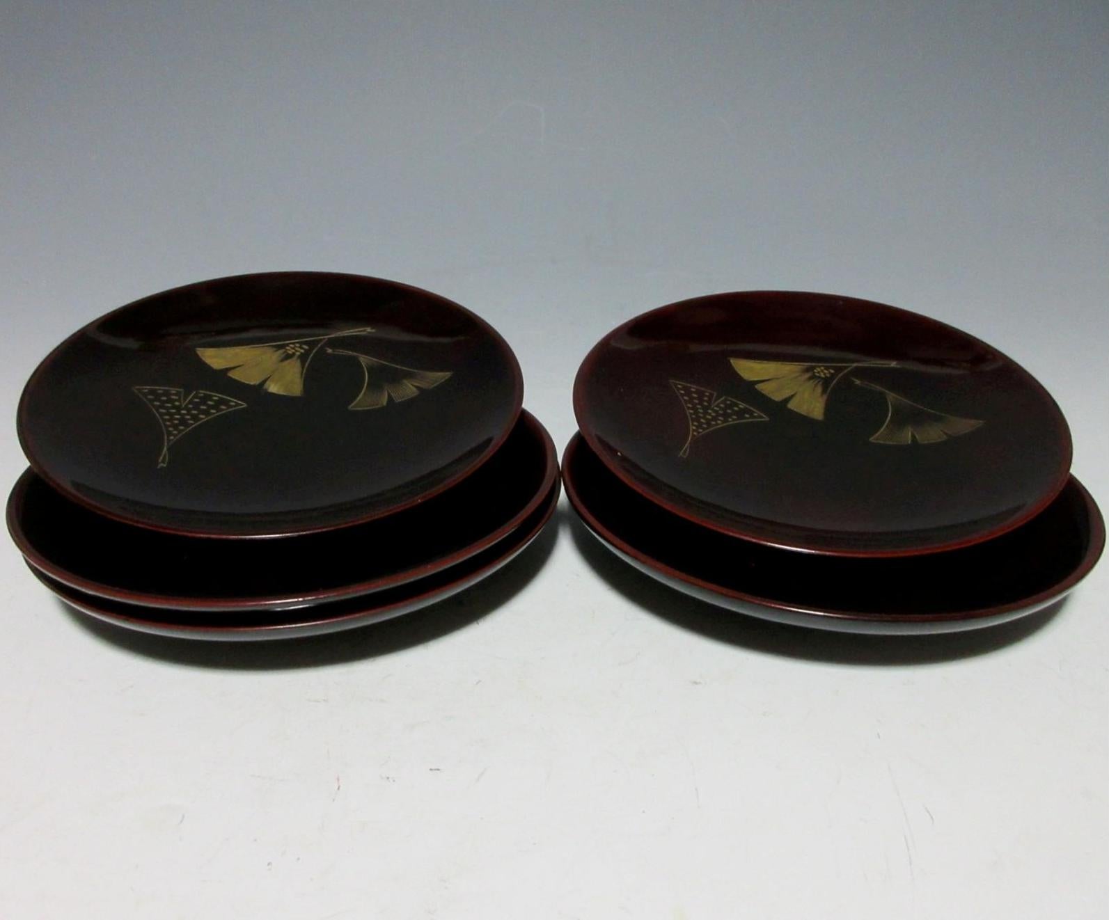 This listing is for a set of five Kawatsura-nuri lacquerware plates made around 30-40 years ago. They are made of wood and coated in brown glossy lacquer. Each plate is decorated with gold makie ginkgo leaves over a thick layer of lacquer, and they have a nice smooth finish. They come with their original wooden storage box as well as a yellow wrapping cloth for when the plates are not in use.
