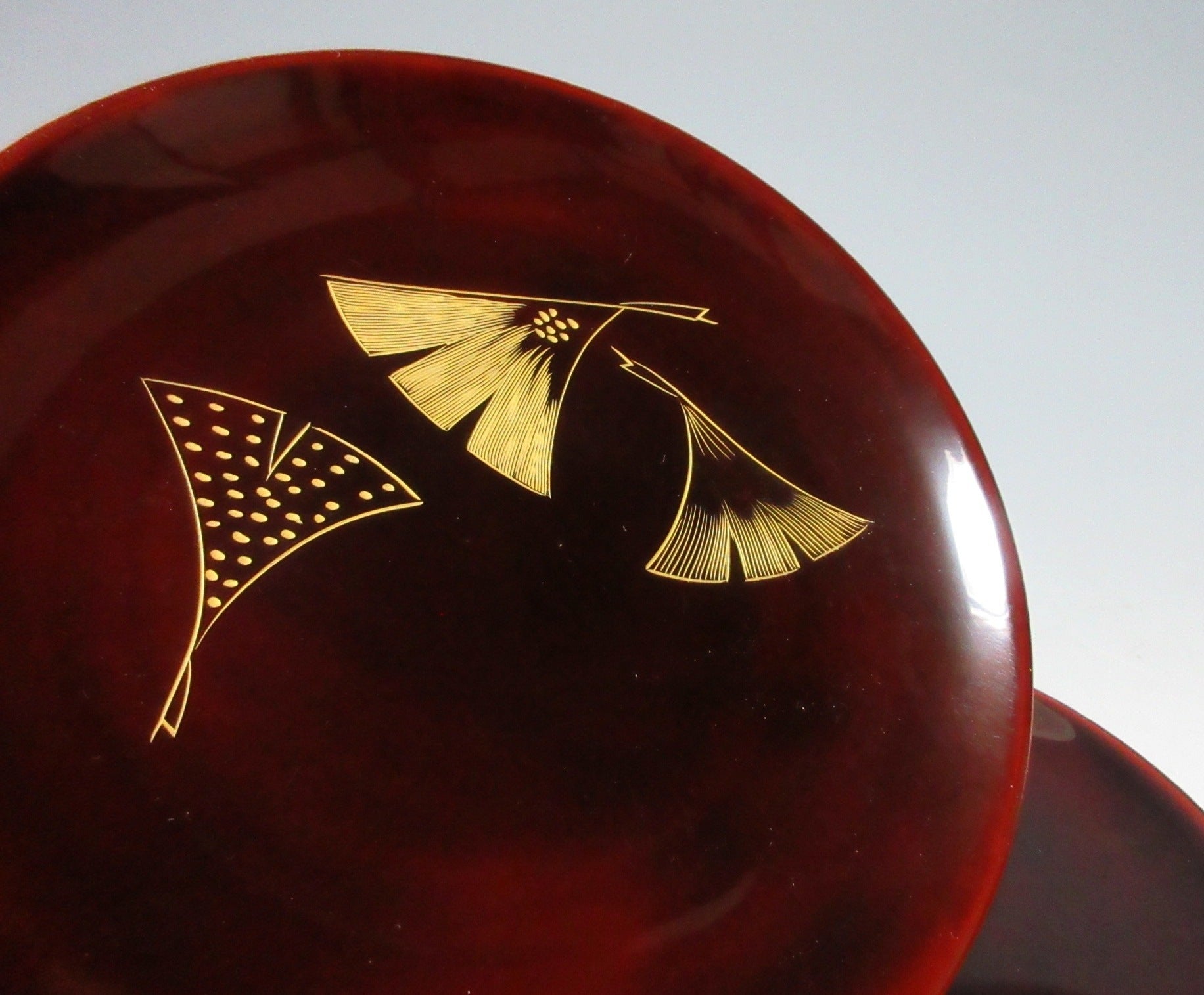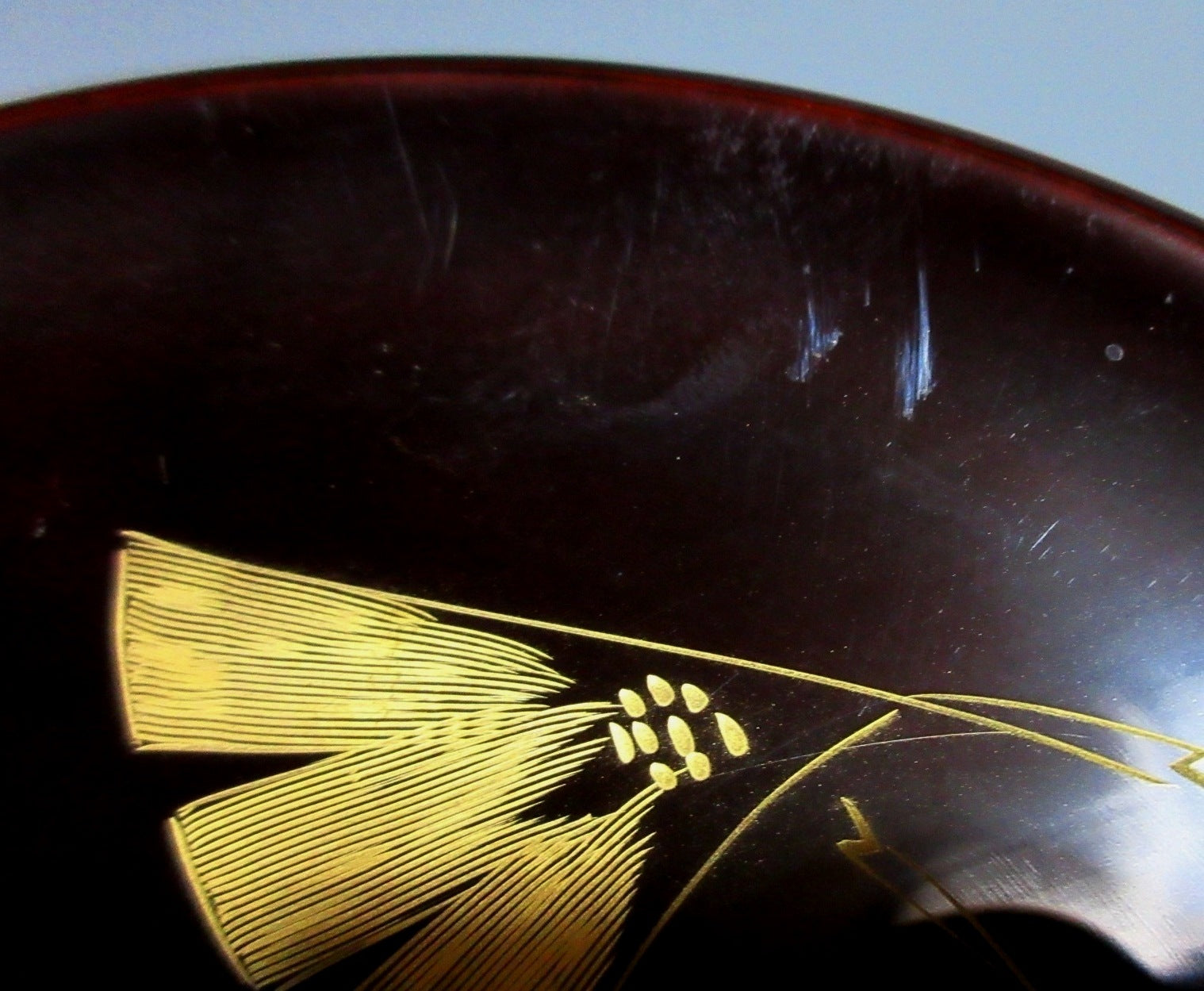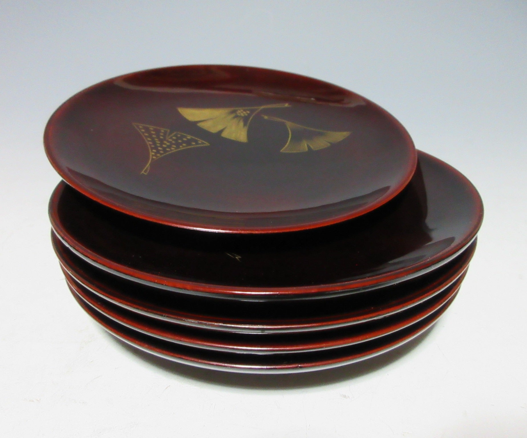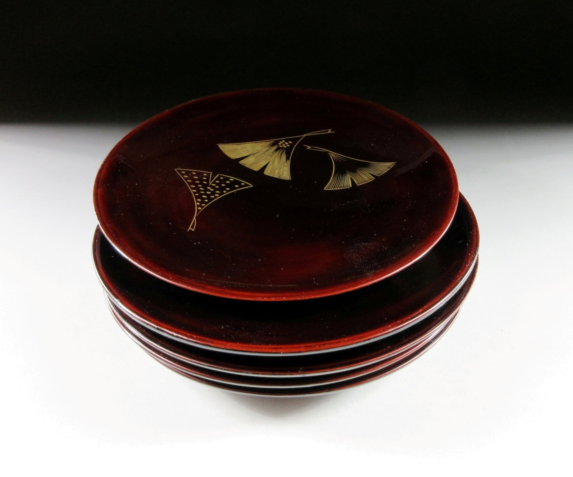 This listing is for a set of five Kawatsura-nuri lacquerware plates made around 30-40 years ago. They are made of wood and coated in brown glossy lacquer. Each plate is decorated with gold makie ginkgo leaves over a thick layer of lacquer, and they have a nice smooth finish. They come with their original wooden storage box as well as a yellow wrapping cloth for when the plates are not in use.