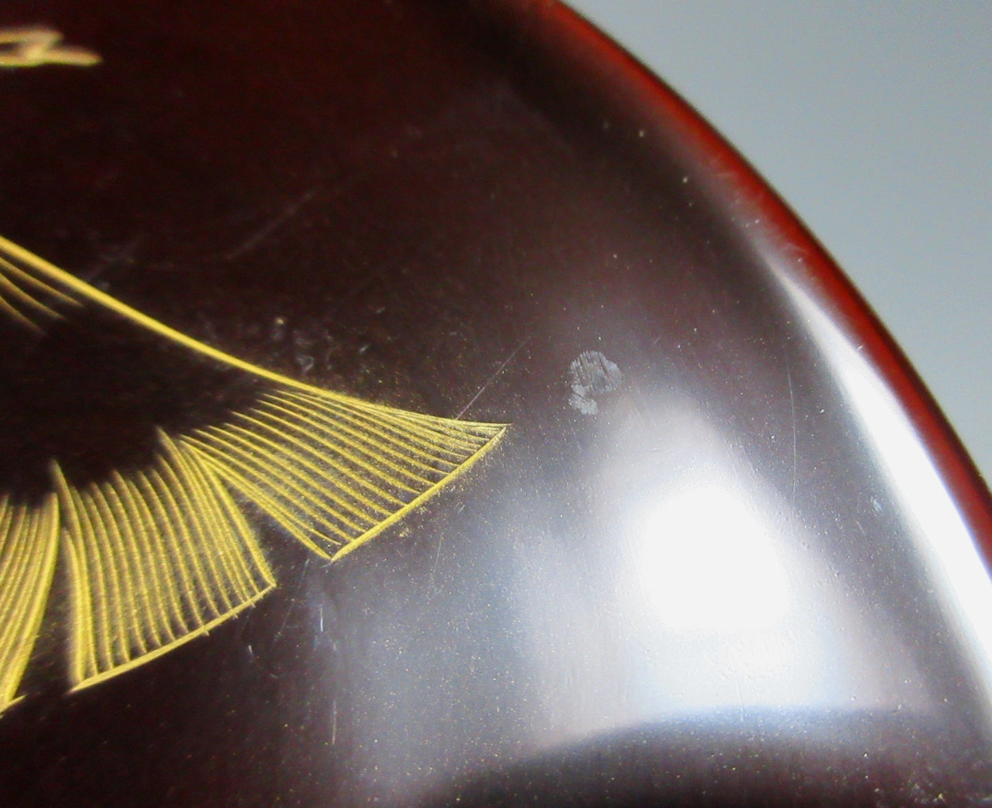 They’re in very good condition aside from some minor surface wear such as light scratches, and scuffing on the bottom. Also there are some minor borer holes on the interior of the box, and the yellow wrapping cloth is spotty.