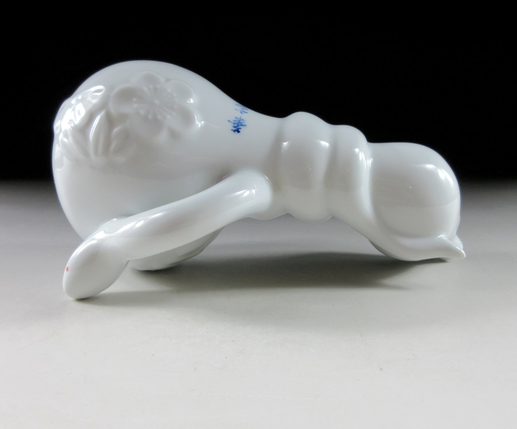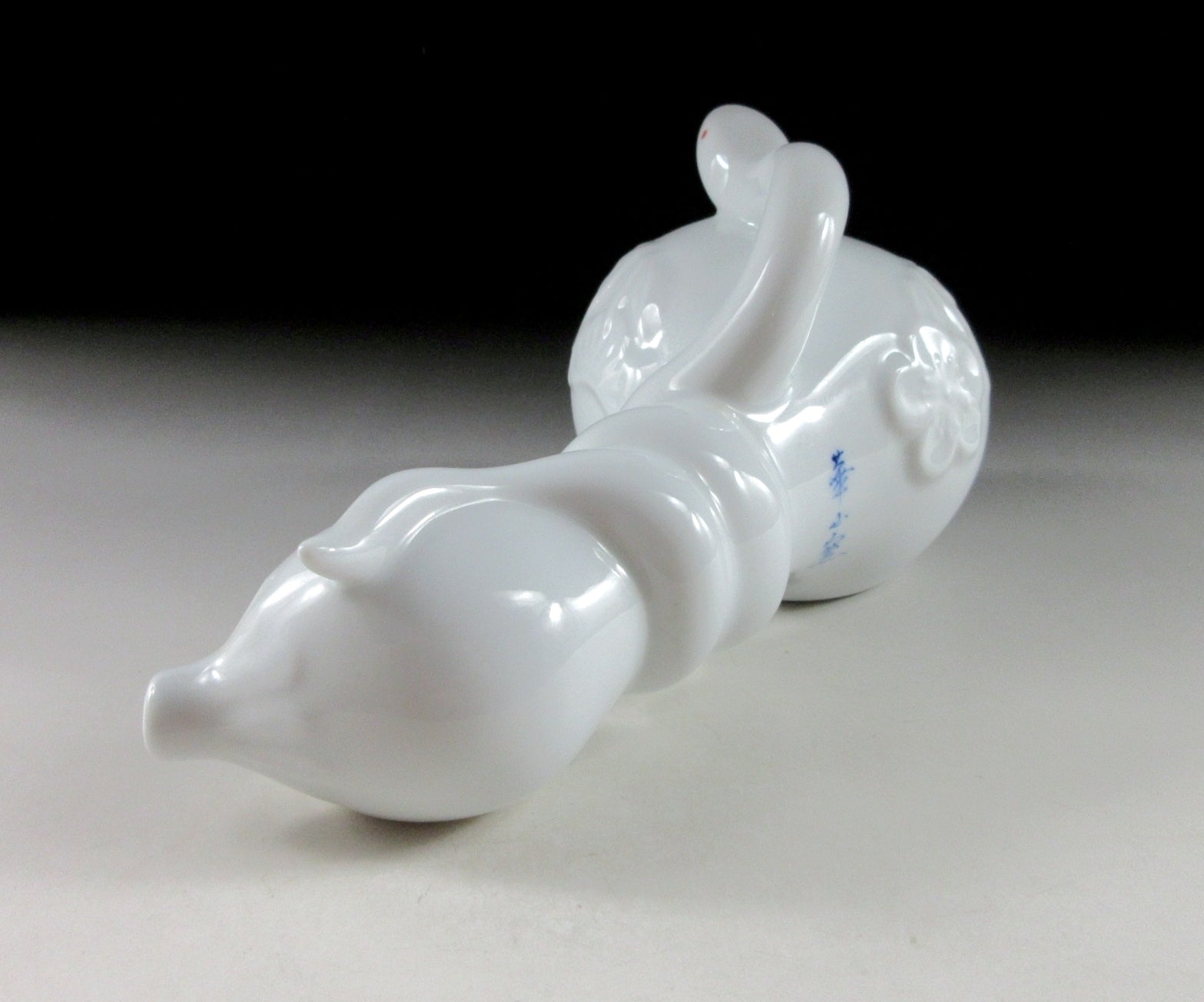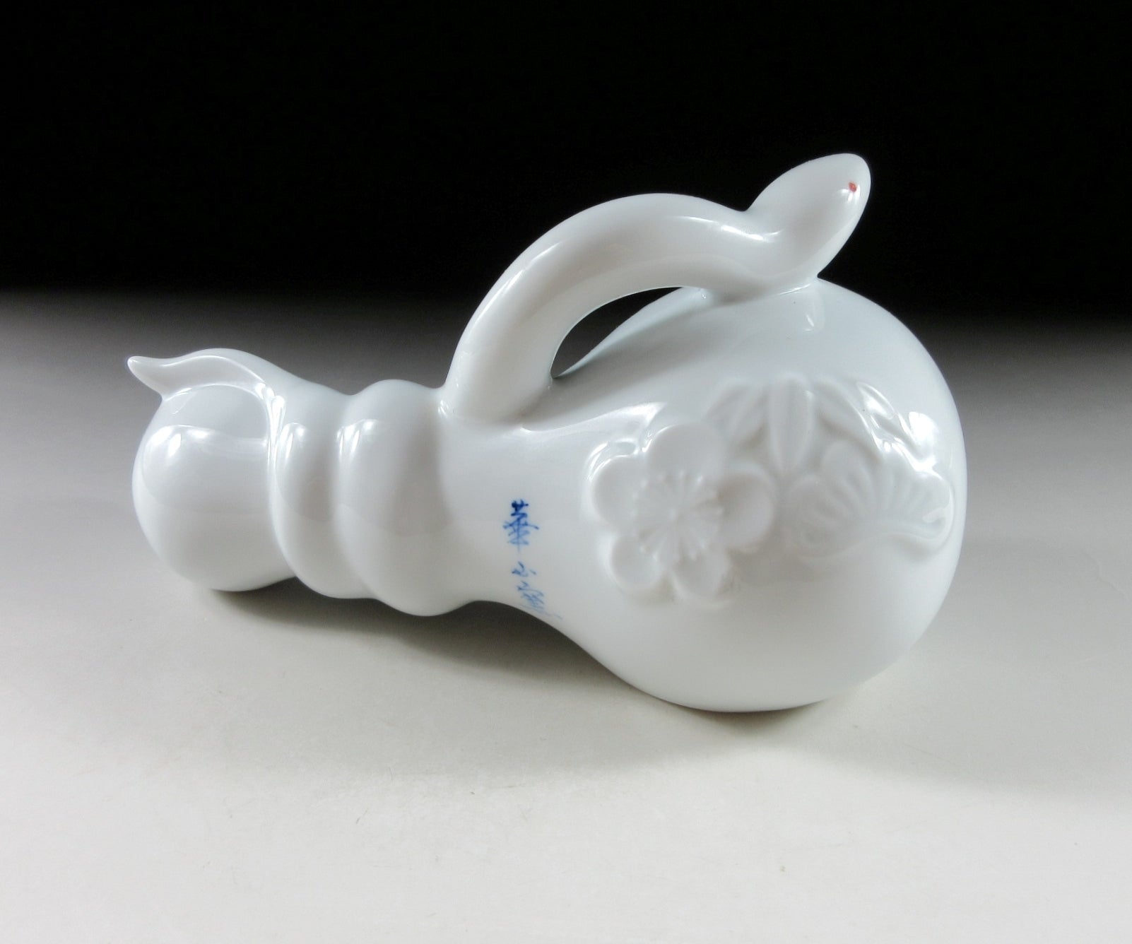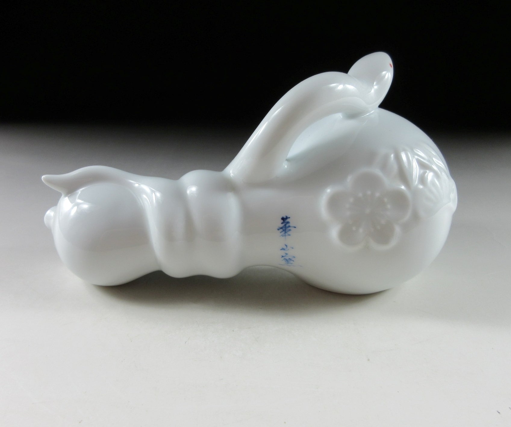 This listing is for an Arita-ware snake okimono made 36 years ago by Kazan Gama. It is made from a slip mould and coated in glossy hakuji glaze. This piece features a snake wrapped around a gourd, and the gourd is decorated with ume blossoms. This piece was most likely made to commemorate the Year of the Snake back in 1989. The signature of the kiln can be found on the snake’s belly, sorry no box for this one.