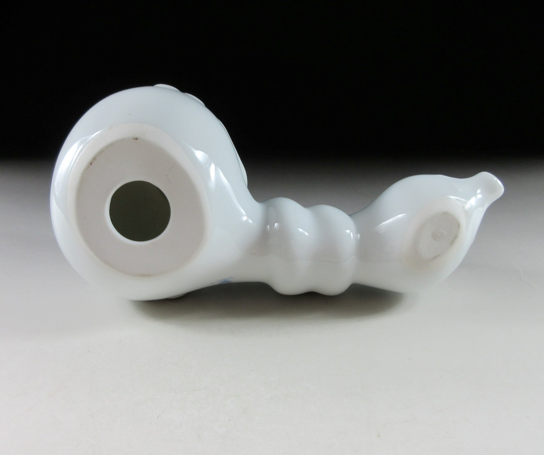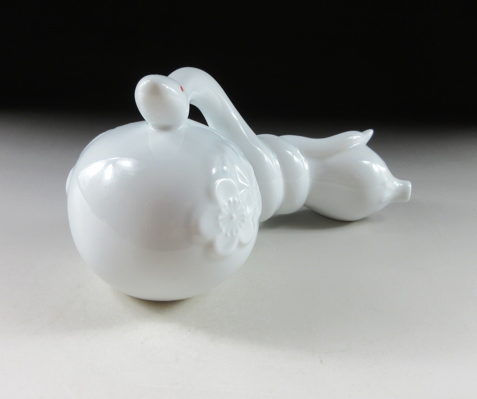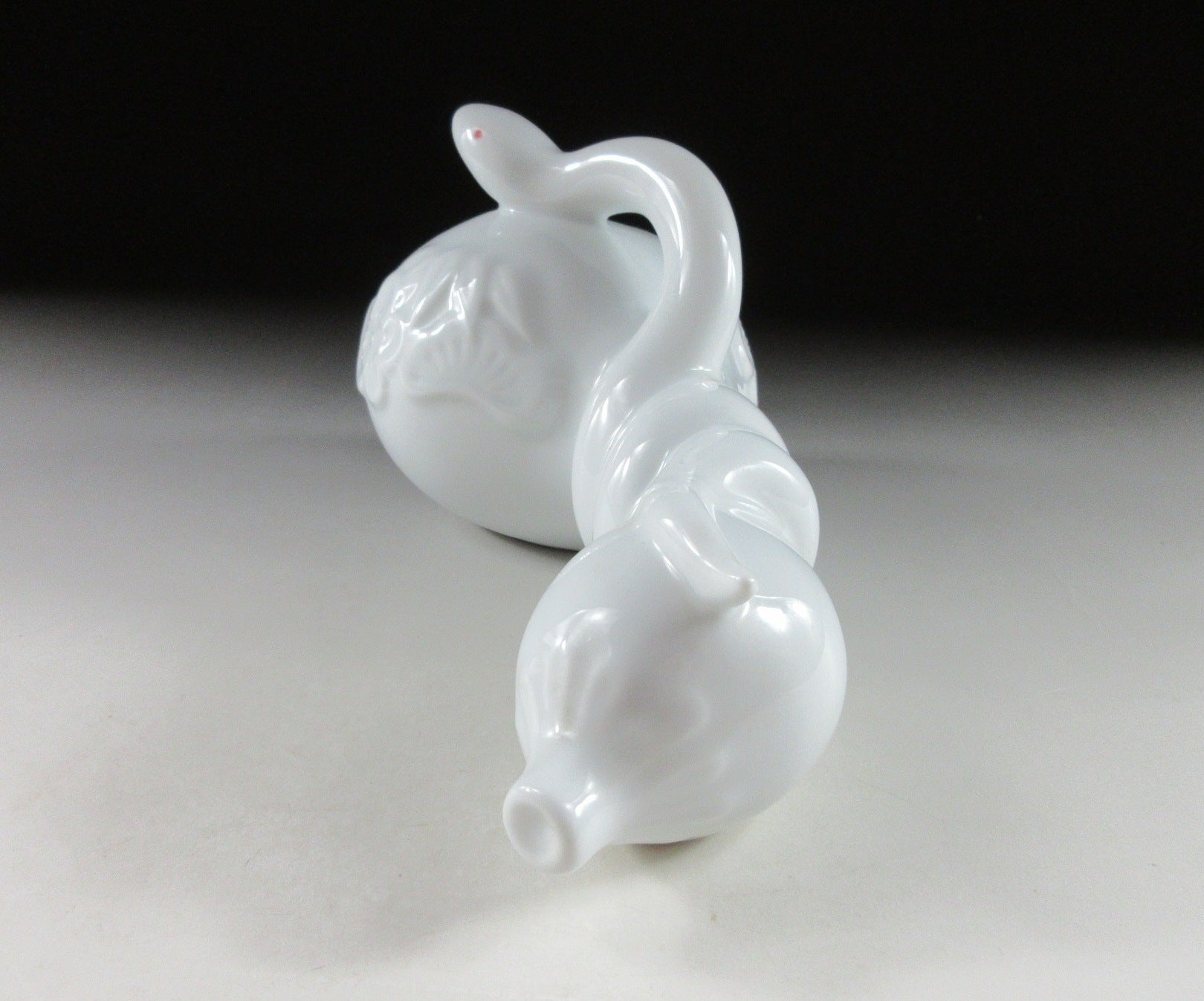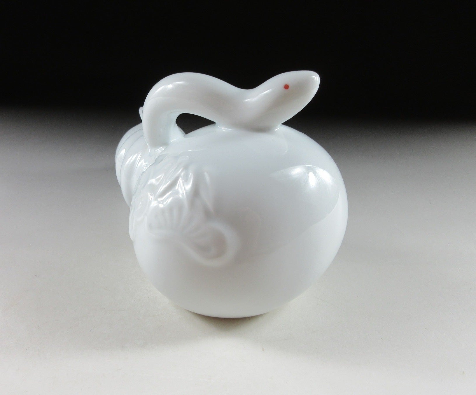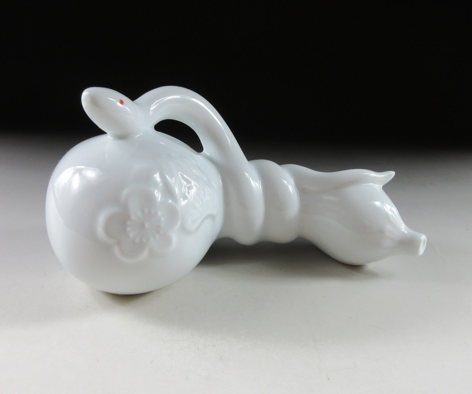 This listing is for an Arita-ware snake okimono made 36 years ago by Kazan Gama. It is made from a slip mould and coated in glossy hakuji glaze. This piece features a snake wrapped around a gourd, and the gourd is decorated with ume blossoms. This piece was most likely made to commemorate the Year of the Snake back in 1989. The signature of the kiln can be found on the snake’s belly, sorry no box for this one.