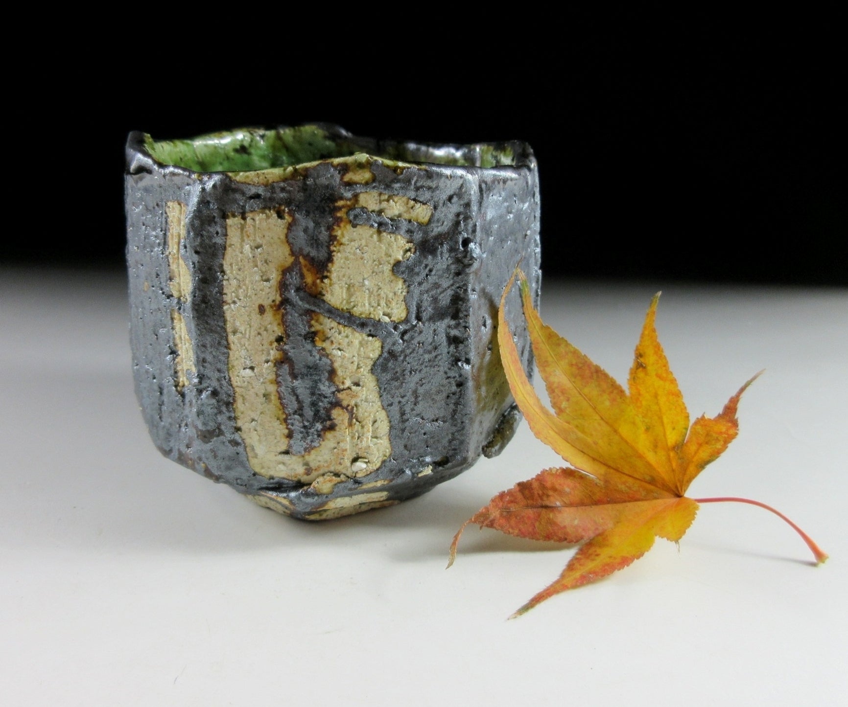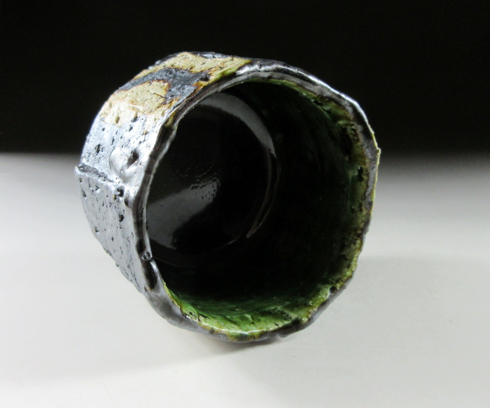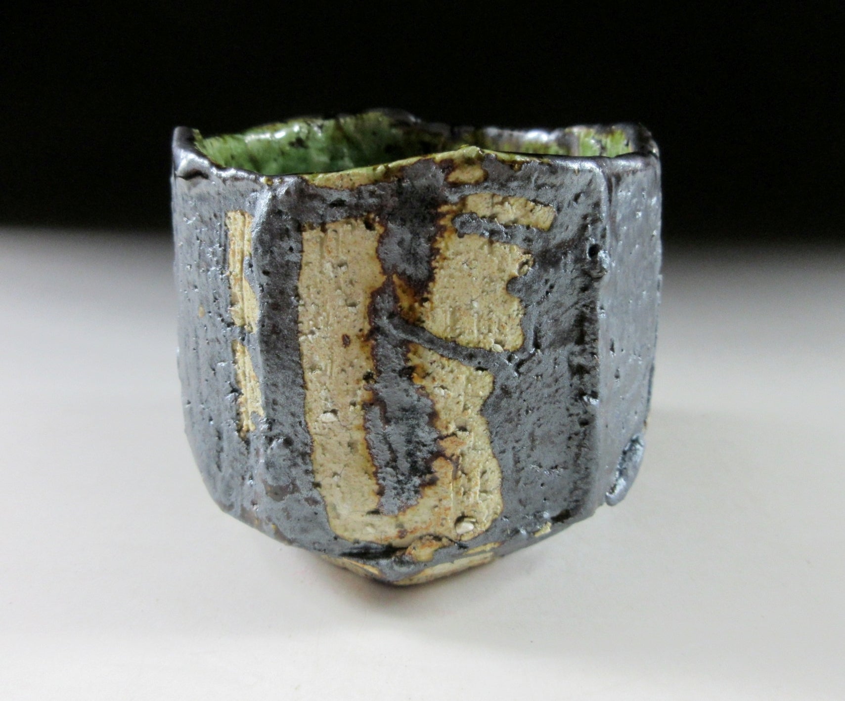 This listing is for an oribe glaze Kasama-ware yunomi made around 5 years ago by Kazawa Hiromasa. It is hand-turned and decorated with green oribe glaze and iron brush markings. The exterior features bold facets and the interior is coated in thick green copper glaze. This piece is ample in size, and has a wonderfully organic appearance. Kazawa prefers to leave his work unsigned like a lot of Mashiko potters, thus joining the ranks of the ‘unknown craftsmen’. Sorry but no box for this one as it was purchased some years ago at a pottery fair in Kasama.