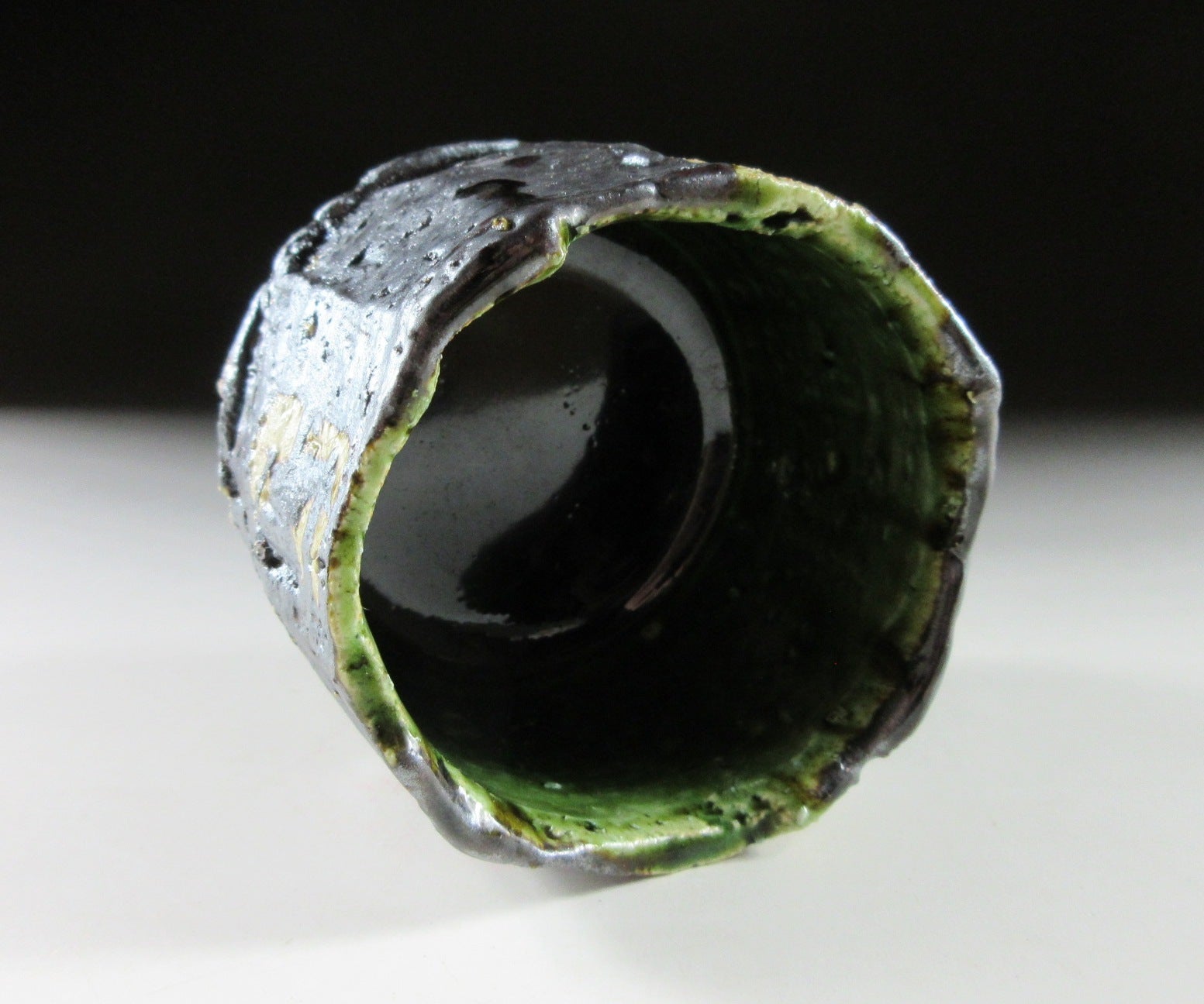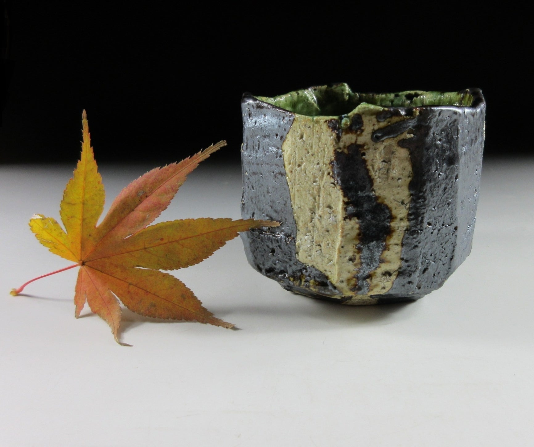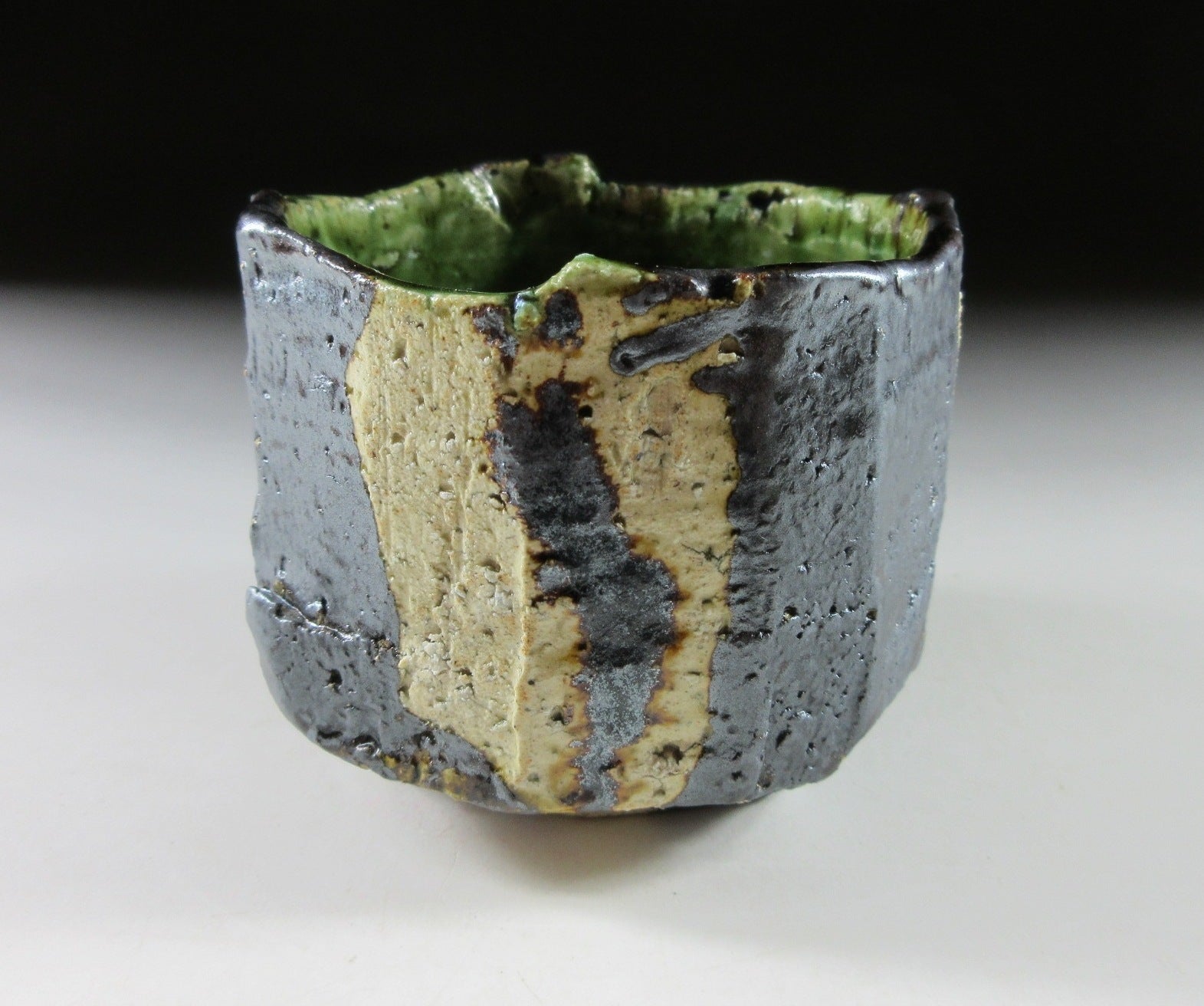 This listing is for an oribe glaze Kasama-ware yunomi made around 5 years ago by Kazawa Hiromasa. It is hand-turned and decorated with green oribe glaze and iron brush markings. The exterior features bold facets and the interior is coated in thick green copper glaze. This piece is ample in size, and has a wonderfully organic appearance. Kazawa prefers to leave his work unsigned like a lot of Mashiko potters, thus joining the ranks of the ‘unknown craftsmen’. Sorry but no box for this one as it was purchased some years ago at a pottery fair in Kasama.