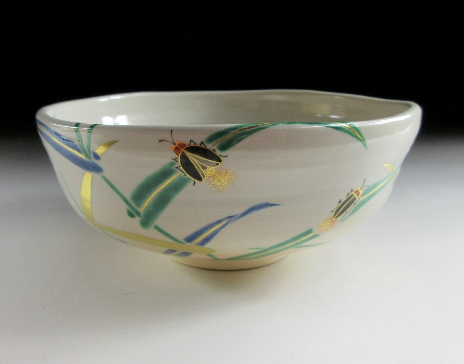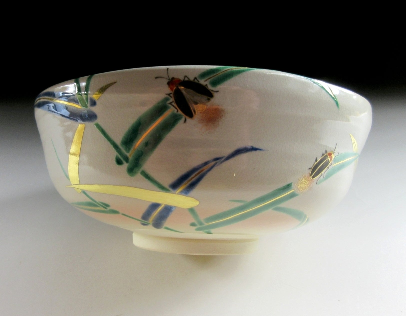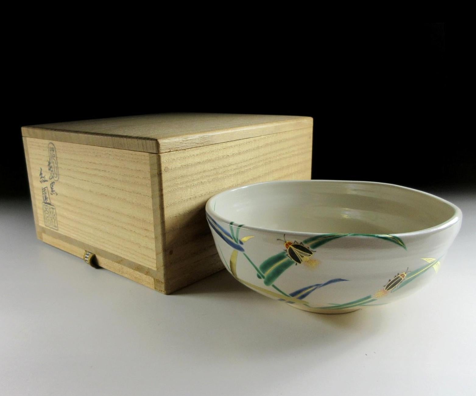 This listing is for a seasonal chawan made around 20 years ago by female potter, Kiba Koen. It is wheel-thrown and the flat hira type used during the summer season. Hira chawan are shallow bowls with low sides designed to cool tea down faster. The bowl in this listing is decorated with hotaru, which means firefly. Hotaru are generally viewed with a sense of nostalgia as they evoke childhood memories of summer. They appear in June and July when evenings are warm, and only last one to two weeks. Their beautiful lights darting in and around streams are believed to be the souls of departed soldiers who died in war. The stamp of the potter can be found on the bottom, and it comes with its original signed wooden storage box. It also comes with a yellow wrapping cloth for when the item is not in use.