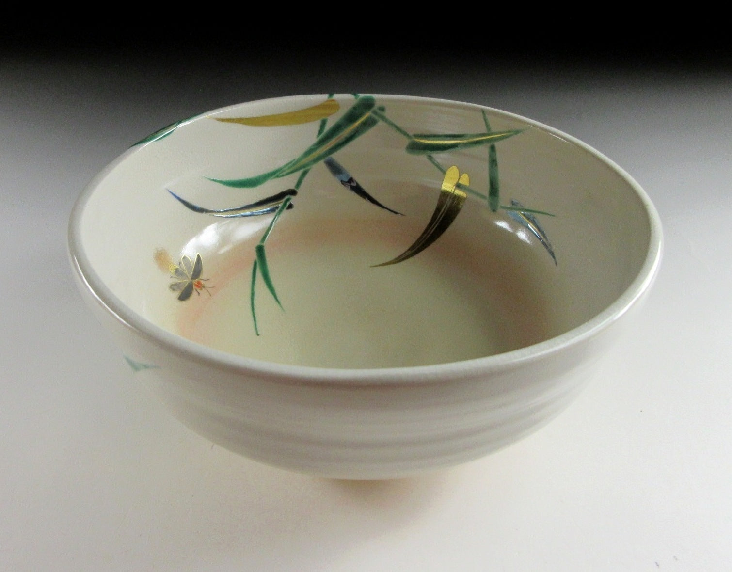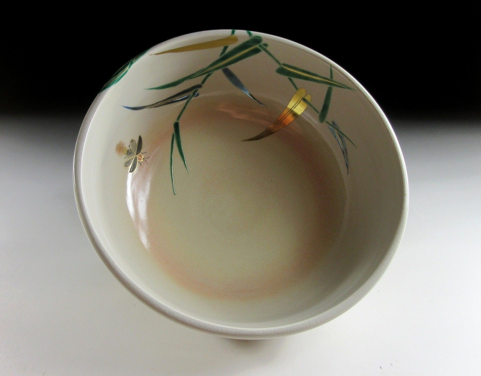 Kyo-ware originated in the 17th century in Kyoto and features overglaze enamel pigments on a porcelain base. The porcelain base acts as white canvas, allowing for beautiful and superior quality designs to be painted. Kyo-ware artisans traditionally produced chawan and utensils for the tea ceremony, however contemporary potters specialize in tableware, tea ceremony items, incense holders, and okimono. Kyo-ware was designated as a traditional craft in 1977.
