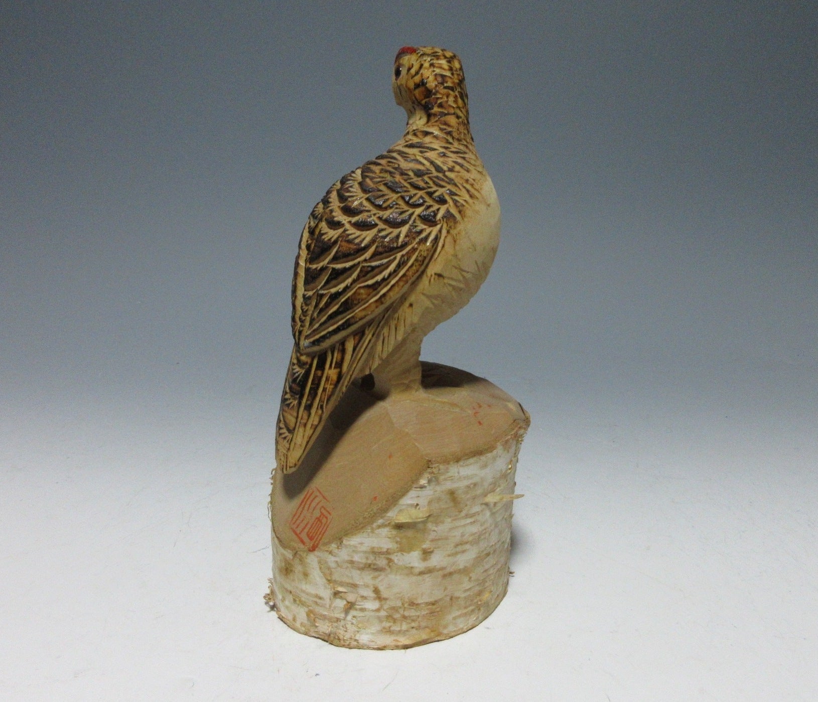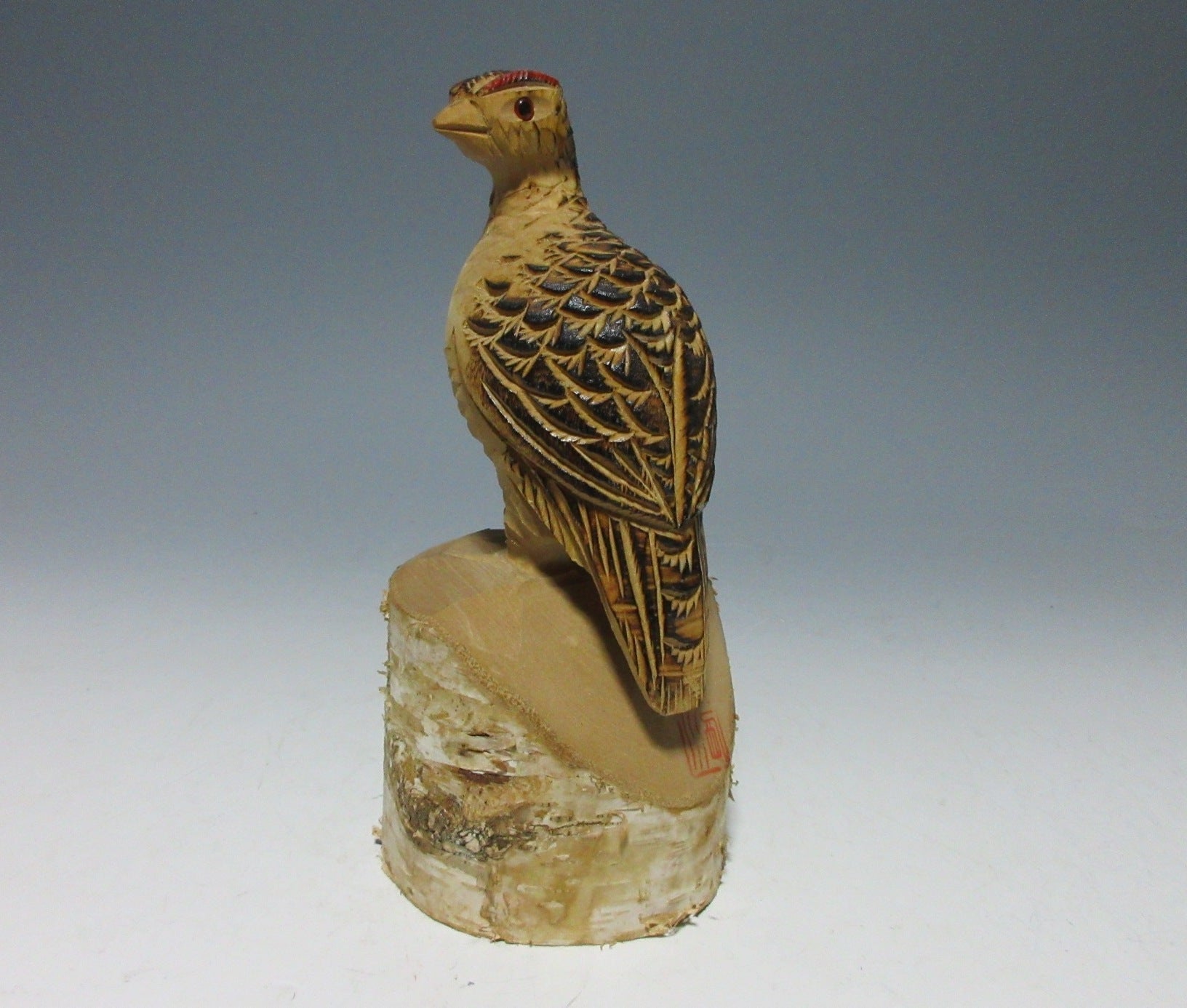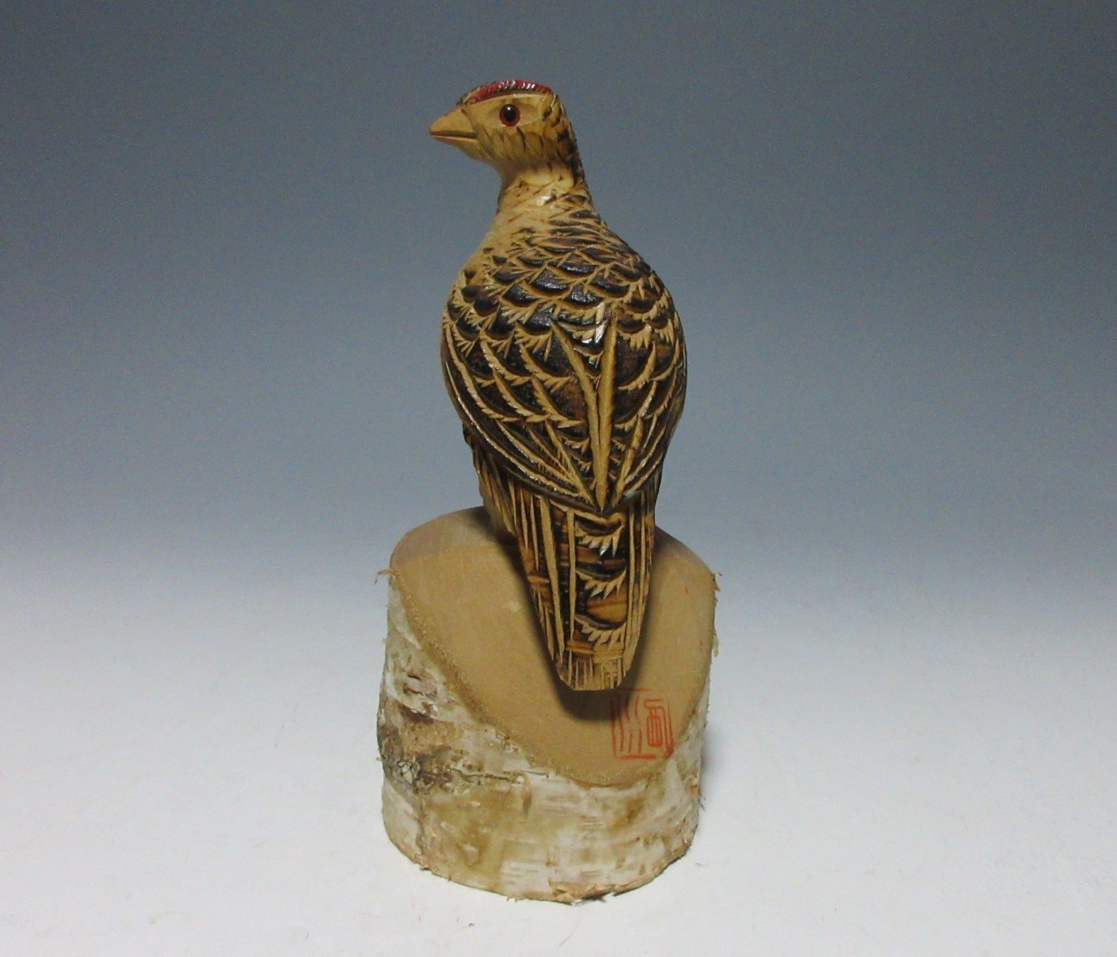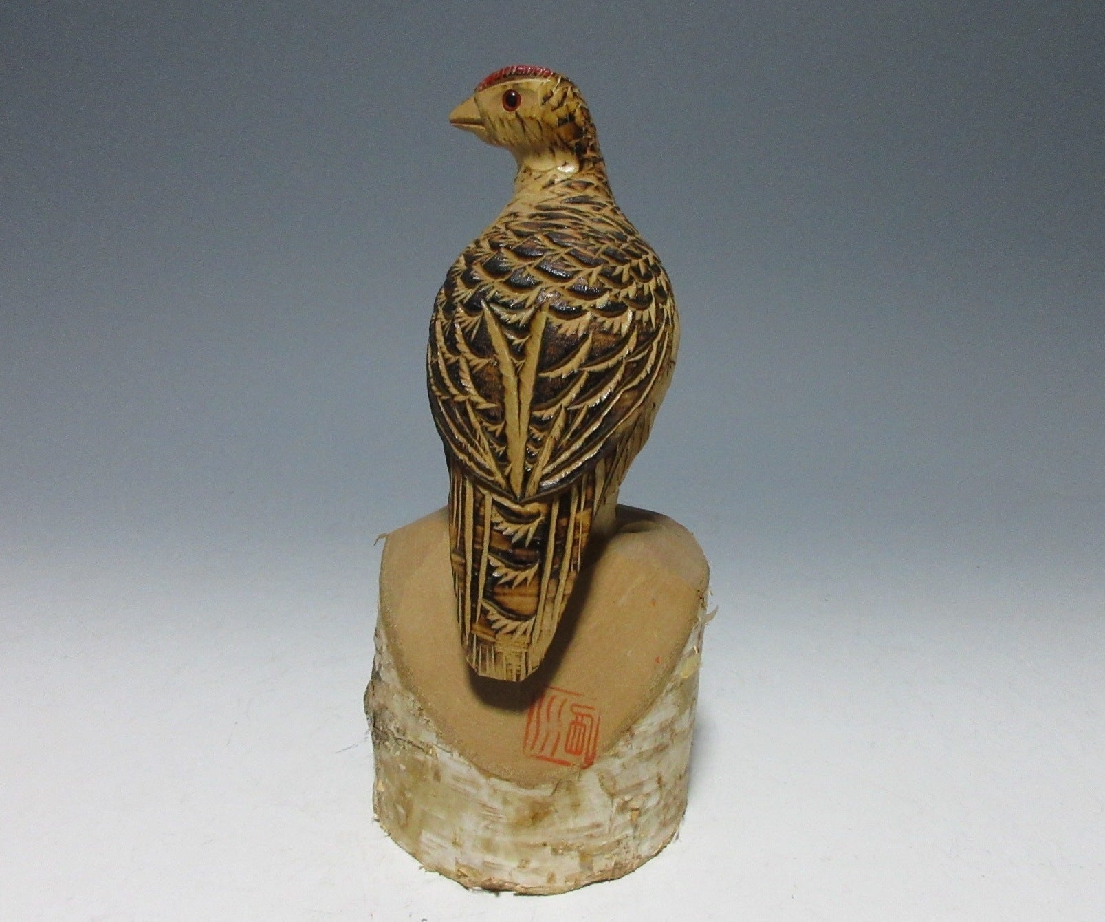 This listing is for a kibori grouse wood carving made around 20 years ago. It is carved from a single piece of birch wood and comes from Matsumoto in Nagano Prefecture. Grouse carvings have been produced in the Matsumoto vicinity since 1955, and they are a traditional craft designated by Nagano Prefecture. Birch grouse carvings used to be a popular souvenir among tourists visiting the alps, but few craftspeople produce them these days. There is a red stamp which is basically unreadable, but I assume it’s the name of an area or hot spring resort somewhere in Nagano.