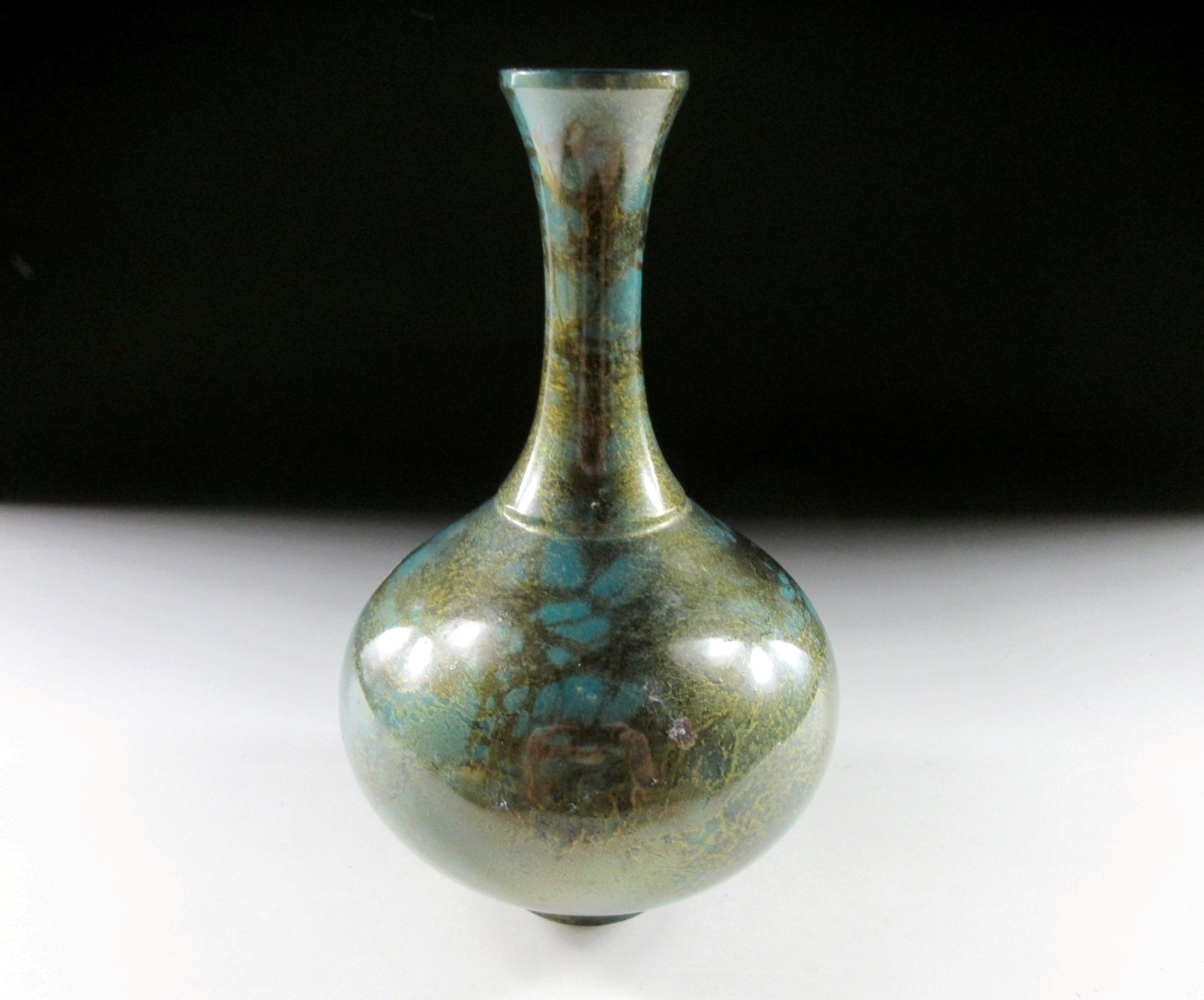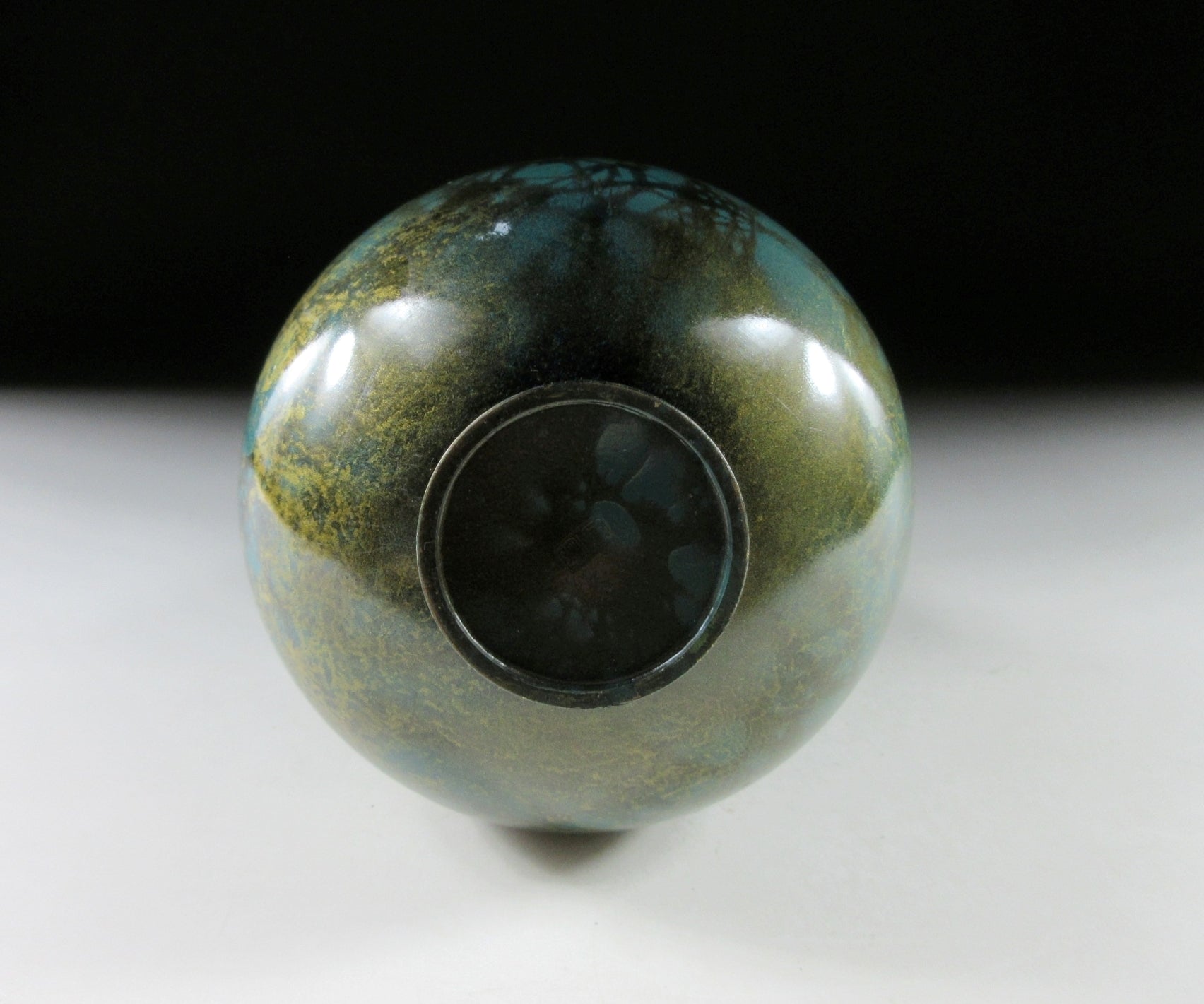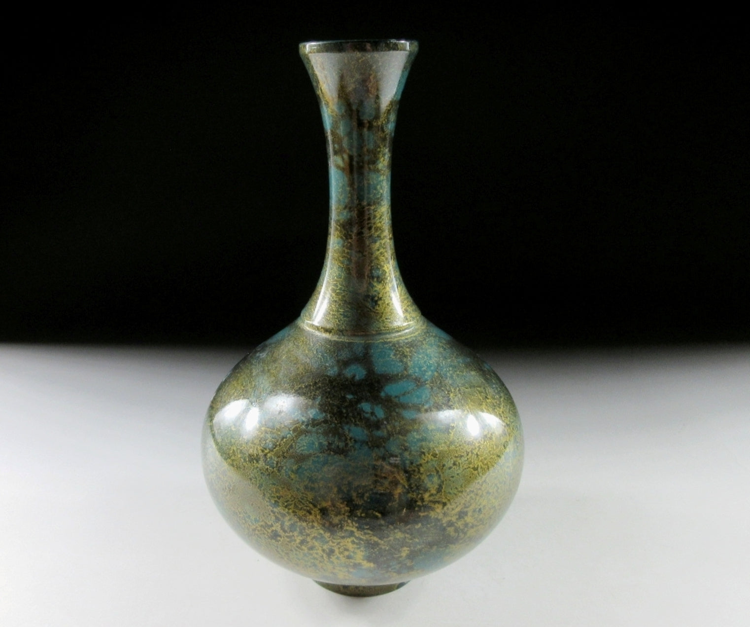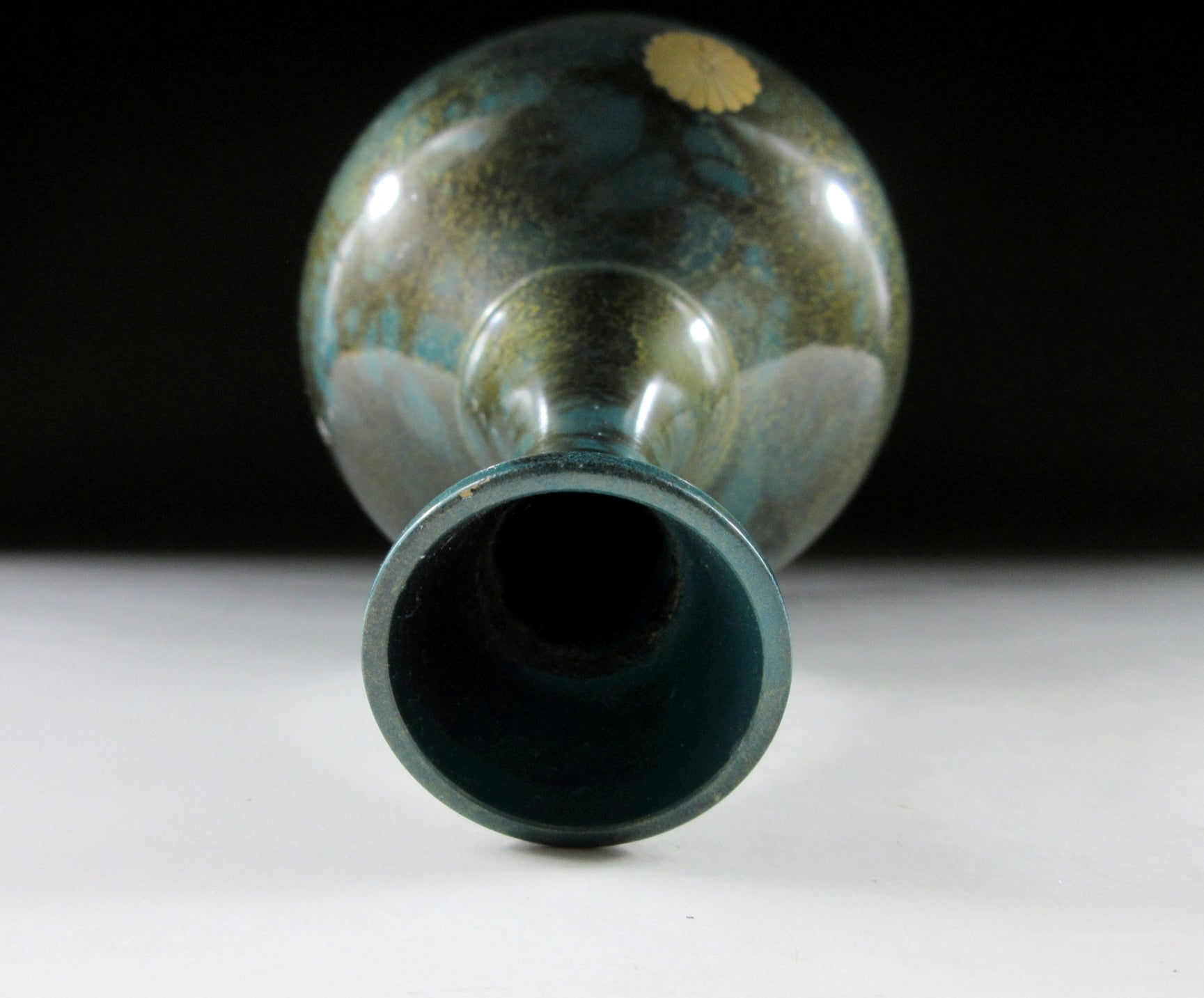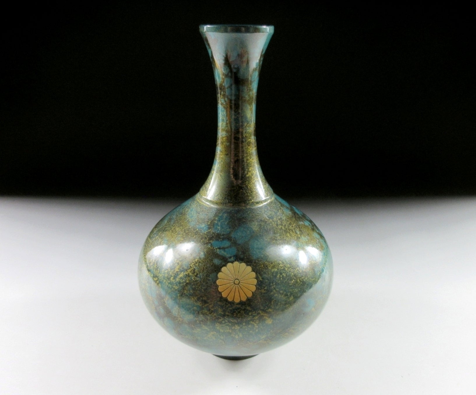 This listing is for a Takaoka copper vase made around 30-40 years ago. It was made using the lost wax process and features a mottled blue-grey-light gold patina. The front is decorated with the Japanese Imperial Chrysanthemum (kiku mon), and the opening is wide enough to accommodate a small arrangement of thin stemmed flowers. Please read below regarding the condition of the vase.