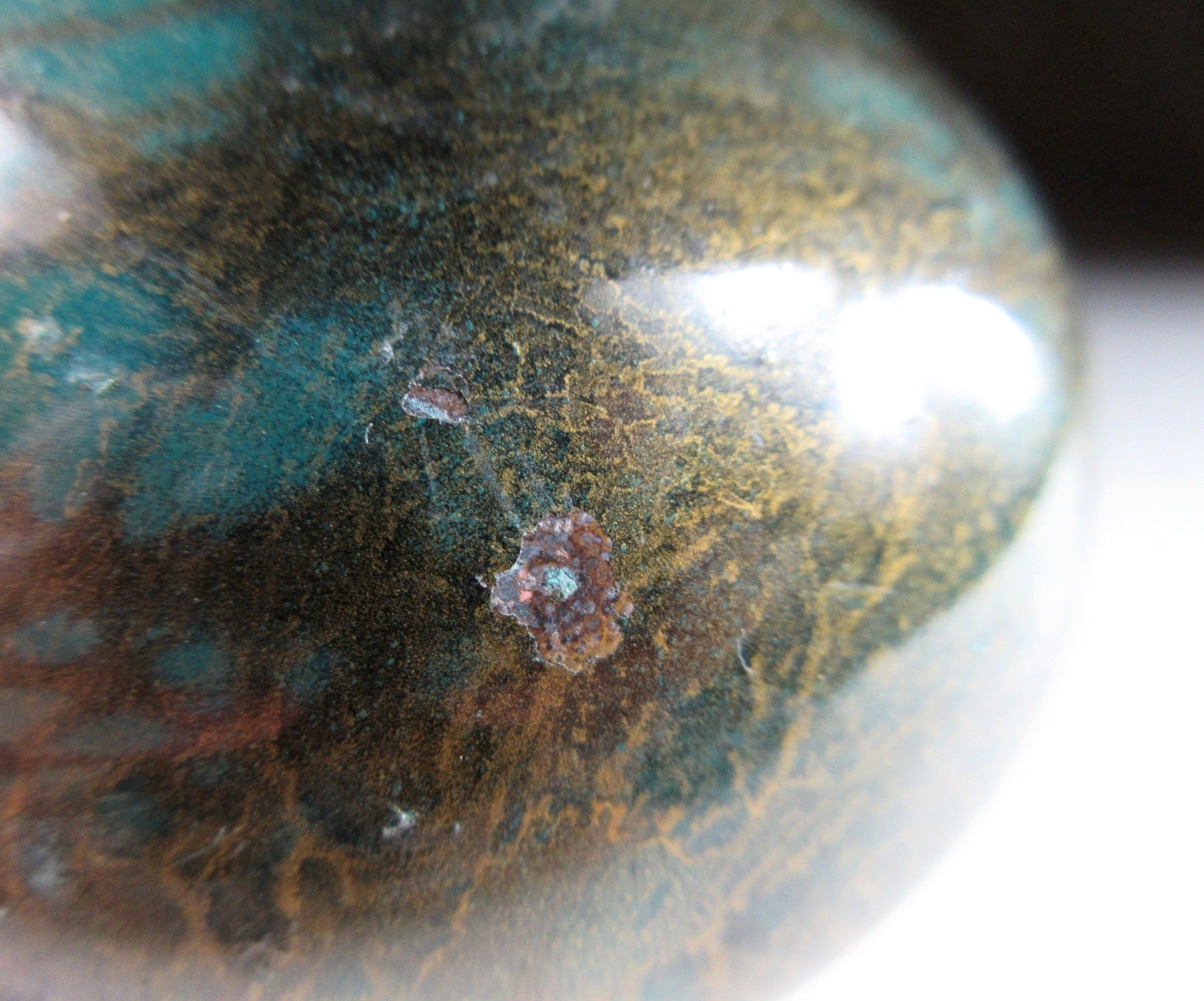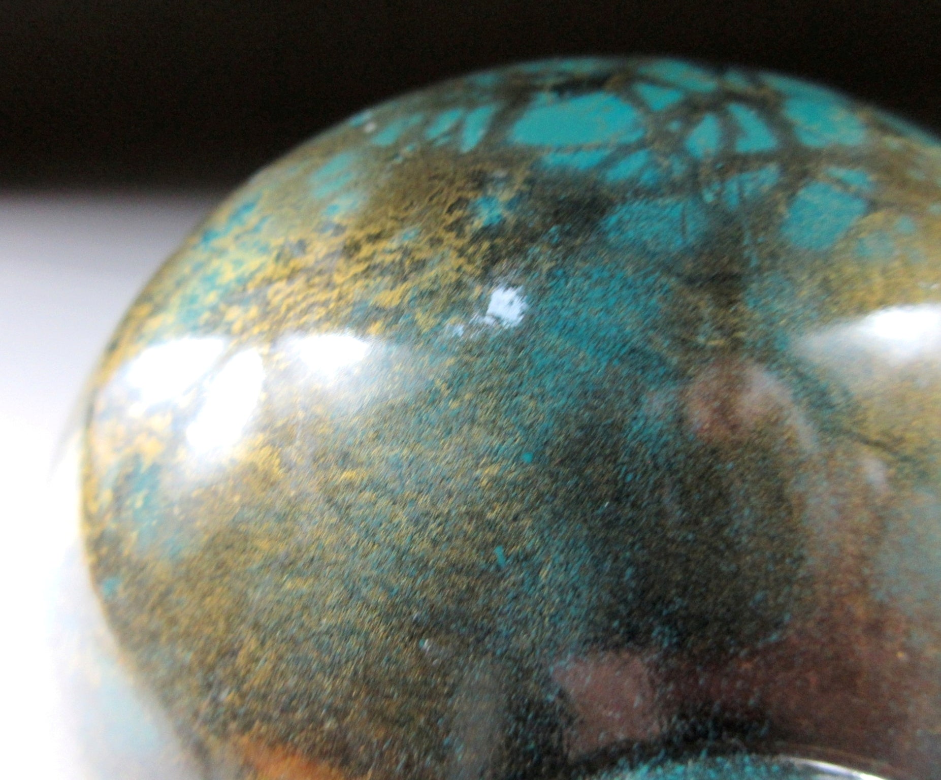 The process of colouring copper involves using a solution of copper sulphate and copper carbonate. First the copperware is allowed to soak in the solution, after that it is heated up gradually. After this process is complete the copper pieces are allowed to cool down, and this is when the colours and mottled patterns appear. Colours range from burnt orange to light gold, brown, and blue-grey. The final stage involves using beeswax to make the surface stronger and to give the wares a glazed appearance.