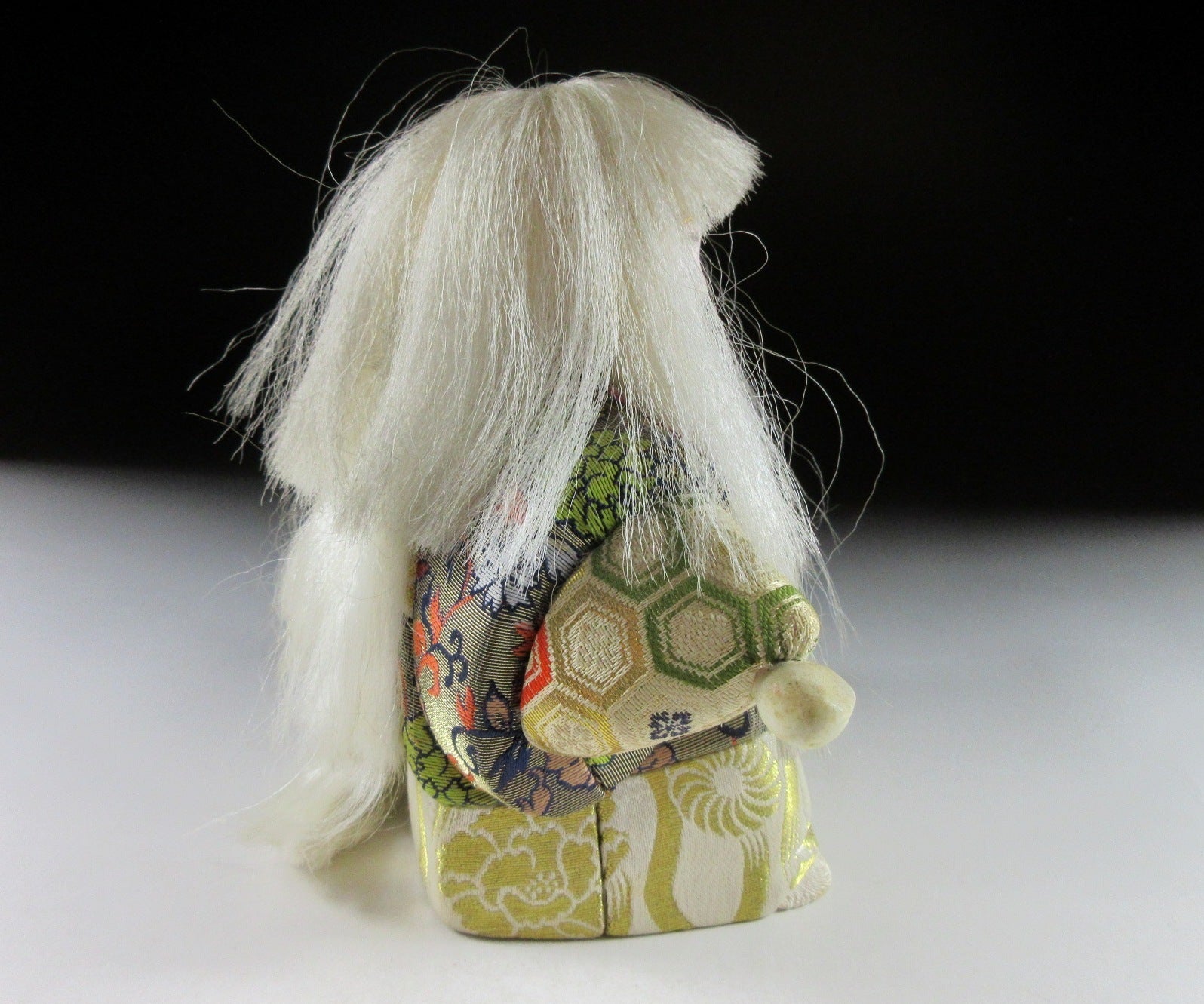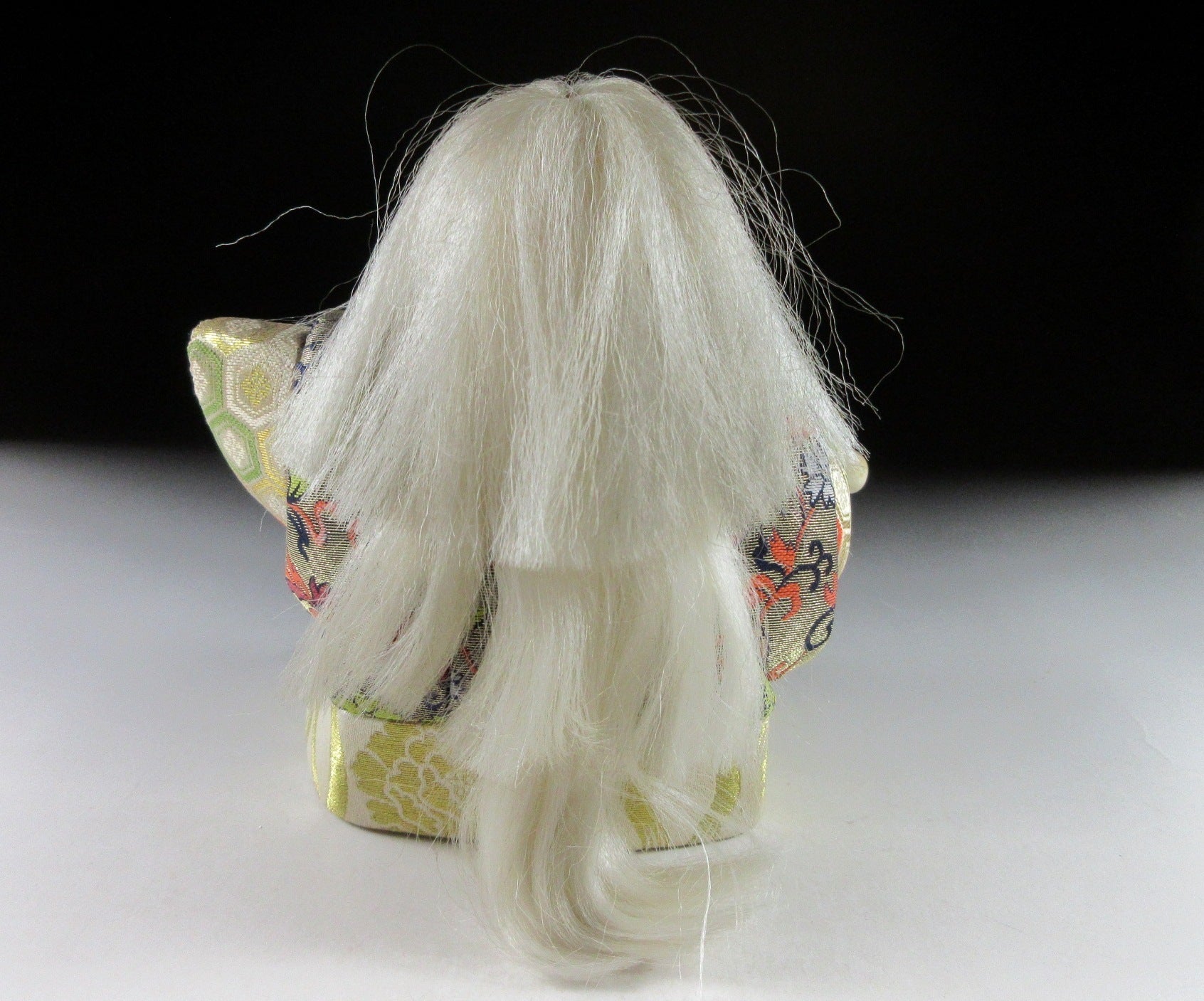 This listing is for a pair of red and white kimekomi lion dancer kabuki dolls made around 20 years ago. The dolls depict a white lion dancing with its red-maned cub. The dance is called 'Renjishi', and it tells the story of father lion (white hair) who decides to test the power and courage of his cub (red hair) by throwing him off a cliff. The cub survives the fall and manages to climb back, and the dance is a celebration of the cub’s achievement. Kimekomi refers to fabric art using a solid base such as wood. The process for making a doll involves several different steps. First the artisan marks lines on the base and carves them to make grooves along the surface. Silk is then cut and tucked into the grooves. The fabric is then pasted into the joints. The final part of the process involves attaching the head of the doll. The face of the doll is painted white with gofun and facial features are added using a fine tipped brush. Hair is often made from silk thread.