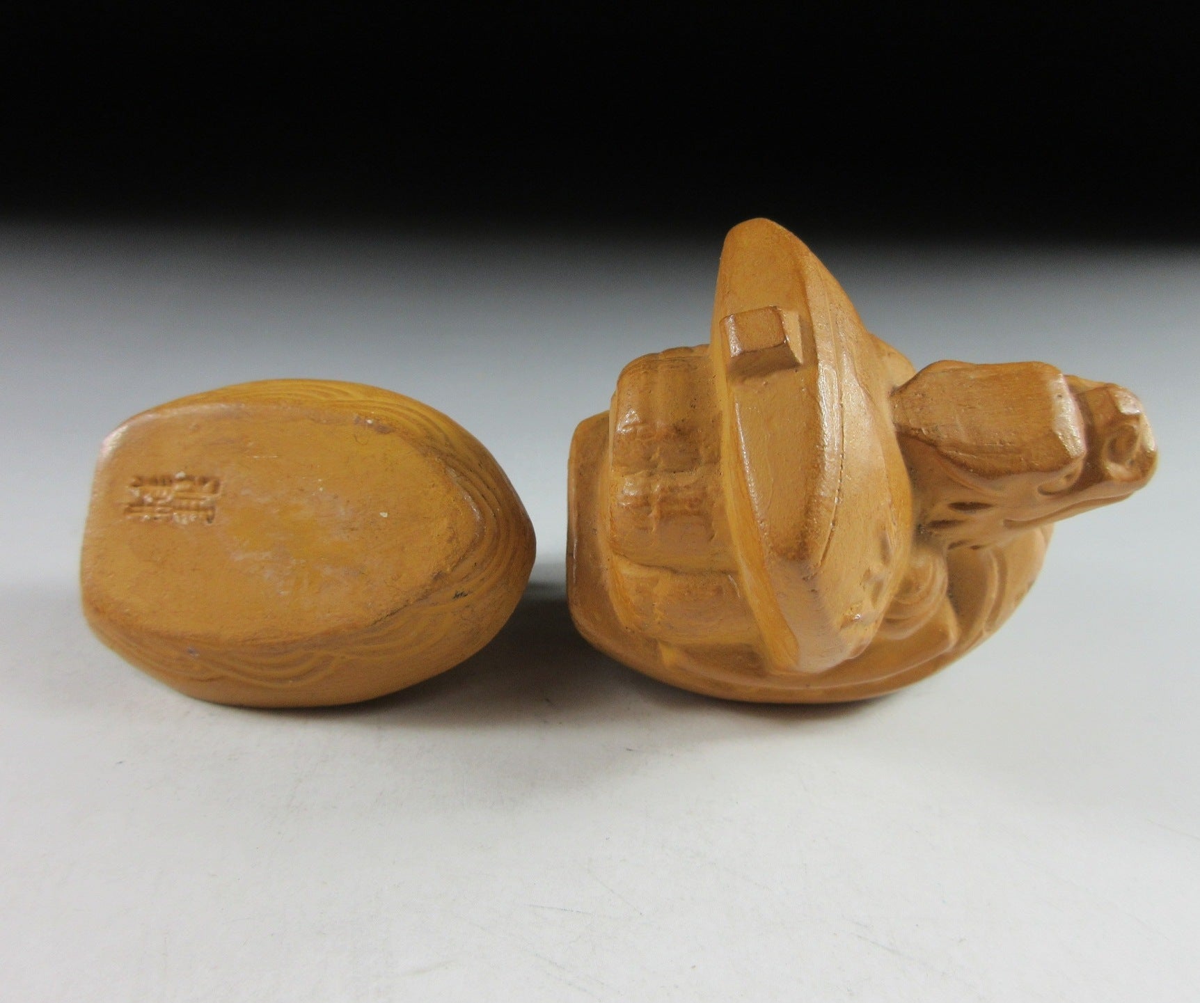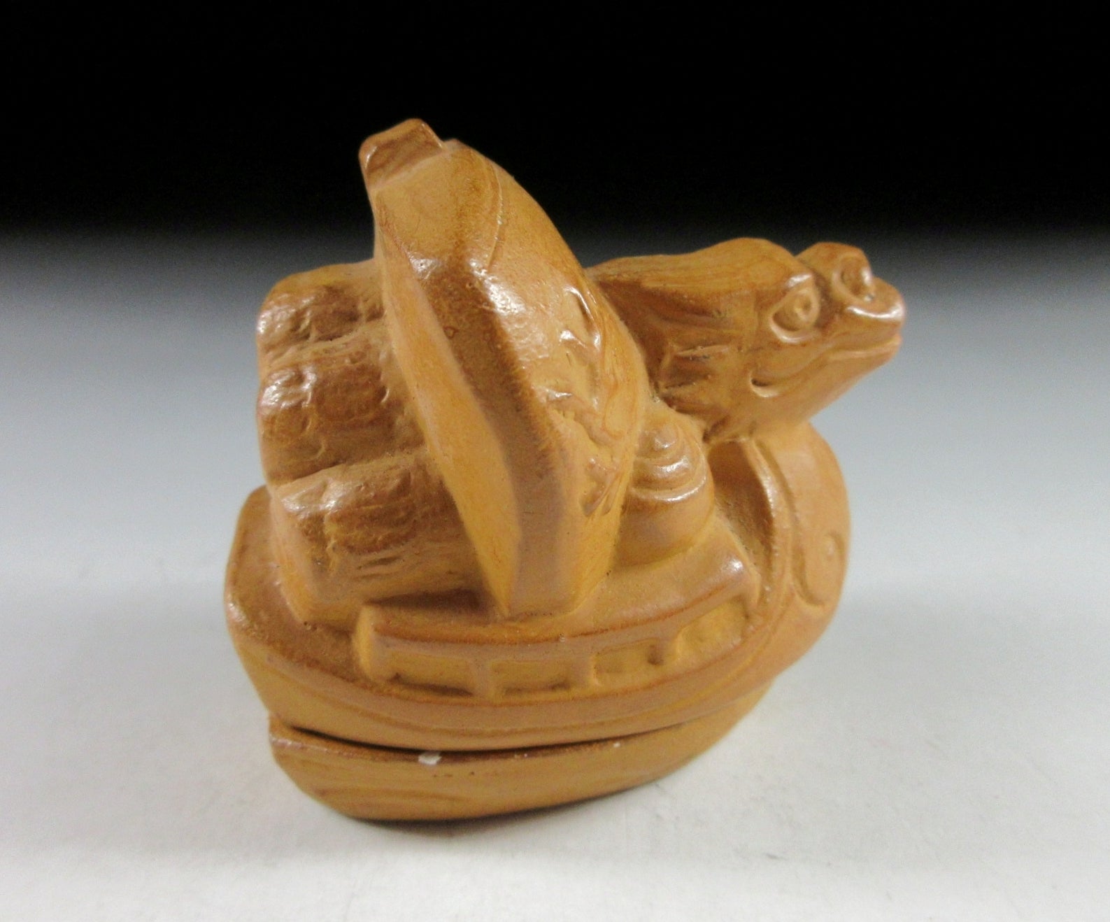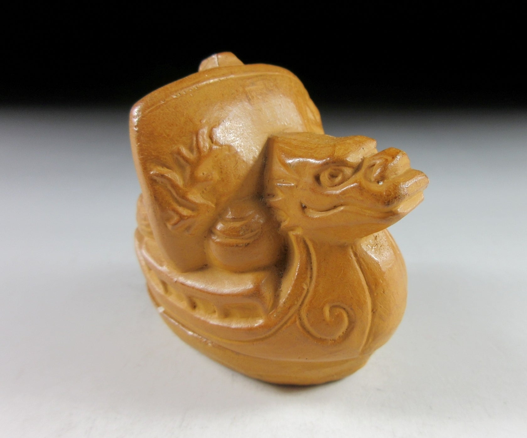 This listing is for a vintage Kyo-ware kogo made around 35 years ago by noted potter, Kitamura Gako. It is made of low fired stoneware and moulded to resemble a dragon ‘takarabune’ treasure ship loaded with rice bales. Takarabune are amulets for good fortune at New Year, and dragons are believed to be gods that rise out of the sea. It is said that the seven gods of fortune make port on New Year’s Eve to spread good fortune and happiness to everyone. Children should place a picture of the gods aboard their ship under their pillow, and if they have a lucky dream they will be lucky for the whole year. The piece was most likely made to commemorate the Year of the Dragon back in 1988. Its size and shape is suitable for holding both woodchip and kneaded incense, although pottery kogo are typically used for kneaded incense during the cooler months. The stamp of the potter can be found on the bottom.