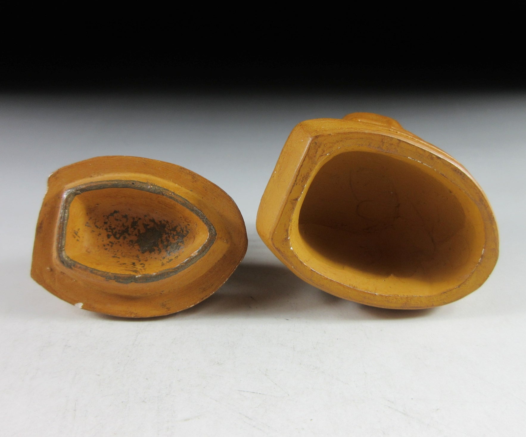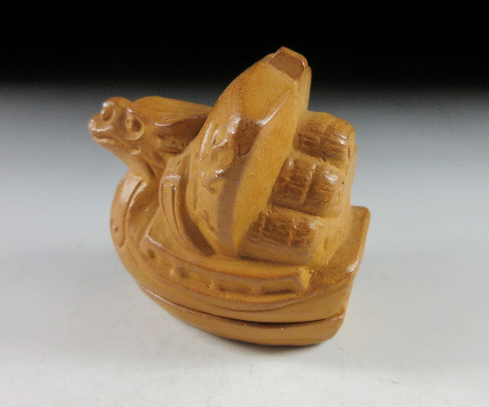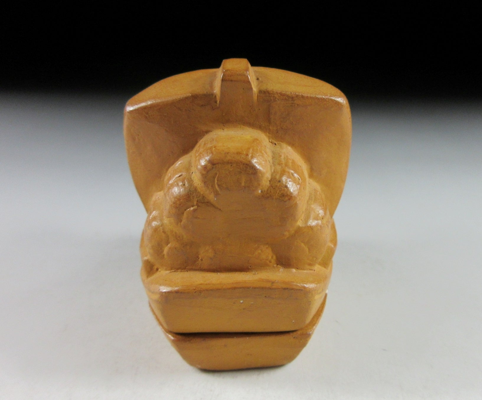 This listing is for a vintage Kyo-ware kogo made around 35 years ago by noted potter, Kitamura Gako. It is made of low fired stoneware and moulded to resemble a dragon ‘takarabune’ treasure ship loaded with rice bales. Takarabune are amulets for good fortune at New Year, and dragons are believed to be gods that rise out of the sea. It is said that the seven gods of fortune make port on New Year’s Eve to spread good fortune and happiness to everyone. Children should place a picture of the gods aboard their ship under their pillow, and if they have a lucky dream they will be lucky for the whole year. The piece was most likely made to commemorate the Year of the Dragon back in 1988. Its size and shape is suitable for holding both woodchip and kneaded incense, although pottery kogo are typically used for kneaded incense during the cooler months. The stamp of the potter can be found on the bottom.