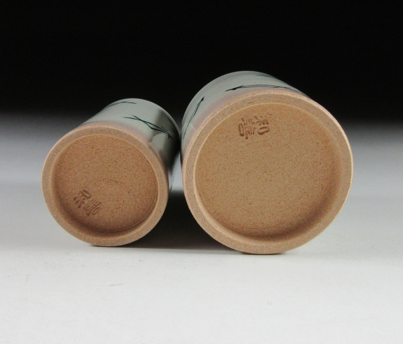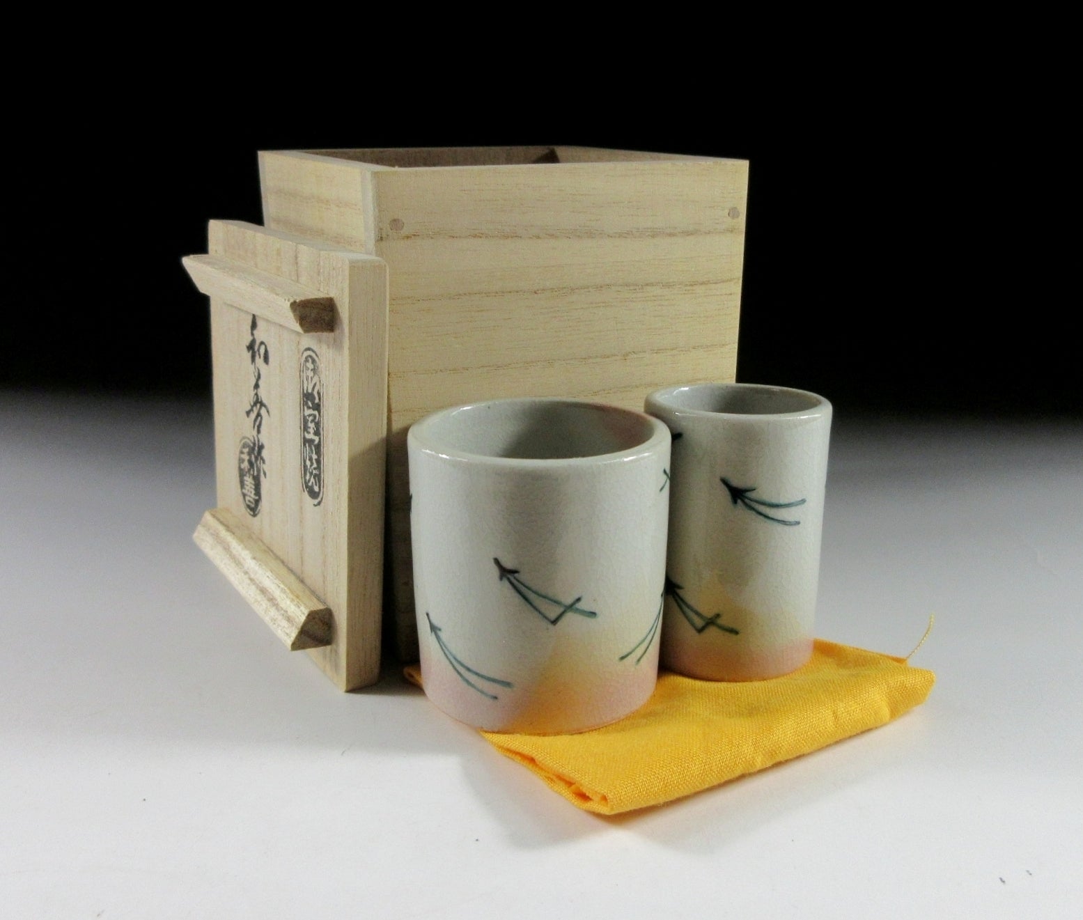 This listing is for an Omuro-ware chakin zutsu and bonkinire set made around 20 years ago by noted potter, Kitamura Wazen IV. A chakin zutsu is a container for chakin, a chakin being a cloth to wipe chawan. These small containers are also referred to as kinto. The bonkinire is larger than a chakin zutsu, and functions as a container to hold a cloth for wiping the tray. Both items are wheel-thrown and decorated with a ‘matsuba’ pine needle pattern. This arrow-like pattern represents the long needles that fall from trees, which symbolize longevity and perseverance. It was a traditional favourite amongst samurai because it was believed to protect the wearer from harm. The stamp of the potter can be found on the bottom of each piece, and they come with their original signed wooden storage box. They also come with a turmeric coloured wrapping cloth for when the items are not in use.