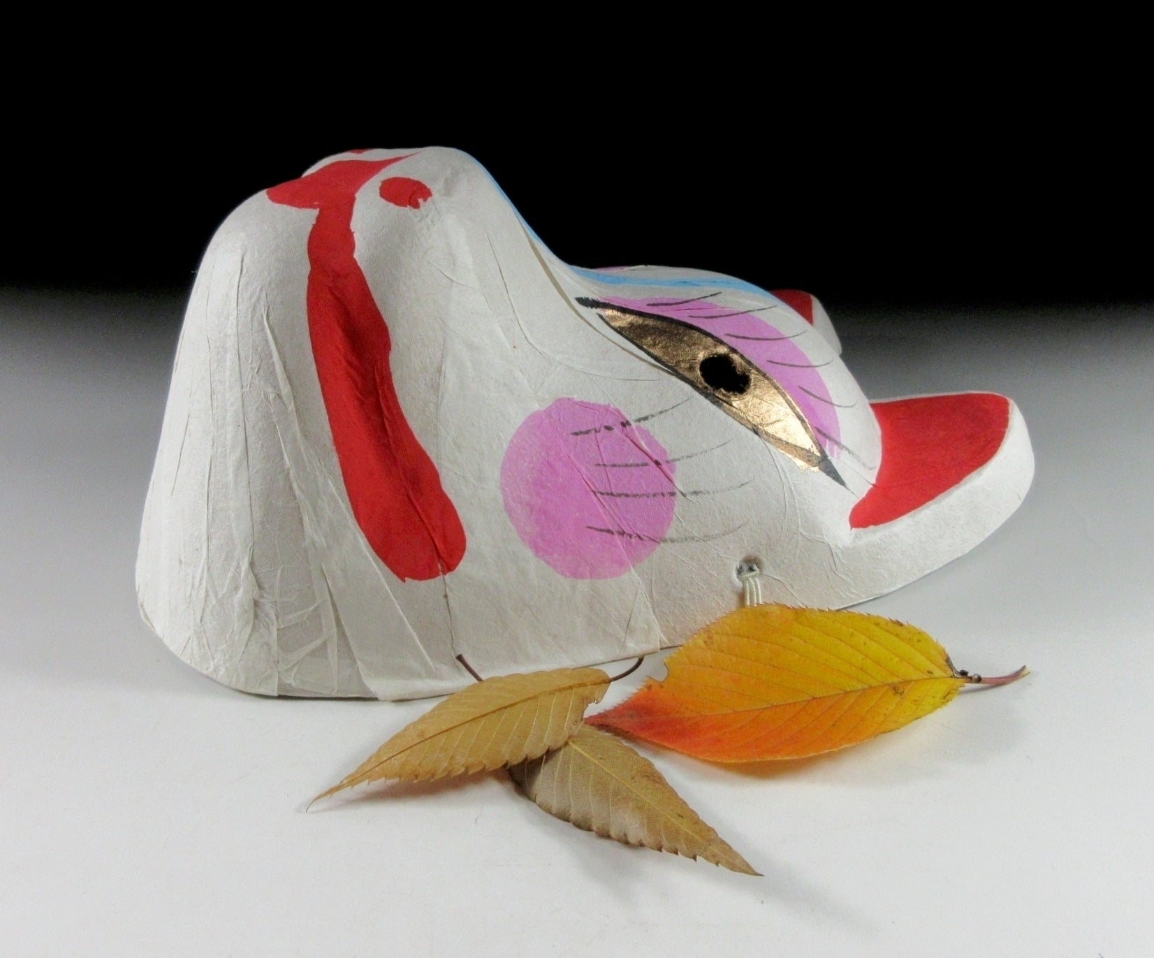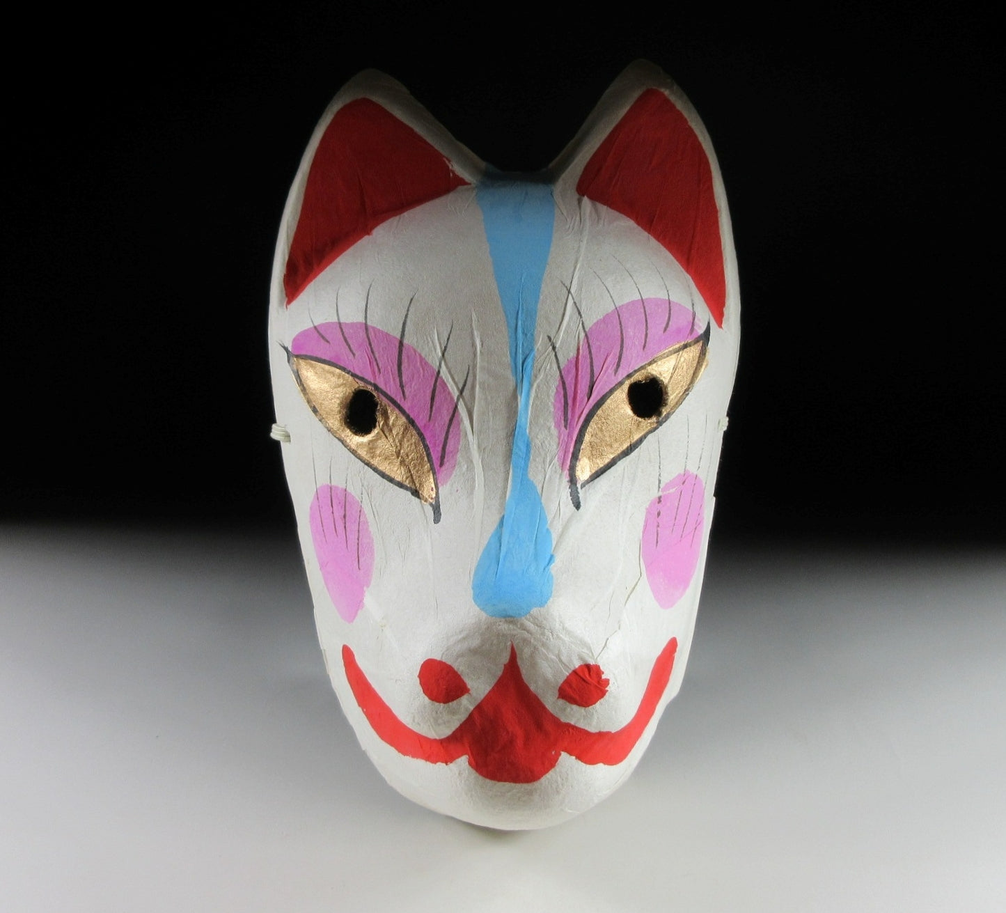 This listing is for a lightweight kitsune mask covered with a thin layer of washi paper. During festivals in Japan it’s possible to see people wearing yukata and kitsune masks, particularly at harvest festivals with Shinto origins. Kitsune are believed to be messengers of Inari, the Shinto god associated with agriculture and protector of rice. Also visitors at popular tourist spots like Kyoto and Kawagoe can purchase masks and wear them just for fun. The mask in this listing was purchased as a souvenir and never worn. It can be worn or displayed on a wall, it’s basically in mint condition.