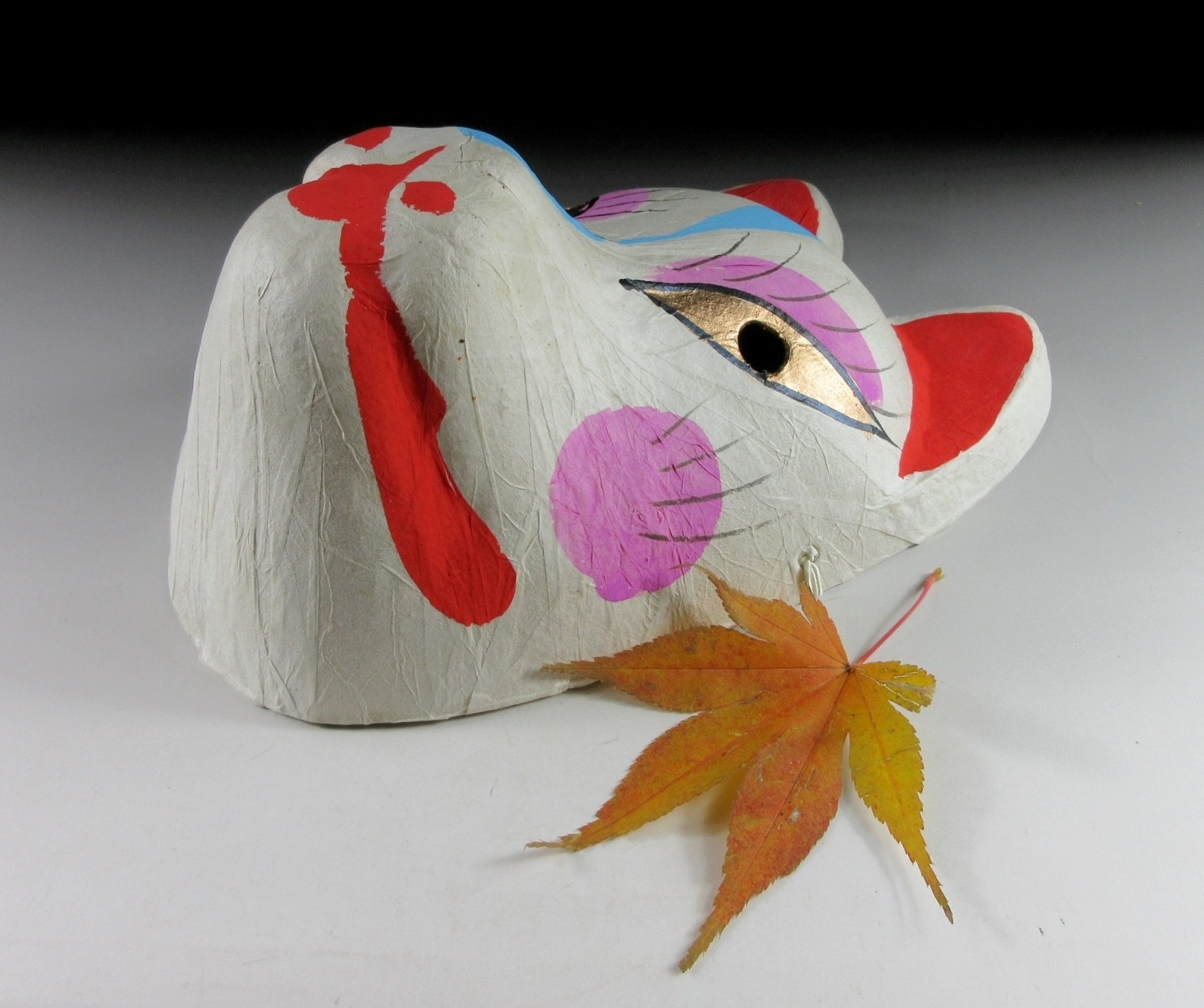 This listing is for a lightweight kitsune mask covered with a thin layer of washi paper. During festivals in Japan it’s possible to see people wearing yukata and kitsune masks, particularly at harvest festivals with Shinto origins. Kitsune are believed to be messengers of Inari, the Shinto god associated with agriculture and protector of rice. Also visitors at popular tourist spots like Kyoto and Kawagoe can purchase masks and wear them just for fun. The mask in this listing was purchased as a souvenir and never worn. It can be worn or displayed on a wall, it’s basically in mint condition.
