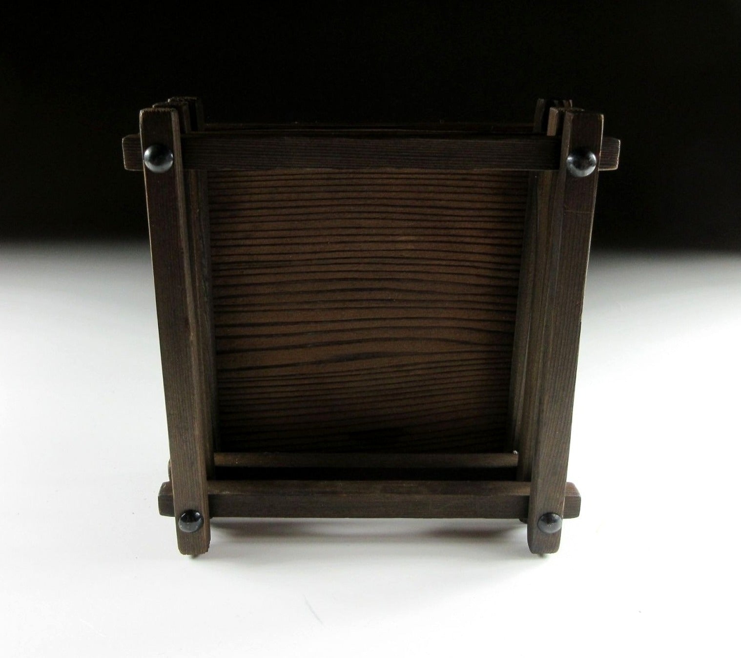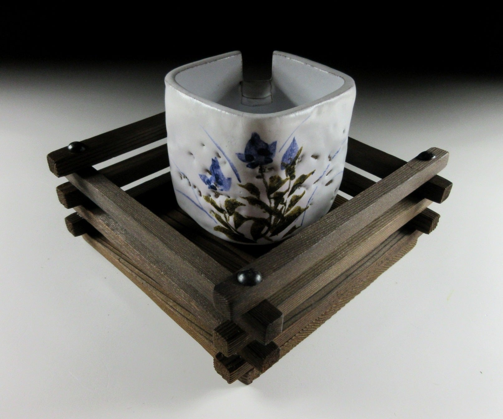 This listing is for a Kiyomizu-ware ashtray made around 20 years ago. It is wheel-thrown and the front is decorated with hand-painted bell flowers over thick white glaze. Bell flowers are one of the traditional seven flowers of autumn often depicted in haiku, kimono and scrolls. Ogata Kenzan, one of the greatest potters of the Tokugawa era, used this motif to decorate tea ware and tableware, and it’s still a very popular style of decoration today. This piece also comes with a small wooden crate which can be used to hold the ashtray, cigarettes, and a lighter. It comes with its original paper storage box.