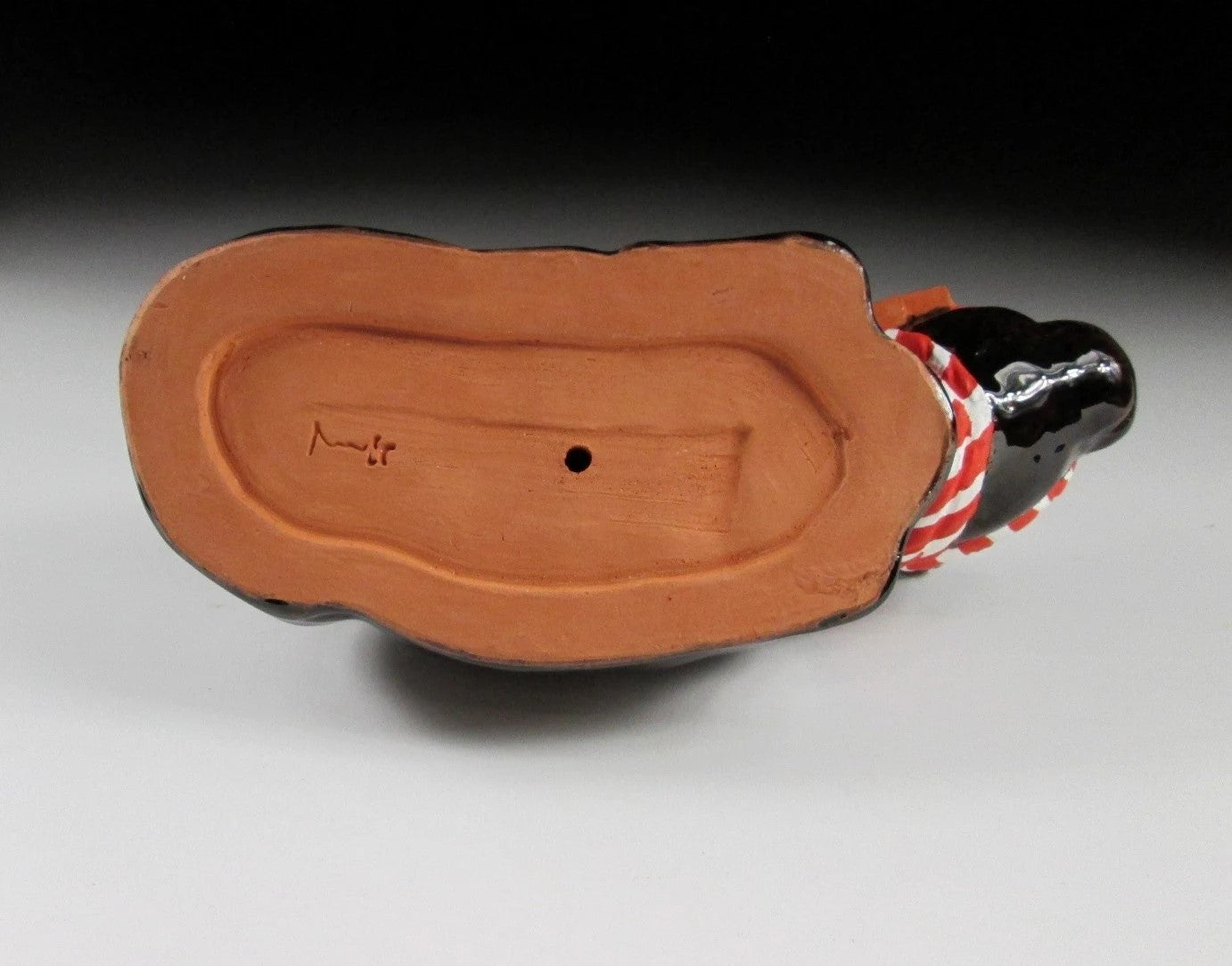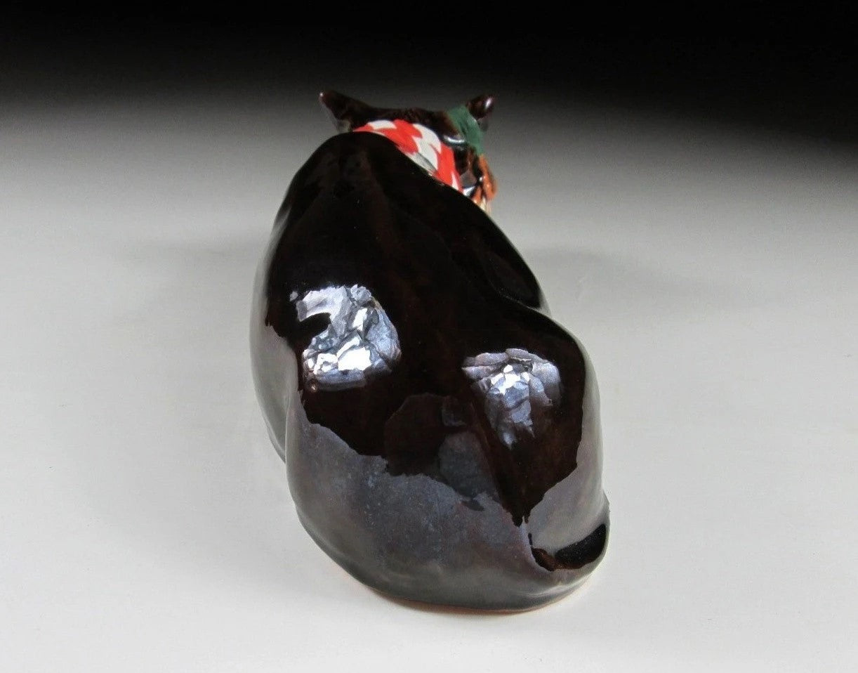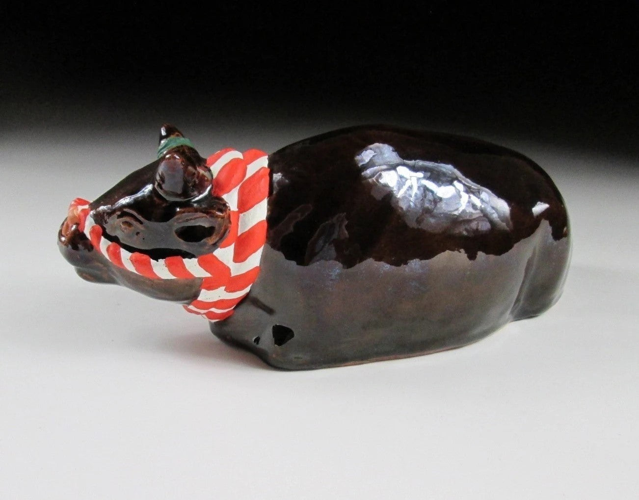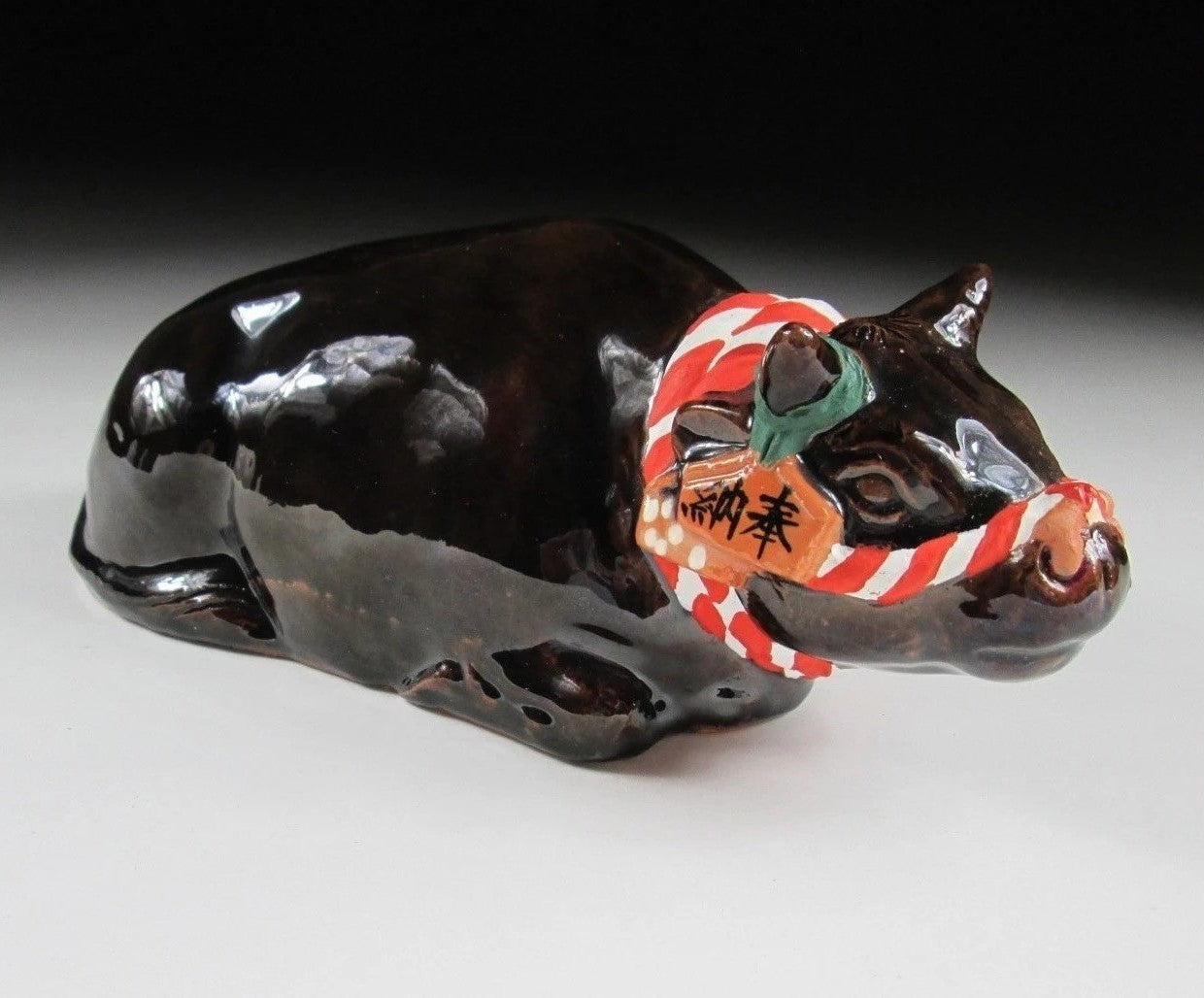 This listing is for an ox okimono made by the highly regarded and very well-known Rokubei kiln in Kyoto. This piece was made to commemorate the Year of the Ox back in 1993. The signature of the kiln can be found on the bottom, and it comes complete with the original signed wooden box. It also comes with a signed yellow wrapping cloth, as well as Japanese information about this particular item.