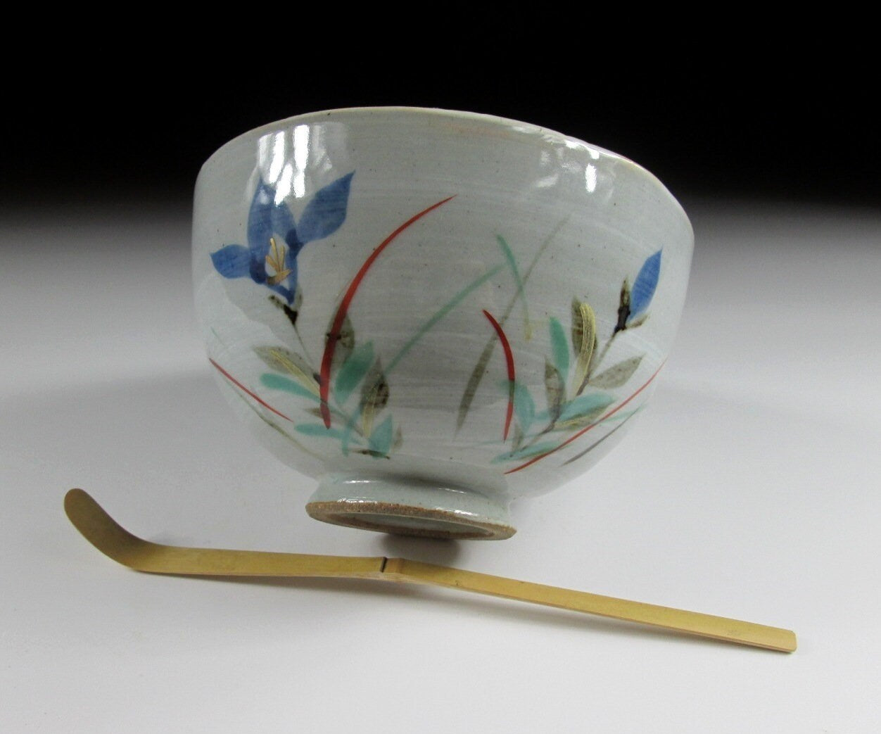 This listing is for a Kiyomizu-ware chawan made around 20-30 years ago and signed ‘Yorozu’. It is wheel-thrown and decorated with hand-painted bellflowers. Bellflowers are one of the seven flowers of autumn, and they’re often used to decorate textiles, scrolls and tableware. The official seven flowers of autumn are bush clover, pampas grass, Japanese arrowroot, dianthus, golden lace, hemp agrimony, and the Japanese bellflower. These seasonal favourites have been popular since the latter half of the eighth century when a collection of waka poems known as Manyo-shu were compiled by a waka poet named Yamanoue-no-Okura. The interior is also decorated with a small bellflower, and the bowl has a pleasant and easy to hold shape. This piece is perfect for autumn. *PLEASE NOTE THAT THE CHASHAKU TEA SCOOPS ARE NOT INCLUDED.