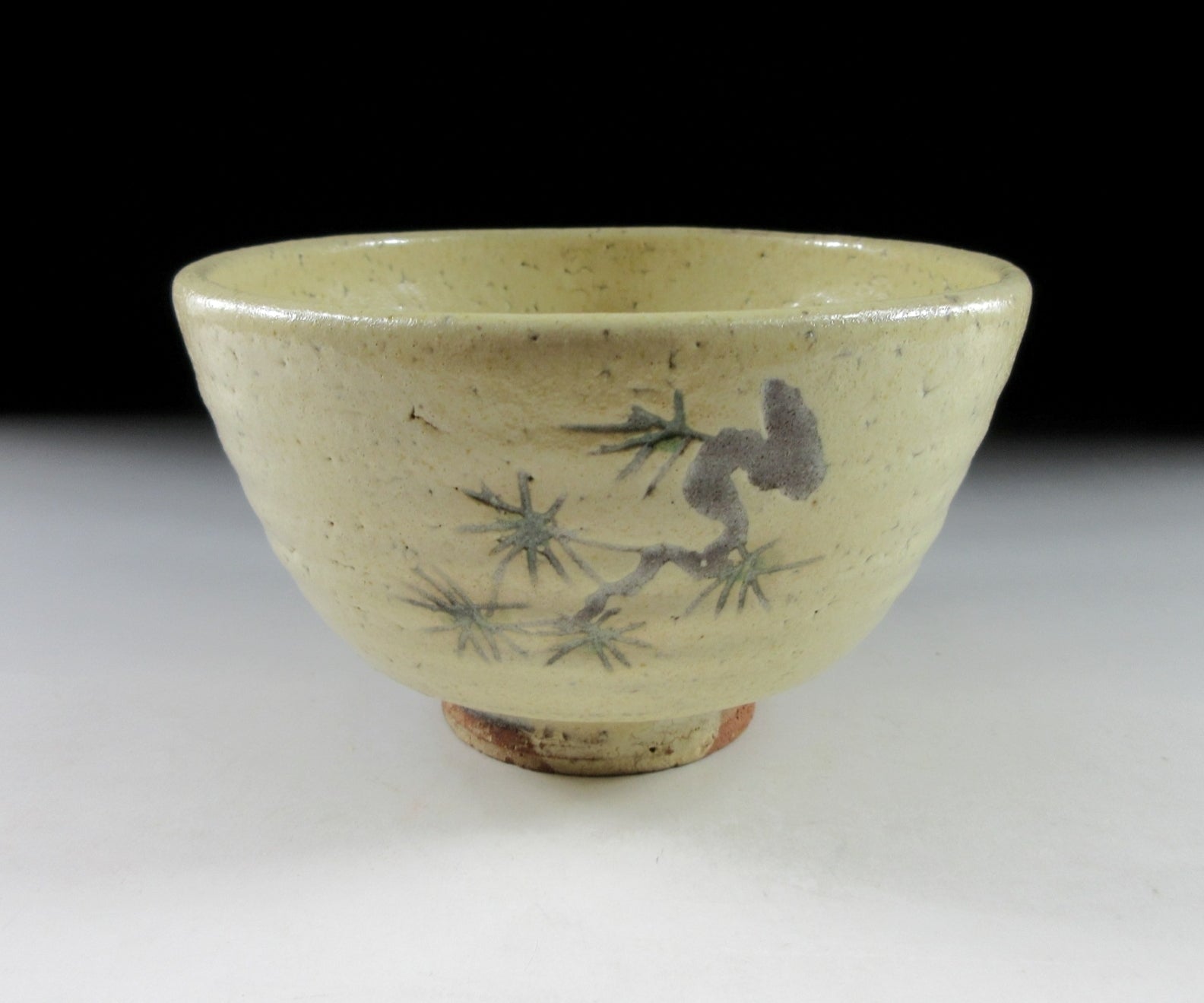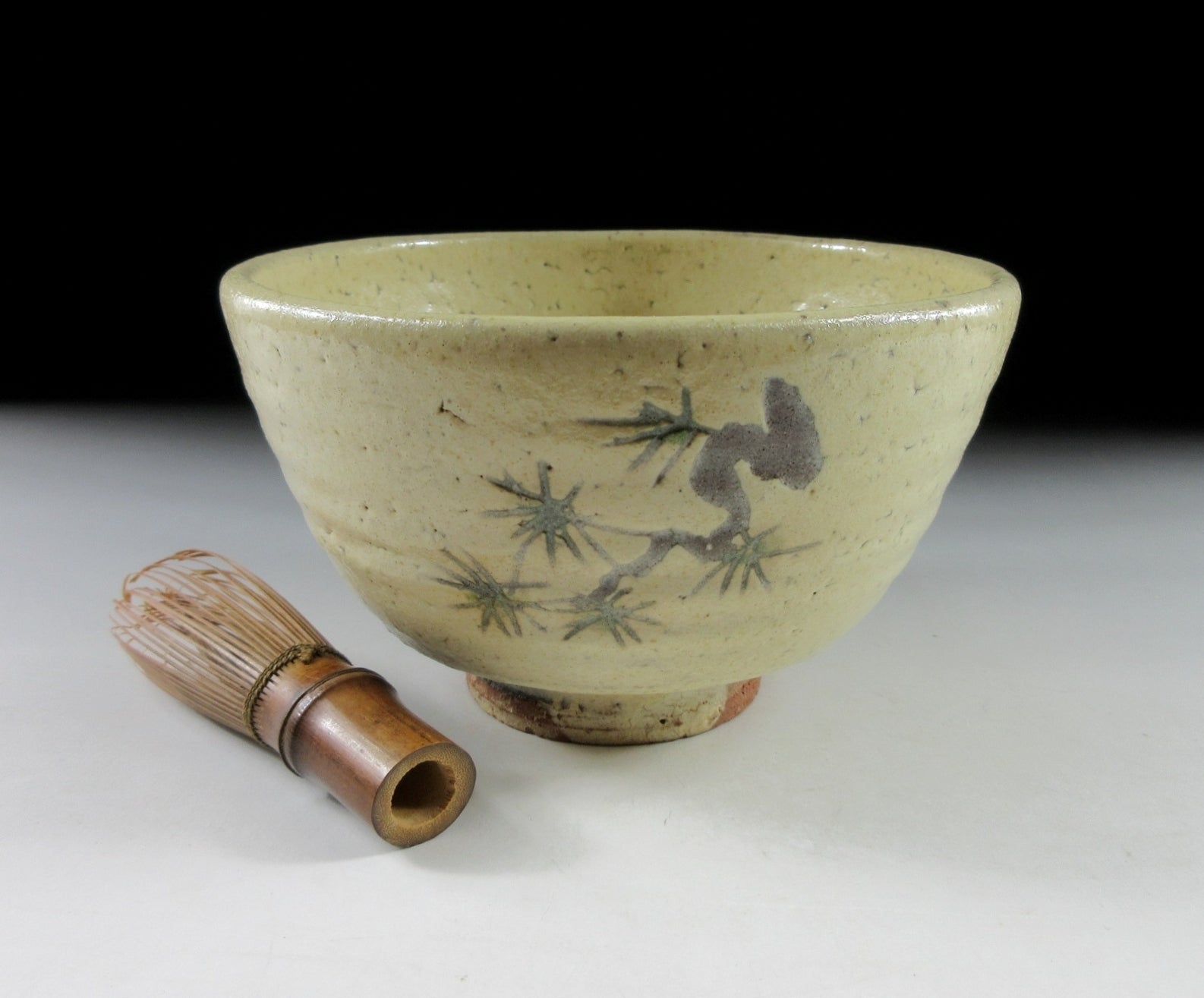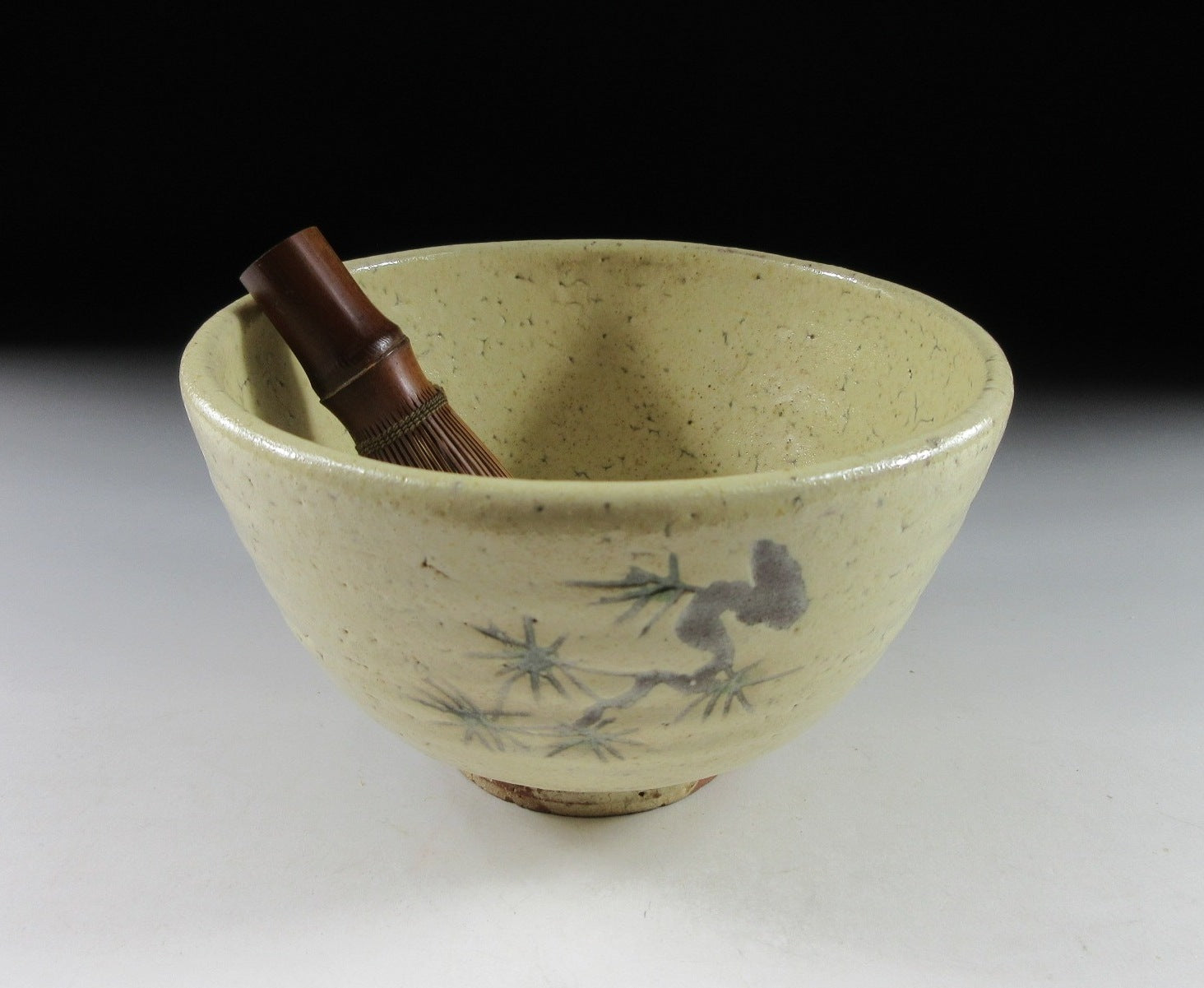 This listing is for a Kiyomizu-ware chawan made around 20 years ago. It is wheel-thrown and coated in cream coloured slip, and the front is decorated with a matsu pine motif. Pine is a popular motif because it is one of the three friends of winter. Matsu pine, ume and bamboo are admired in both Japan and China as they do not wither against the cold of winter. All three plants are regarded as auspicious and are believed to symbolise endurance and strength. The stamp of the potter can be found on the base, sorry but its glazed over and impossible to decipher. *PLEASE NOTE THAT THE CHASEN TEA WHISK IS NOT INCLUDED.