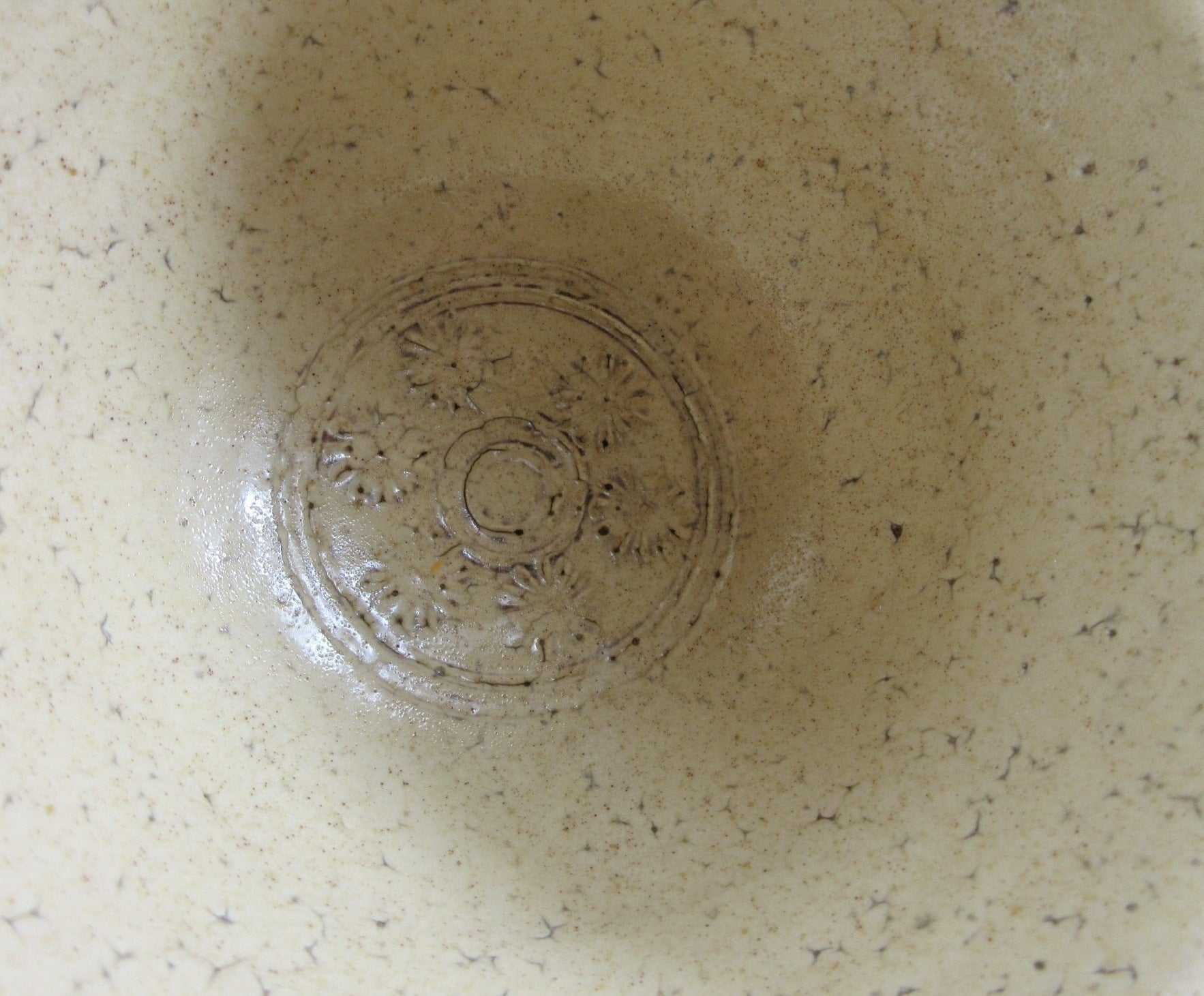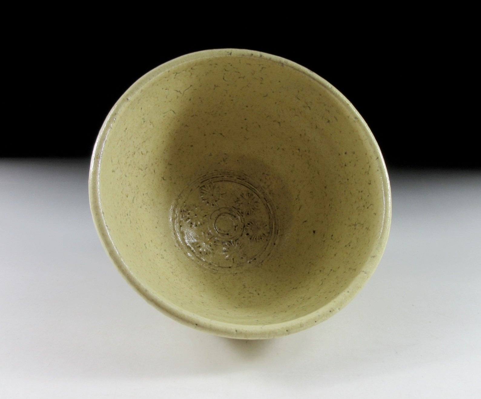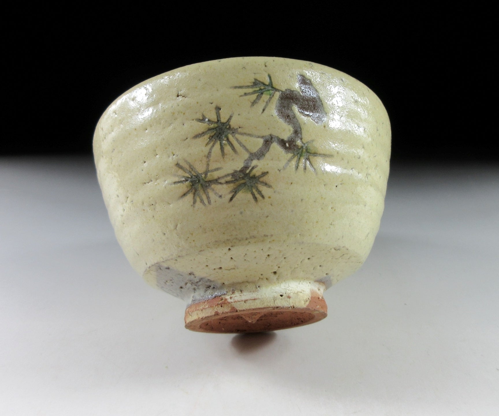 This listing is for a Kiyomizu-ware chawan made around 20 years ago. It is wheel-thrown and coated in cream coloured slip, and the front is decorated with a matsu pine motif. Pine is a popular motif because it is one of the three friends of winter. Matsu pine, ume and bamboo are admired in both Japan and China as they do not wither against the cold of winter. All three plants are regarded as auspicious and are believed to symbolise endurance and strength. The stamp of the potter can be found on the base, sorry but its glazed over and impossible to decipher. *PLEASE NOTE THAT THE CHASEN TEA WHISK IS NOT INCLUDED.