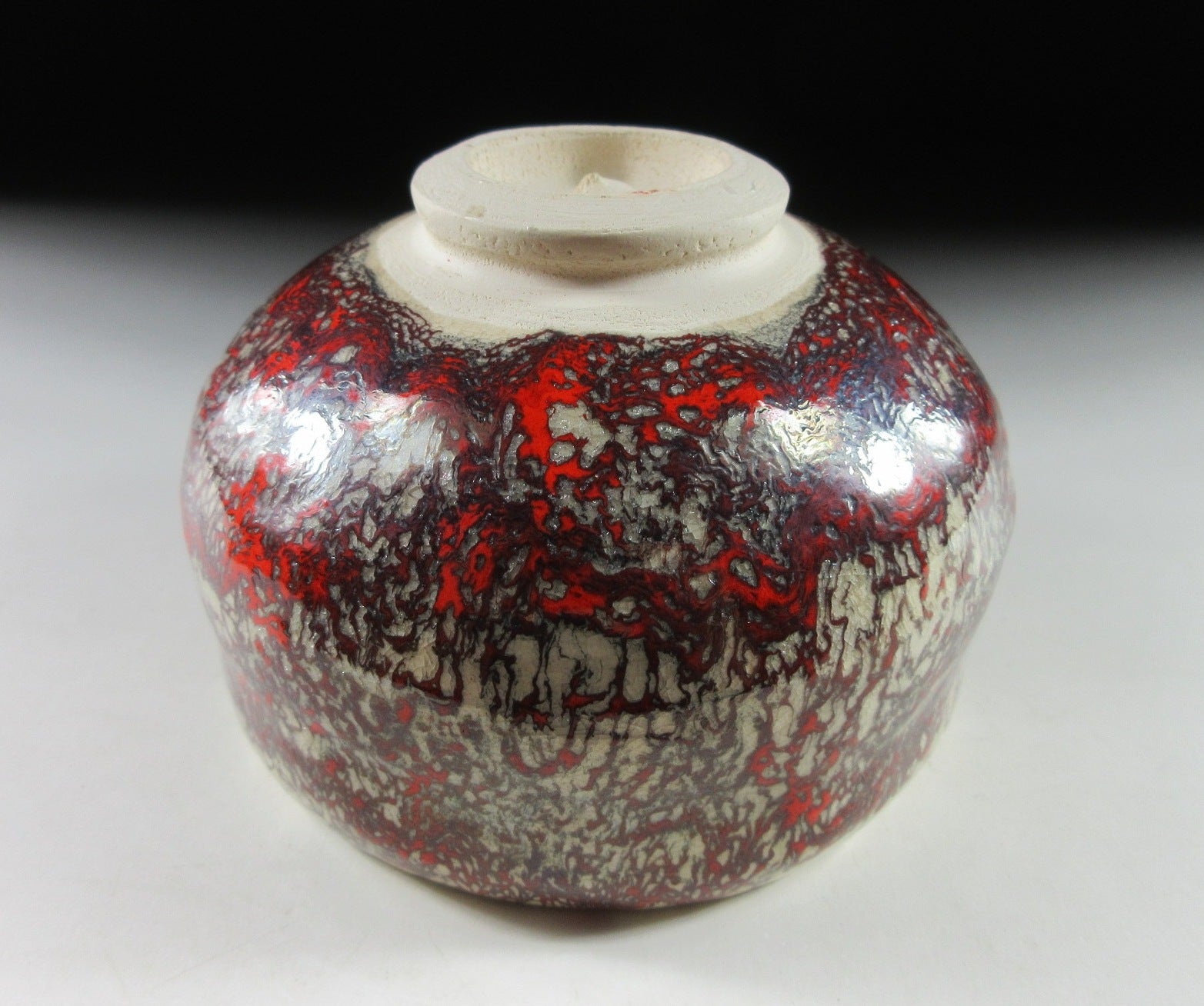 This listing is for a superb Minoo-ware chawan made by the second generation master of Minoo-ware, Kizan II. It features a dramatic combination of red and white glaze over a solid, hand-turned body. This piece has thick walls and a nice clean interior. The stamp of the potter can be found on the bottom, and it comes with its original signed wooden storage box. It also comes with a turmeric coloured wrapping cloth for when the item is not in use, as well as a Japanese language profile about the potter.