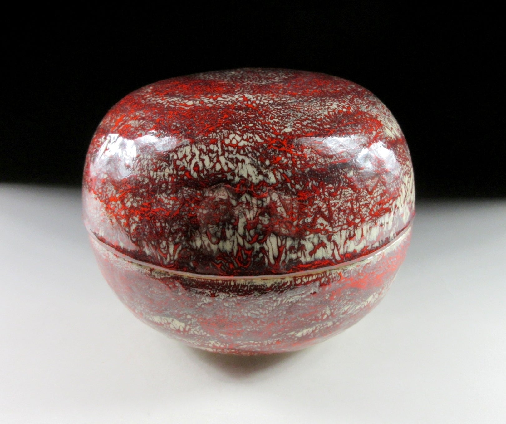 This listing is for a Minoo-ware jikiro made around 30 years ago by Kizan II. A jikiro is a lidded food container shaped like a bowl. Jikiro were imported from China during the Ming dynasty to the Ryukyu kingdom in Okinawa, and later made their way to the mainland during the Kamakura period. Gradually the lacquered and bamboo types began to be used for serving sweets at tea ceremonies. The jikiro in this listing is decorated with mottled red and white glaze over a stoneware base. The stamp of the potter can be found on the bottom and it comes with its original paper storage box. It also comes with two Japanese language profile papers about the Minoo-ware and the potter.