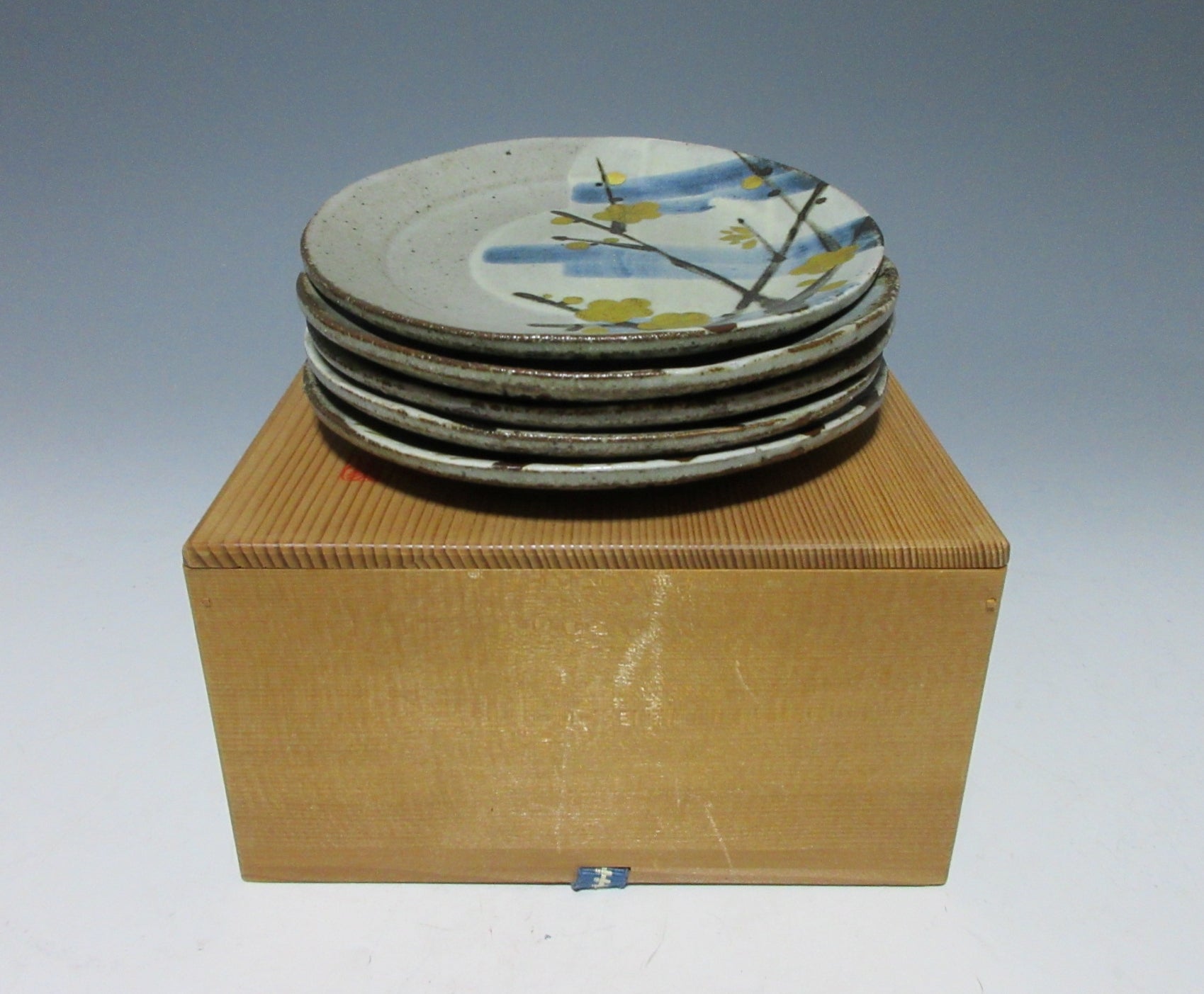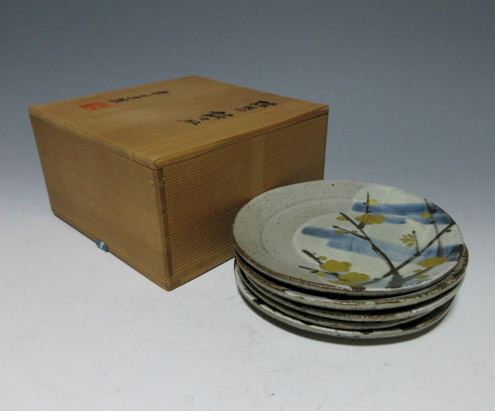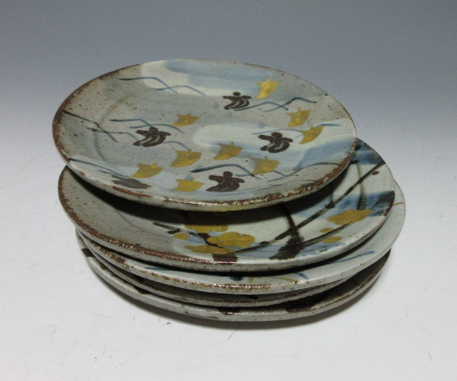 This listing is for a set of five Mino-ware plates made around 30 years ago by Kobei Gama. They are made of high-fired stoneware and each plate is decorated with a different pattern – ume blossoms, ‘debune’ departing ships, double mugwort, flowing water and autumn grass. These patterns are copies of work produced by Ogata Kenzan (1663-1743) during the Edo period. This is a lovely set for any season and perfect for serving sweets. The signature of the kiln can be found on the bottom of each plate, and they come with their original signed wooden storage box. SCROLL TO THE BOTTOM OF THIS LISTING FOR SHIPPING UPGRADE INFORMATION.