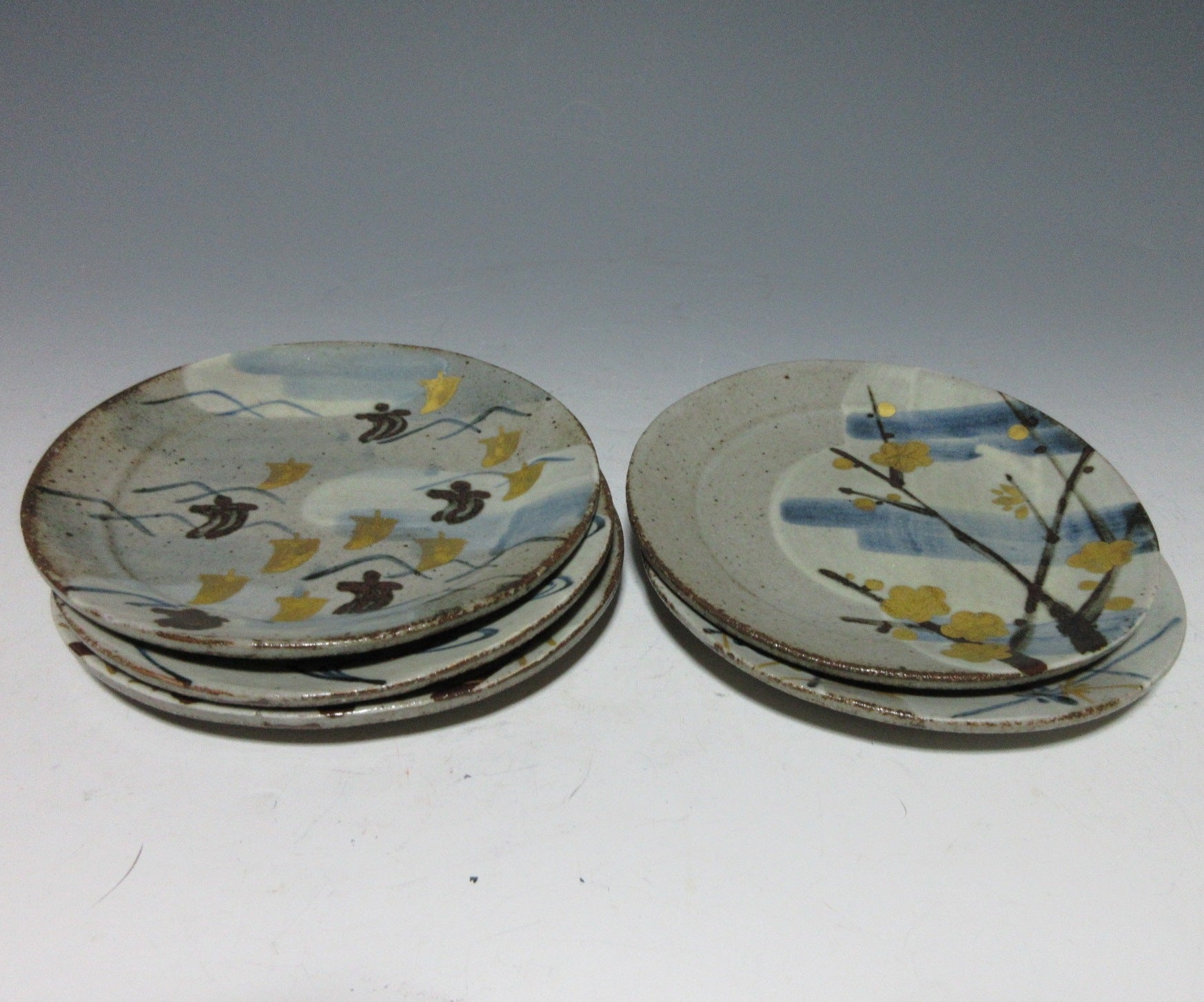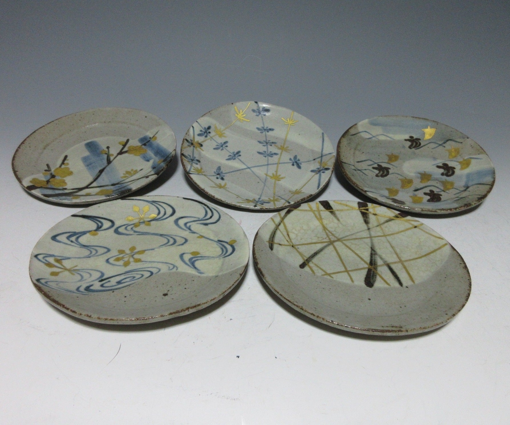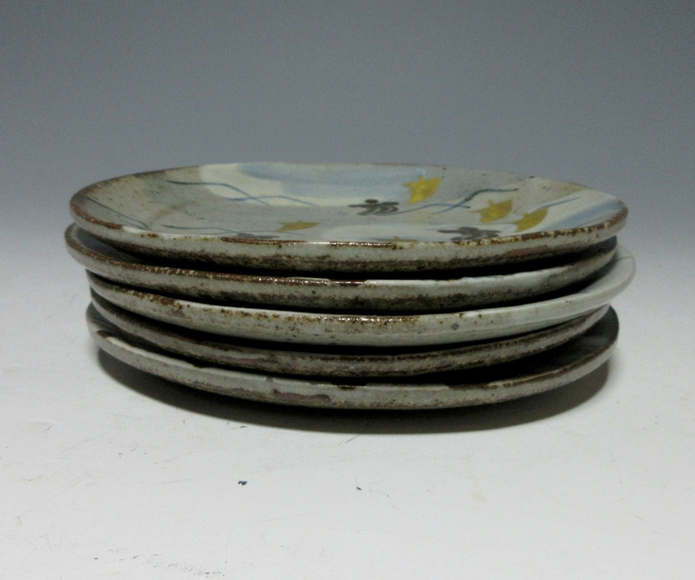 This listing is for a set of five Mino-ware plates made around 30 years ago by Kobei Gama. They are made of high-fired stoneware and each plate is decorated with a different pattern – ume blossoms, ‘debune’ departing ships, double mugwort, flowing water and autumn grass. These patterns are copies of work produced by Ogata Kenzan (1663-1743) during the Edo period. This is a lovely set for any season and perfect for serving sweets. The signature of the kiln can be found on the bottom of each plate, and they come with their original signed wooden storage box. SCROLL TO THE BOTTOM OF THIS LISTING FOR SHIPPING UPGRADE INFORMATION.