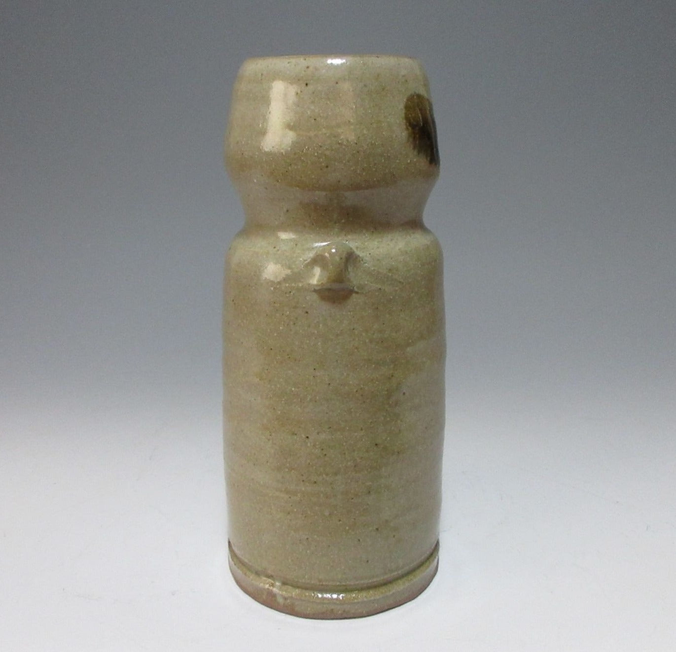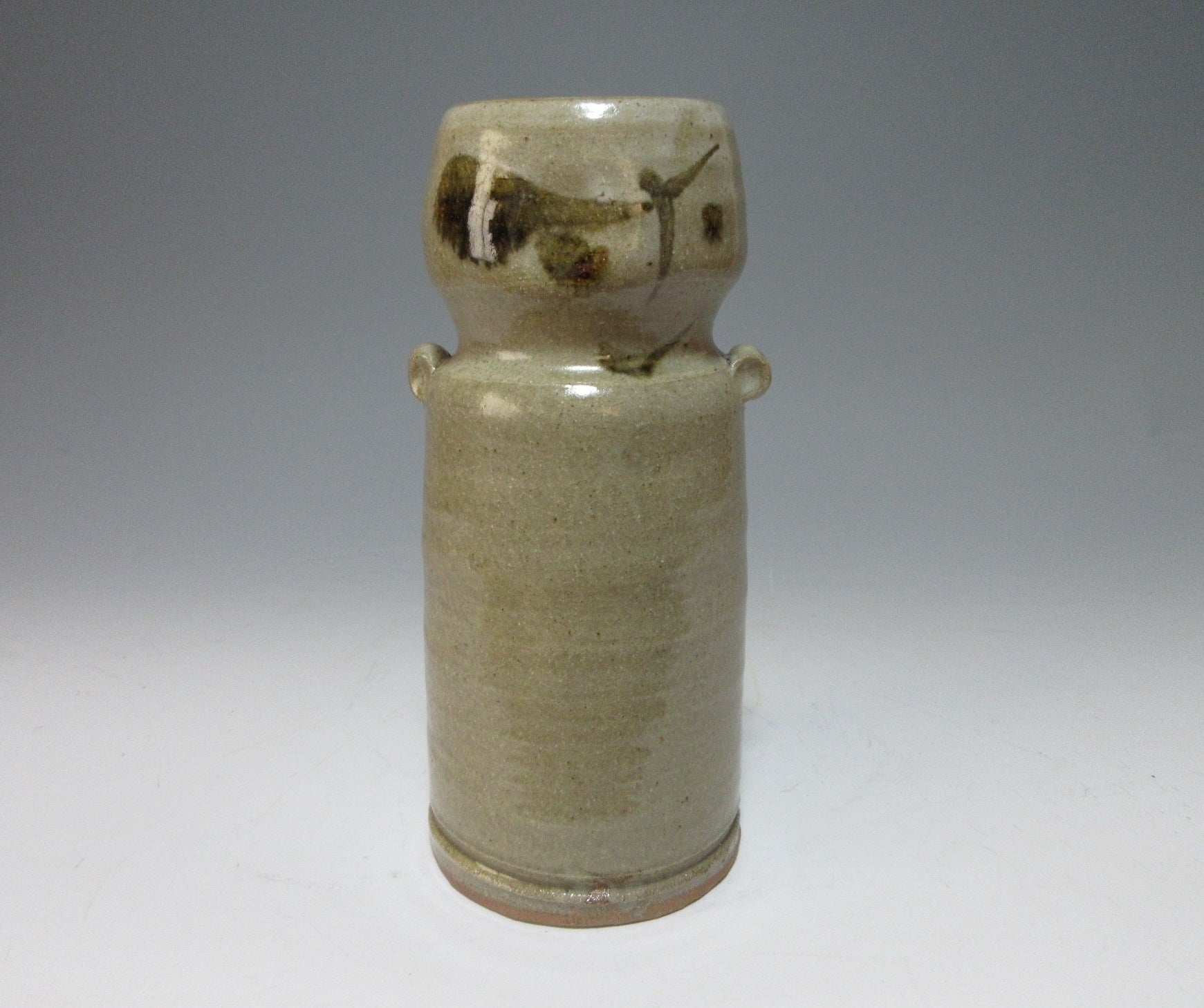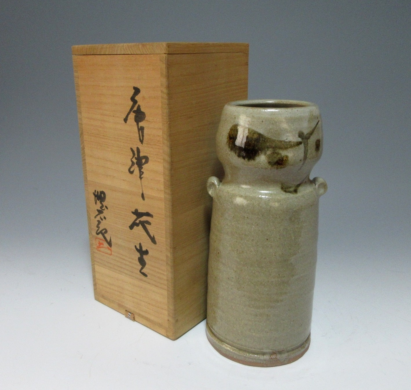 This listing is for a vintage vase made around 30 years ago by noted potter, Kojima Keitaro. It is wheel thrown and made of high-fired stoneware clay. The front is decorated with black slip markings over rice husk glaze, and there are two small ‘mimi’ handles on the shoulders. Its shape is influenced by Bizen-ware, and this piece has a quiet and unassuming appearance. This particular vase is intended for displaying flowers in a tearoom, although dried flowers or one or two large flowers like proteas would also be suitable. The signature of the potter can be found on the bottom, and it comes with its original signed wooden storage box. It also comes with a turmeric coloured wrapping coth for when the item is not in use, as well as a Japanese language profile paper about the potter.