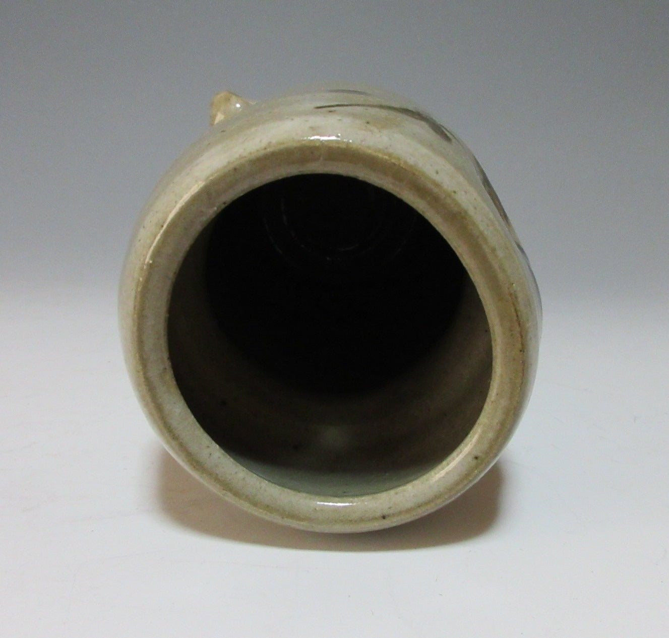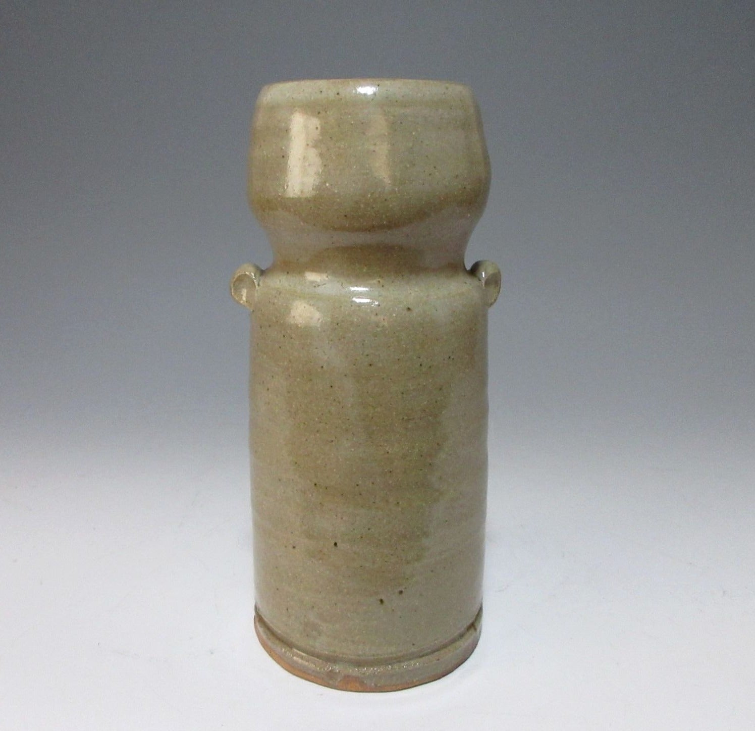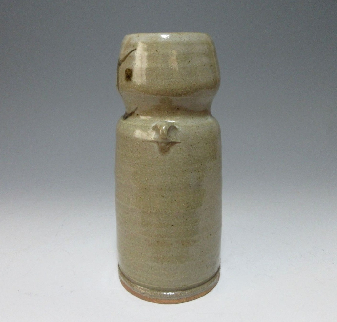 This listing is for a vintage vase made around 30 years ago by noted potter, Kojima Keitaro. It is wheel thrown and made of high-fired stoneware clay. The front is decorated with black slip markings over rice husk glaze, and there are two small ‘mimi’ handles on the shoulders. Its shape is influenced by Bizen-ware, and this piece has a quiet and unassuming appearance. This particular vase is intended for displaying flowers in a tearoom, although dried flowers or one or two large flowers like proteas would also be suitable. The signature of the potter can be found on the bottom, and it comes with its original signed wooden storage box. It also comes with a turmeric coloured wrapping coth for when the item is not in use, as well as a Japanese language profile paper about the potter.