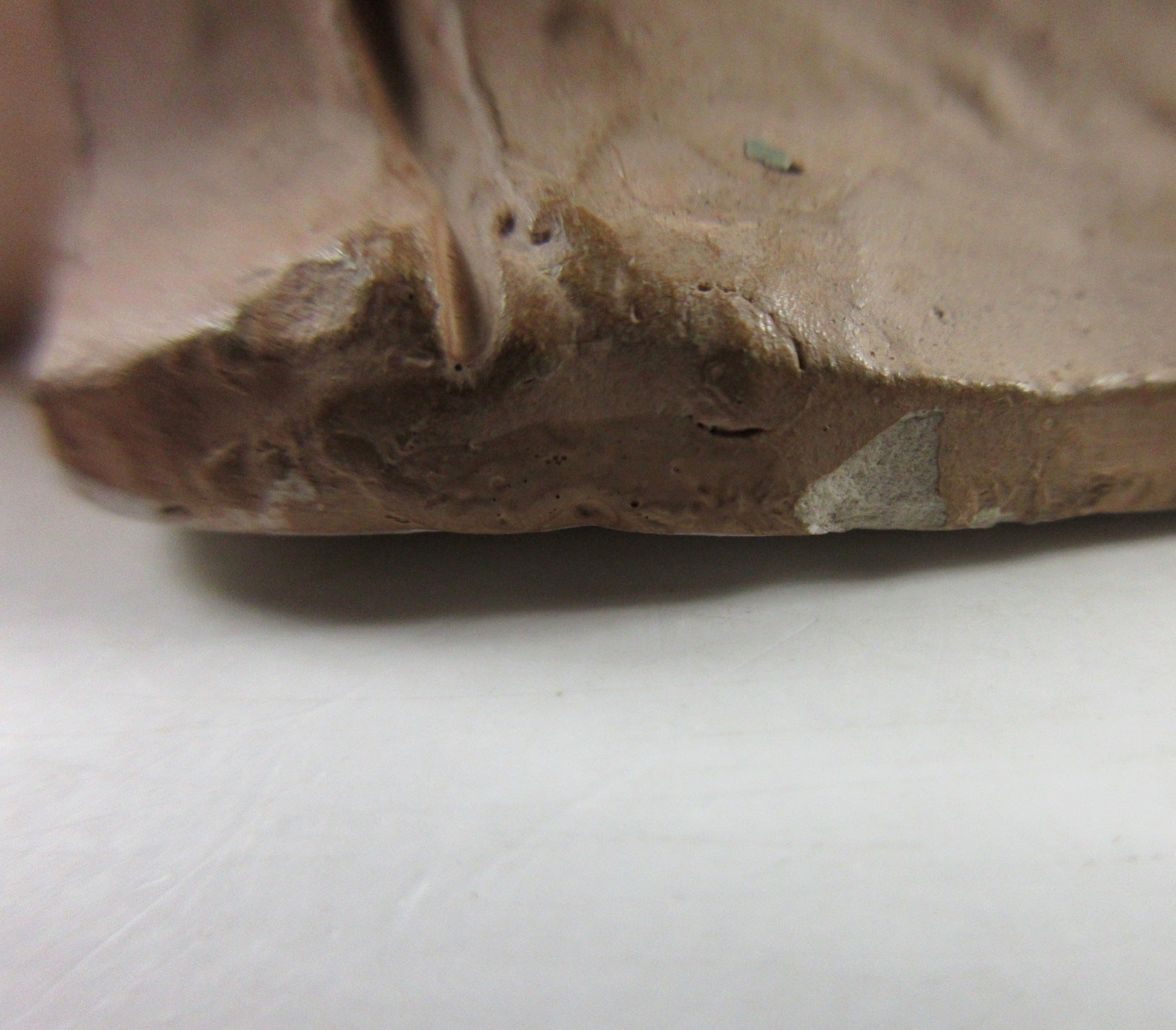 Overall it’s in pretty good condition considering its age. The gesso finish is worn in places (especially his lap), there are some water splotches/marks, some dust build up, areas where the gesso has become burnished, there’s a small chip as well as some discolouration. The board is in pretty good condition. Its discoloured and the lacquer has some scratches/scuffing, some dents.