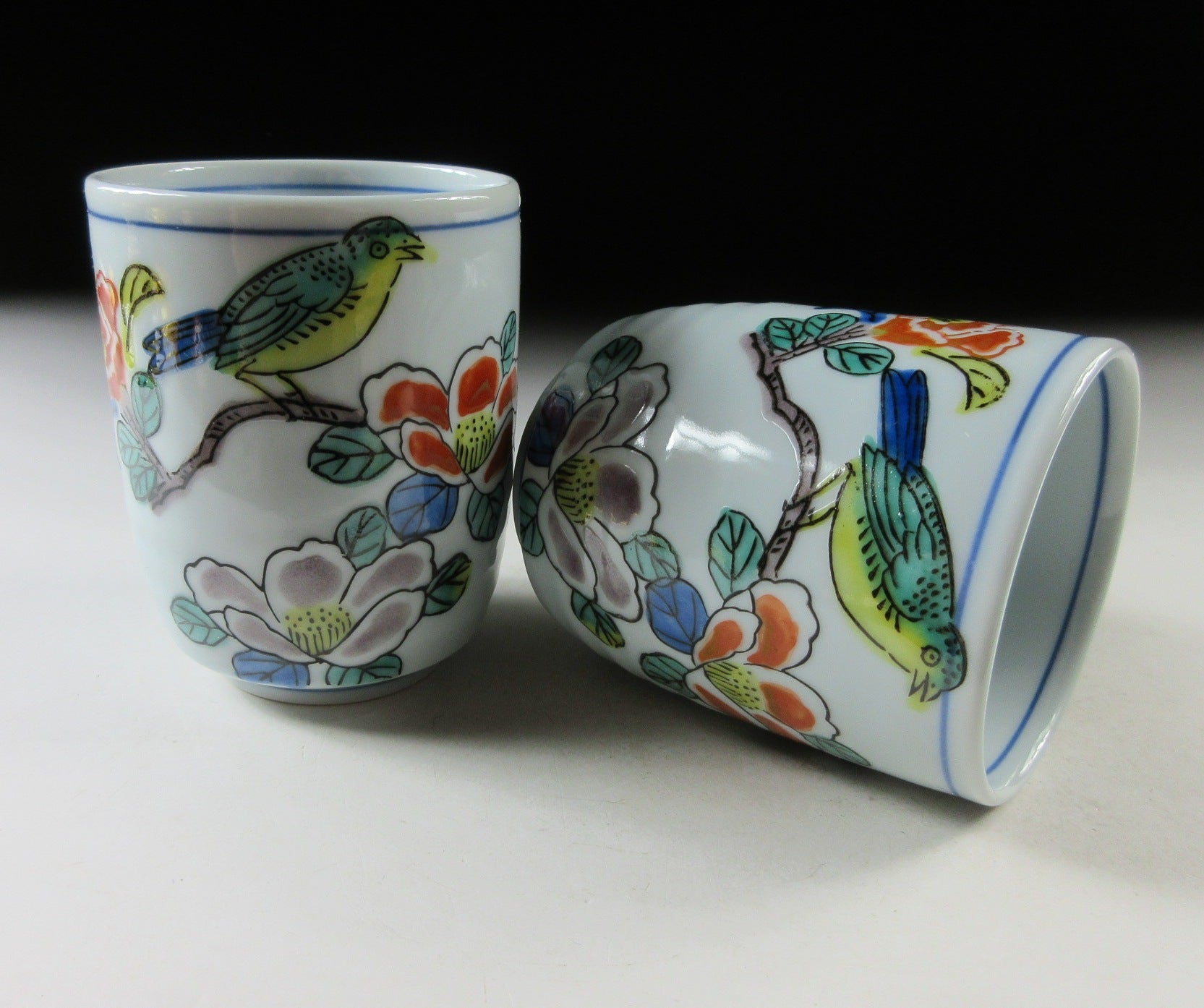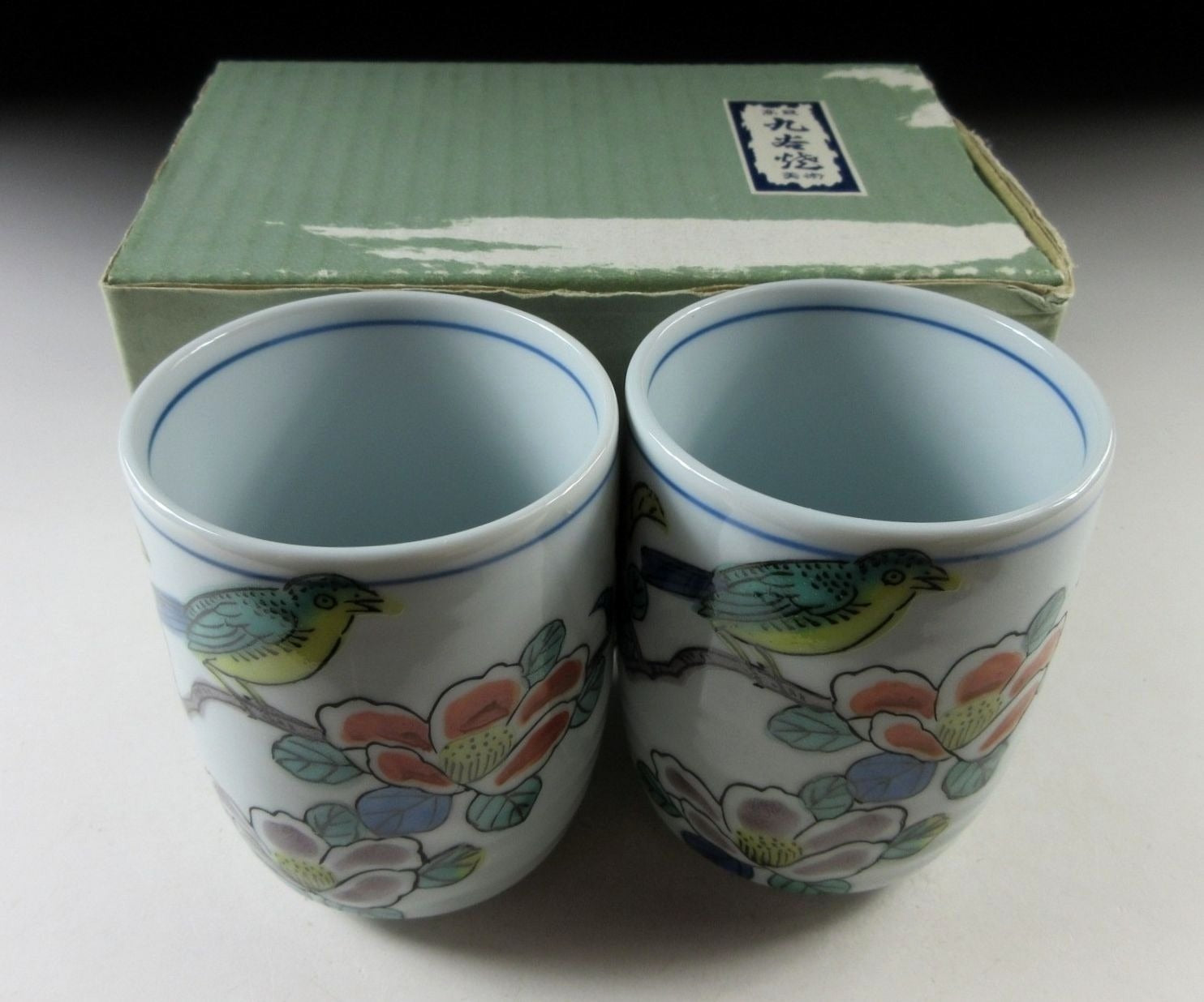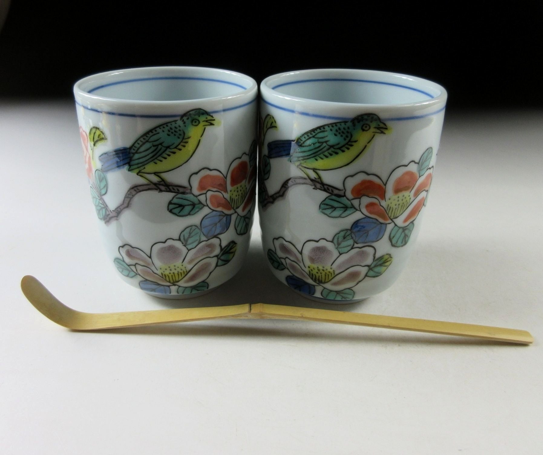 This listing is for a pair of Kutani-ware yunomi made around 20 years by Koyo Gama. They are made of porcelain and decorated with hand-painted depictions of birds with camellia flowers. Also these cups are what we call meoto style, meaning they are two different sizes and often referred to as a husband and wife pair. The signature of the kiln can be found on the bottom, and they come with their original paper storage box. *PLEASE NOTE THAT THE CHASHAKU TEA SCOOP IS NOT INCLUDED.