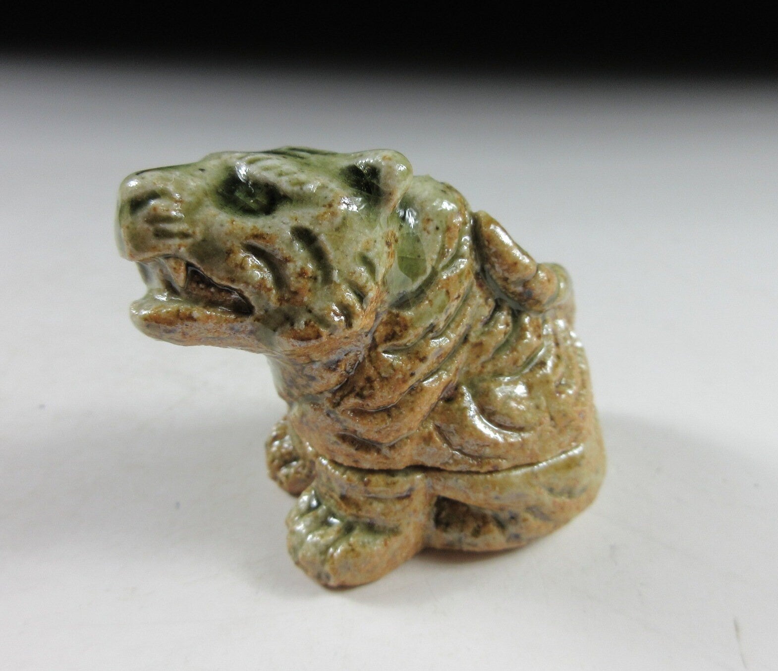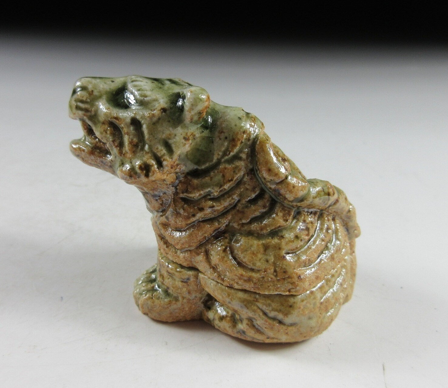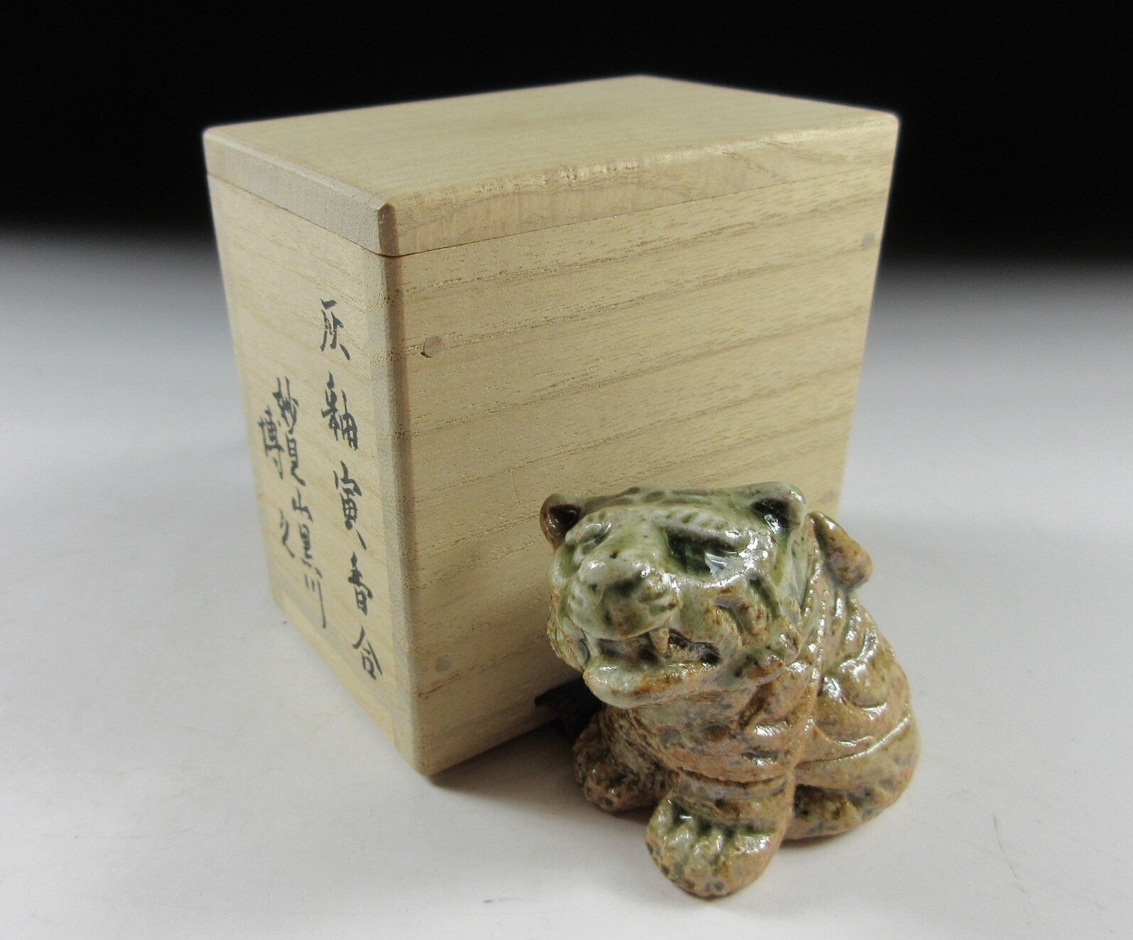 This listing is for a wood-fired Shigaraki-ware kogo made around 20 years ago by Kurokawa Hirohisa. It is made of high-fired stoneware clay and moulded to resemble a tiger. The green colour is vitrified ash, and lines have been carved into the back of the tiger to create the appearance of stripes. Its size and shape is suitable for both woodchip and kneaded incense, although pottery kogo are typically used for kneaded incense during the cooler months. This piece was most likely made to commemorate the Year of the Tiger back in 1998. The stamp of the potter can be found on the bottom, and it comes with its original signed storage box.