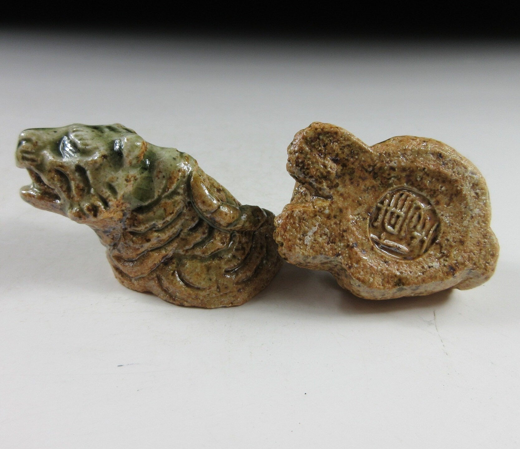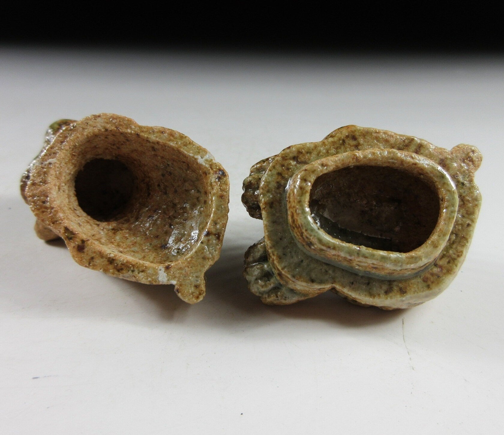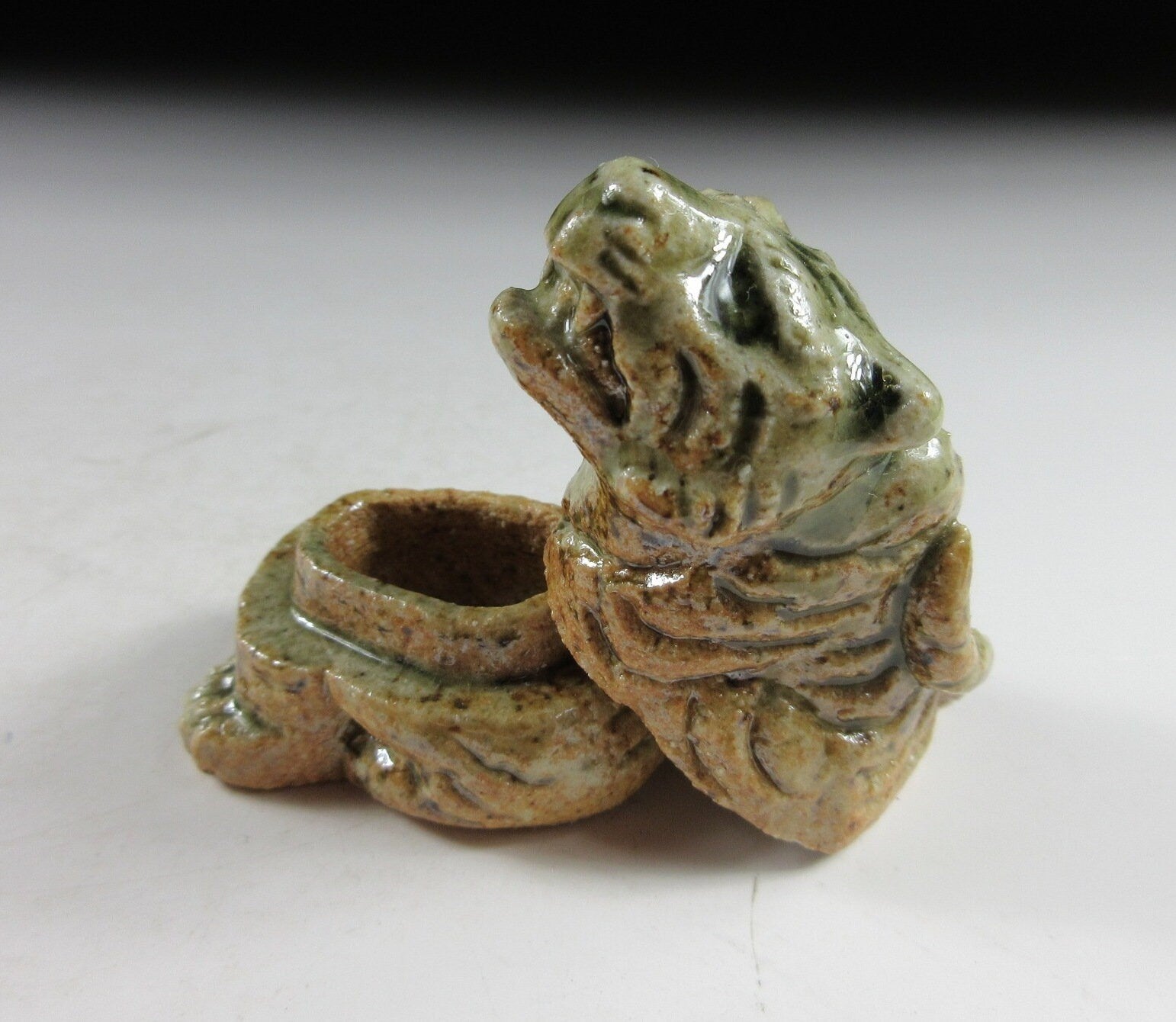 This listing is for a wood-fired Shigaraki-ware kogo made around 20 years ago by Kurokawa Hirohisa. It is made of high-fired stoneware clay and moulded to resemble a tiger. The green colour is vitrified ash, and lines have been carved into the back of the tiger to create the appearance of stripes. Its size and shape is suitable for both woodchip and kneaded incense, although pottery kogo are typically used for kneaded incense during the cooler months. This piece was most likely made to commemorate the Year of the Tiger back in 1998. The stamp of the potter can be found on the bottom, and it comes with its original signed storage box.