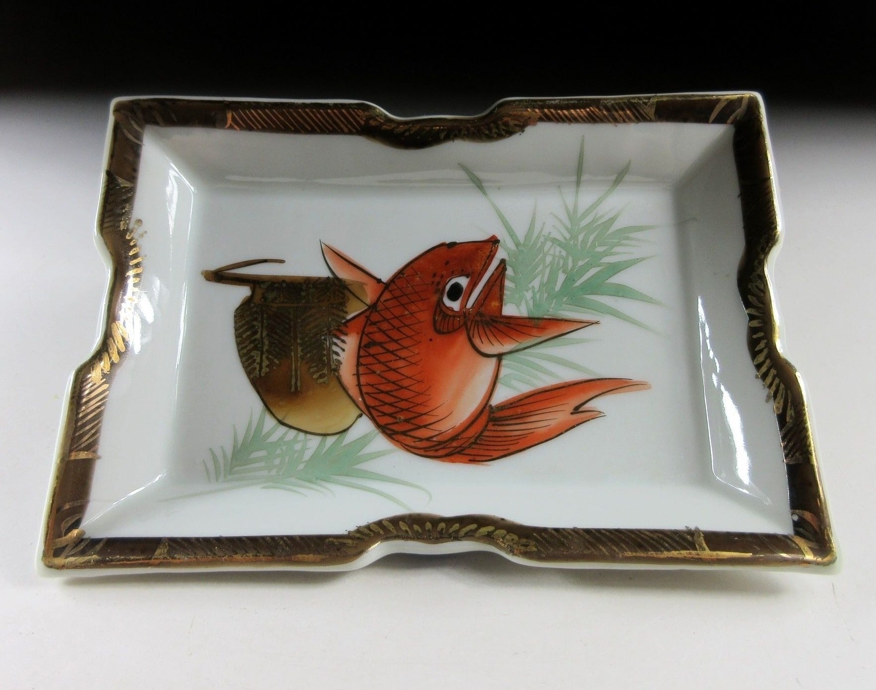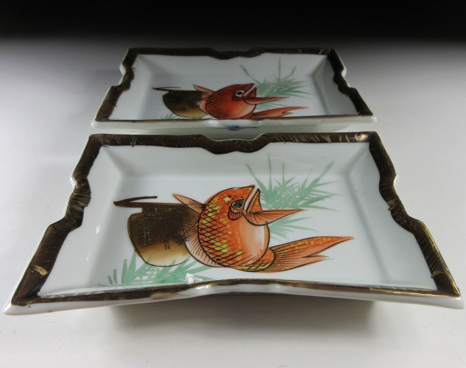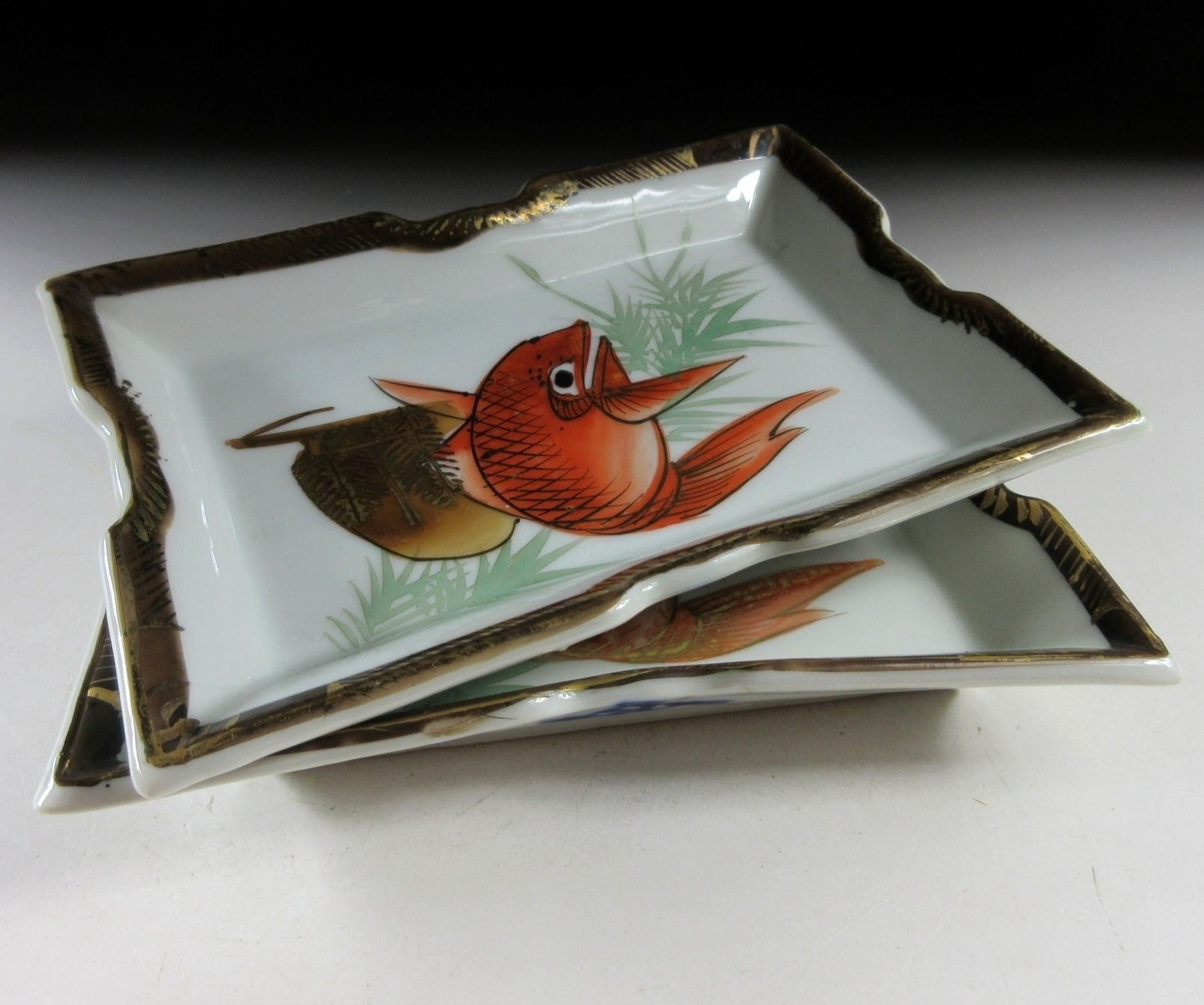 This listing is for a pair of Kutani-ware plates made around 60-70 years ago. They are made of porcelain and decorated with a hand-painted depiction of a sea bream. Sea bream has symbolic importance in Japan, it is a fish for celebration and eaten at New Year. The Japanese name for sea bream is ‘tai’, which is part of the word ‘medetai’ which means auspicious and joyful. Also seam bream turns bright red when it’s cooked, and red is a lucky colour that is thought to ward off evil.