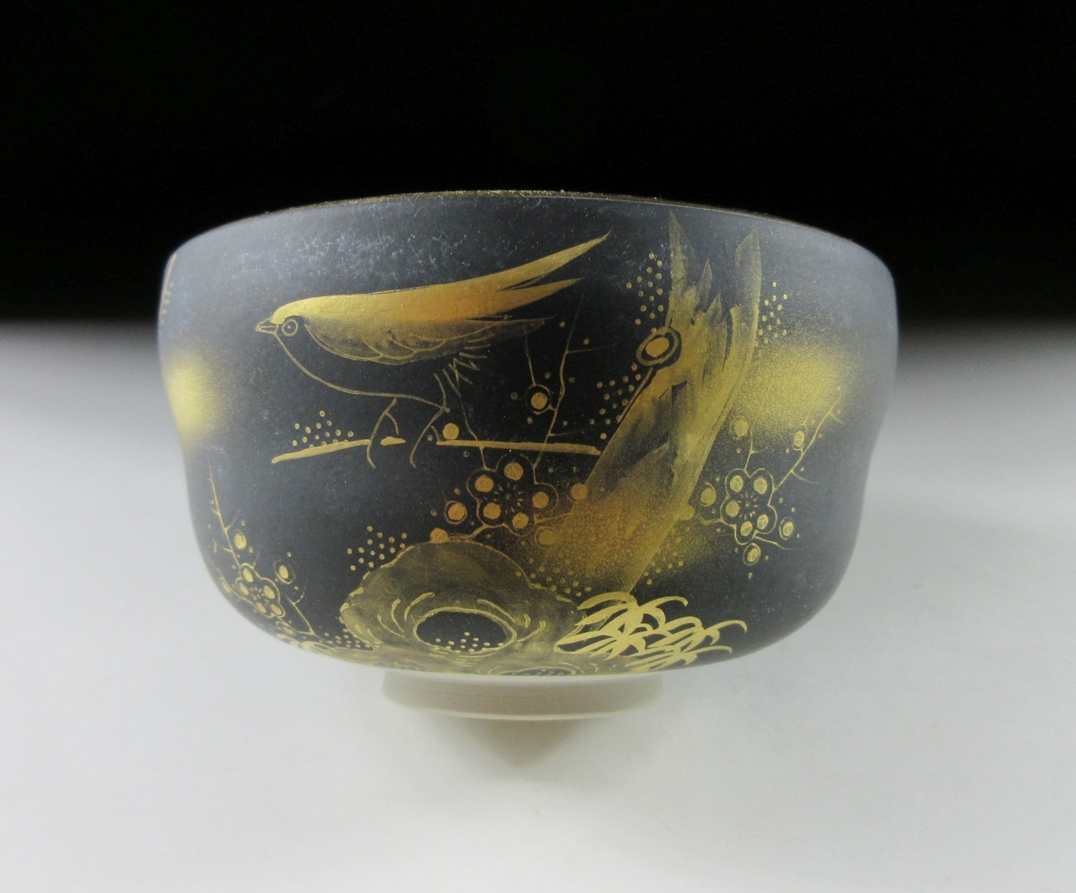 This listing is for a vintage Kutani-ware chawan made around 30 years ago by ‘Kutani Setsuzan’. It is wheel-thrown and features a gold overglaze enamel depiction of a small song bird over matte black glaze base. It is also decorated with ume blossoms, ume being one of the friends of winter. The interior of the bowl has been coated in clear glaze, and the rim is trimmed with gold enamel. The signature of the kiln can be found on the bottom, and it comes with its original signed wooden storage box.