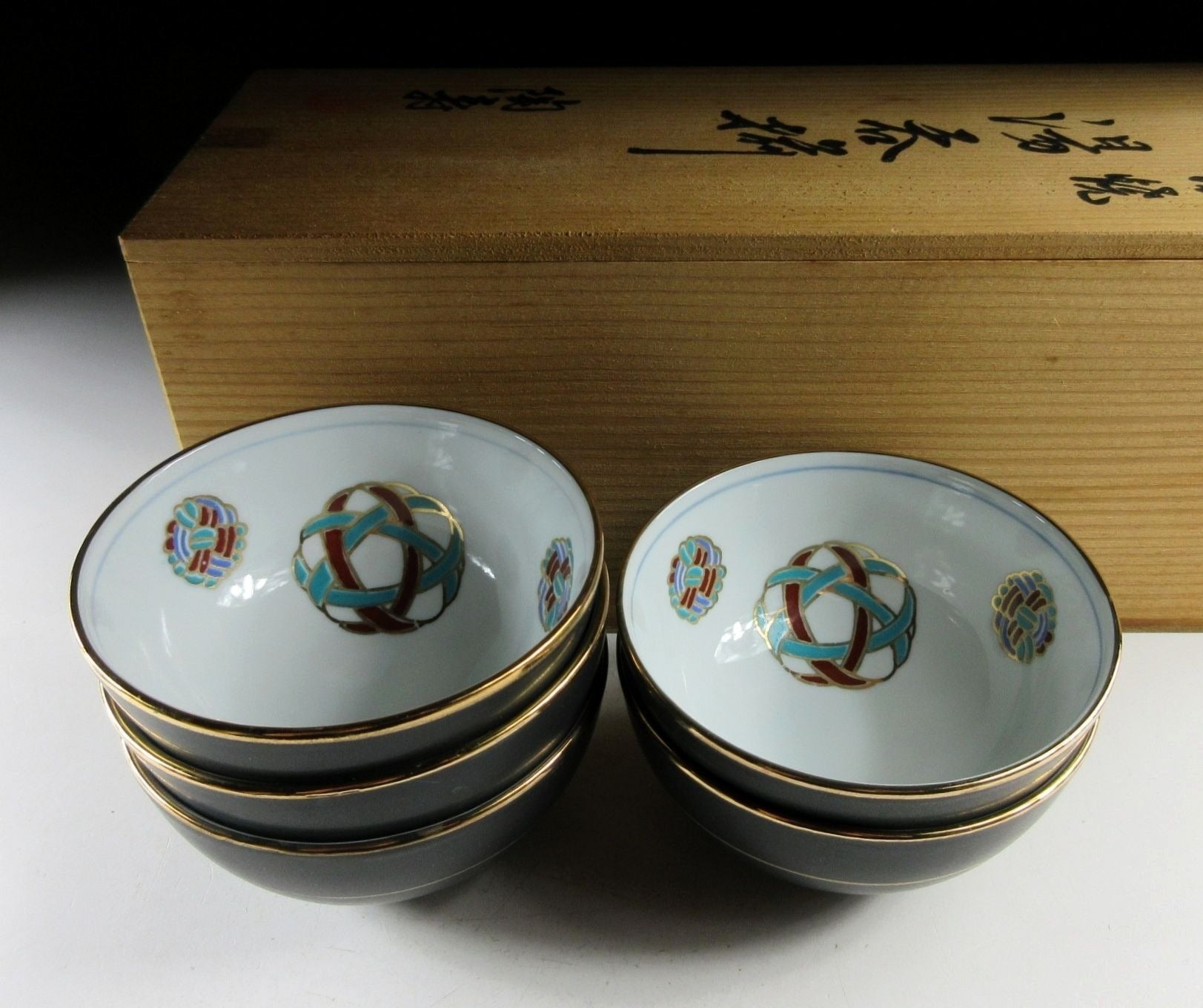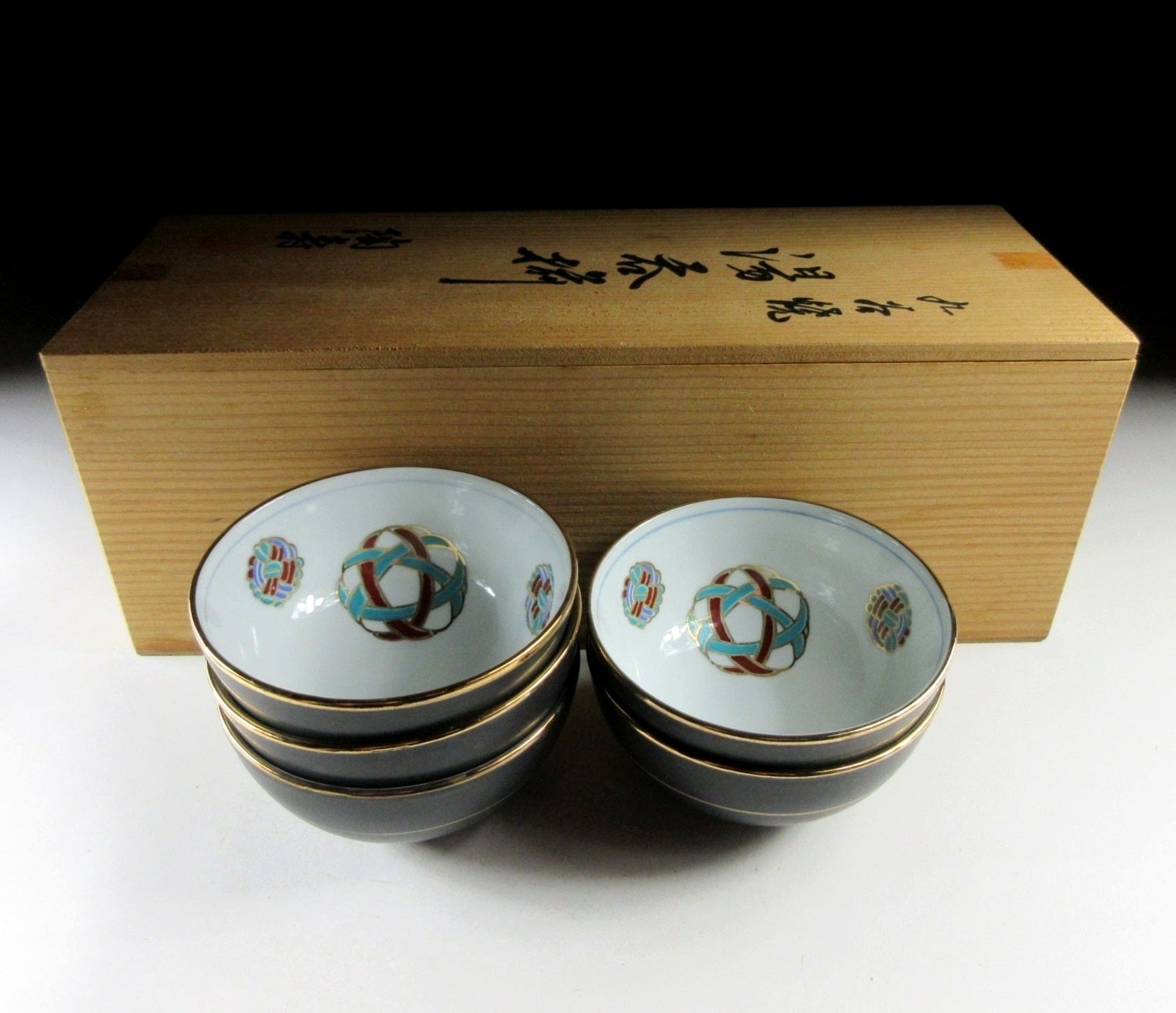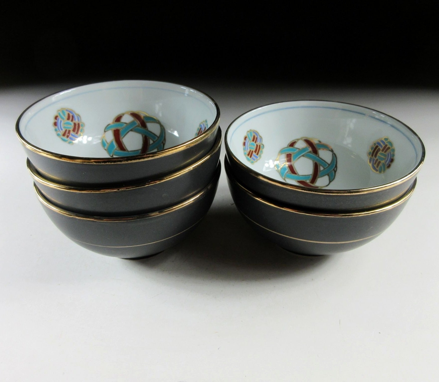 This listing is for a set of five tea cups made around 20-30 years ago by Tojyu Gama. They are made of porcelain and the interior of each cup is decorated with temari balls. Temari balls were traditionally considered a folk art, however these days they are considered to be more of an art form, and this is largely due to the intricacy of the embroidery. The exterior features black glaze and the sides and rims are trimmed with gold enamel. The signature of the kiln can be found on the bottom of each cup, and they come with their original signed wooden storage box.