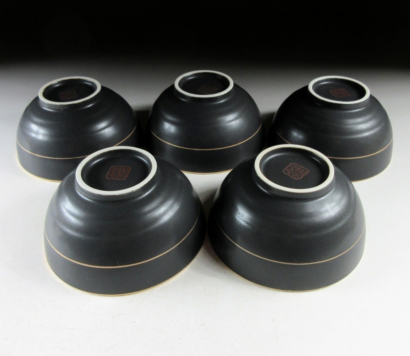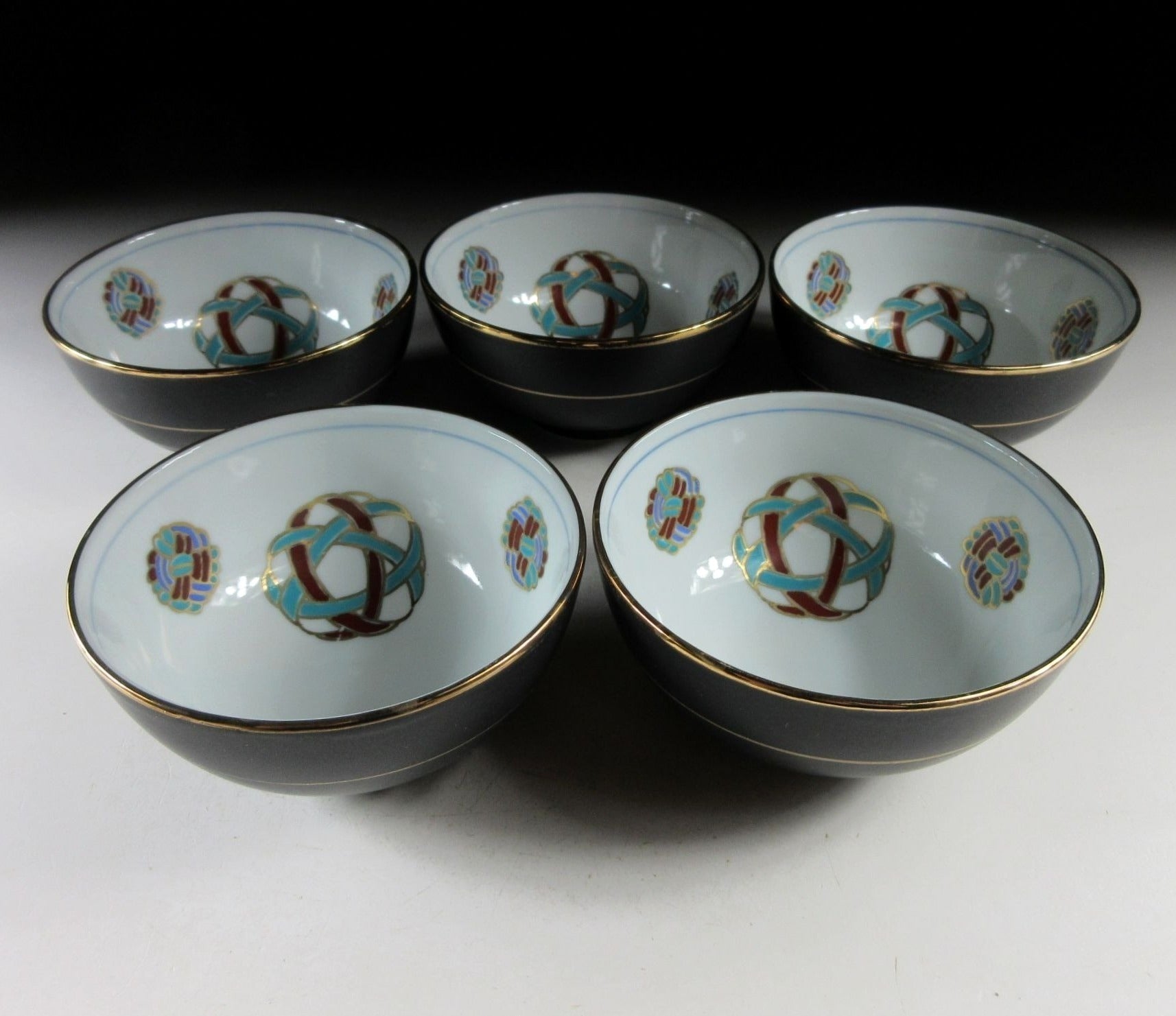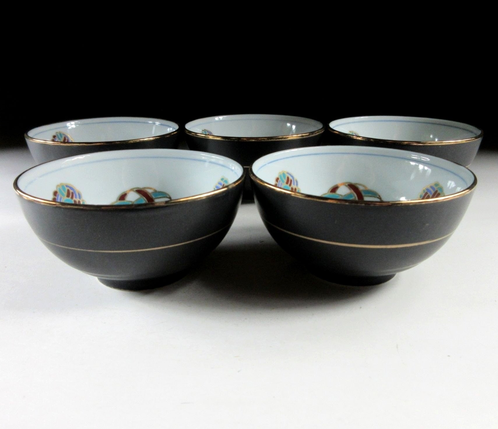 This listing is for a set of five tea cups made around 20-30 years ago by Tojyu Gama. They are made of porcelain and the interior of each cup is decorated with temari balls. Temari balls were traditionally considered a folk art, however these days they are considered to be more of an art form, and this is largely due to the intricacy of the embroidery. The exterior features black glaze and the sides and rims are trimmed with gold enamel. The signature of the kiln can be found on the bottom of each cup, and they come with their original signed wooden storage box.