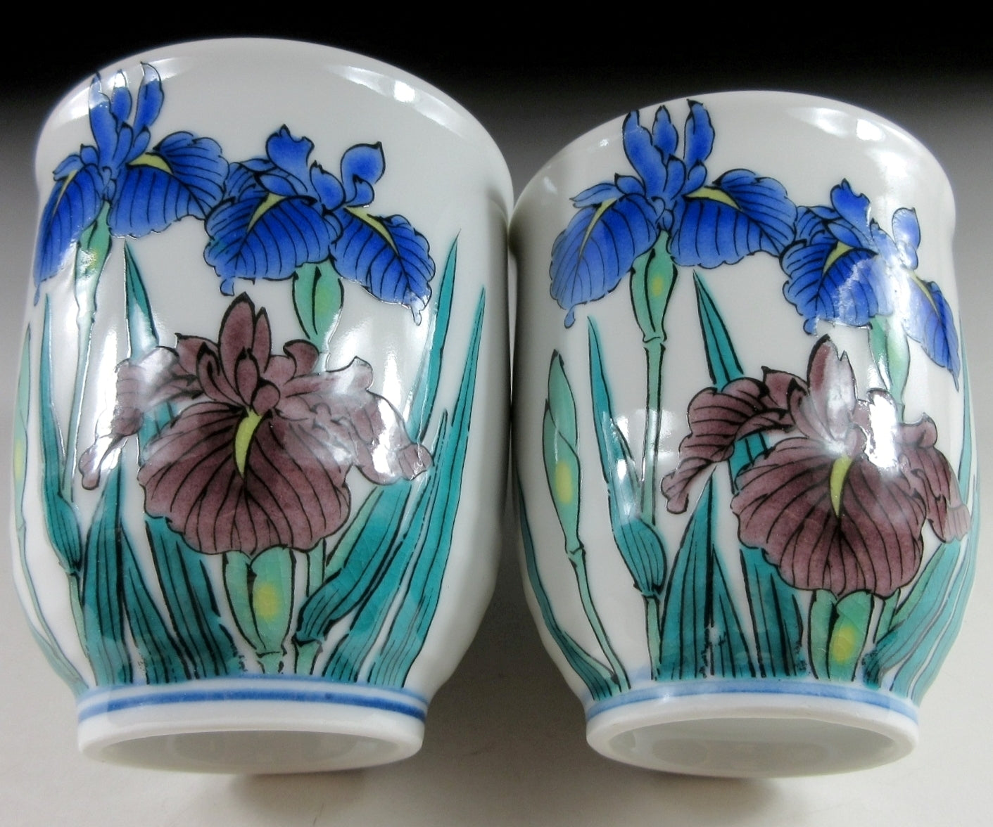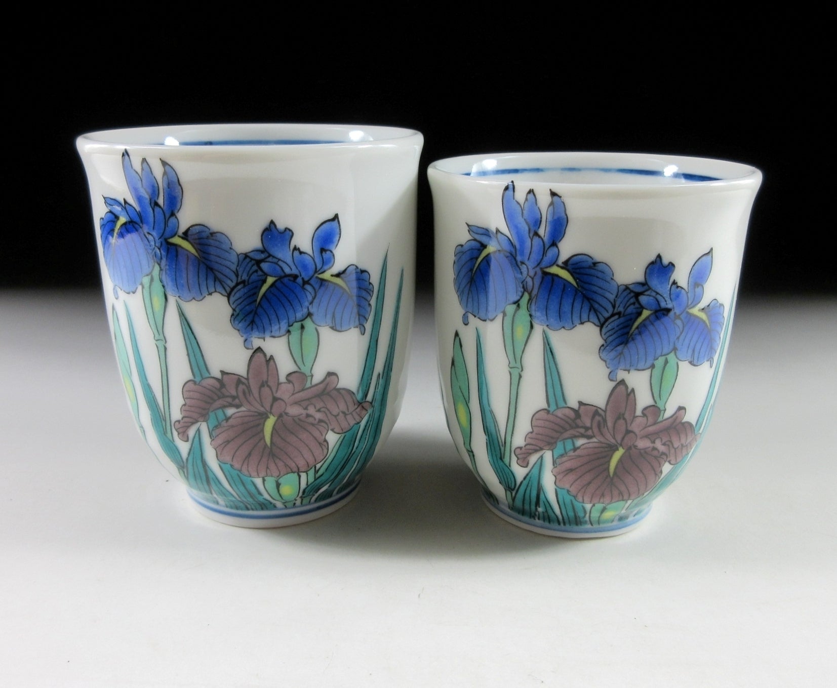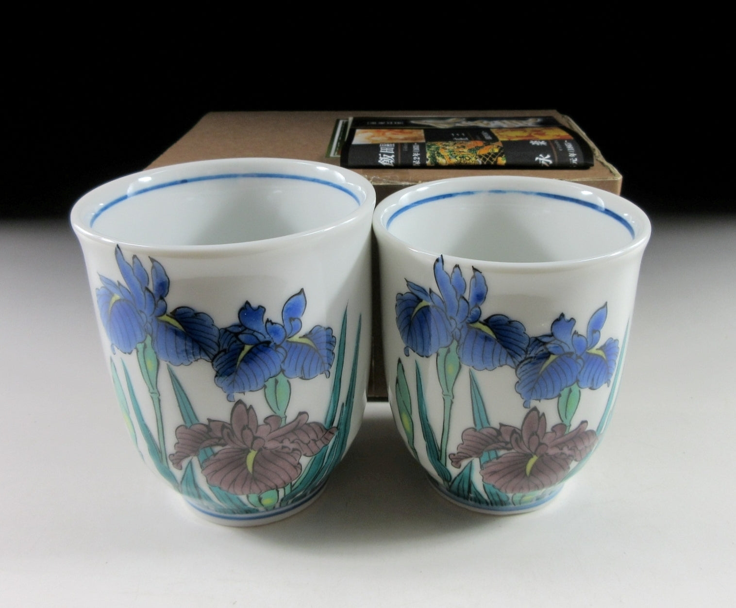 This listing is for a pair of Kutani-ware yunomi made around 20 years ago by Kutani Tougetsu. They are made of porcelain and the front of each cup is decorated with hand-painted irises. In Japan irises bloom from early to mid-summer and are associated with the annual rainy season. Their elegant blooms can be found in parks and gardens across Japan, and they are a common motif in woodblock prints and other types of artworks. Also these cups are what we call meoto style, meaning they are two different sizes and often referred to as a husband and wife pair. The signature of the kiln can be found on the bottom of each cup, and they come with their original paper storage box.