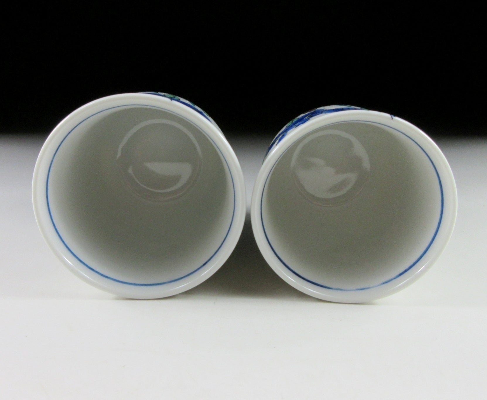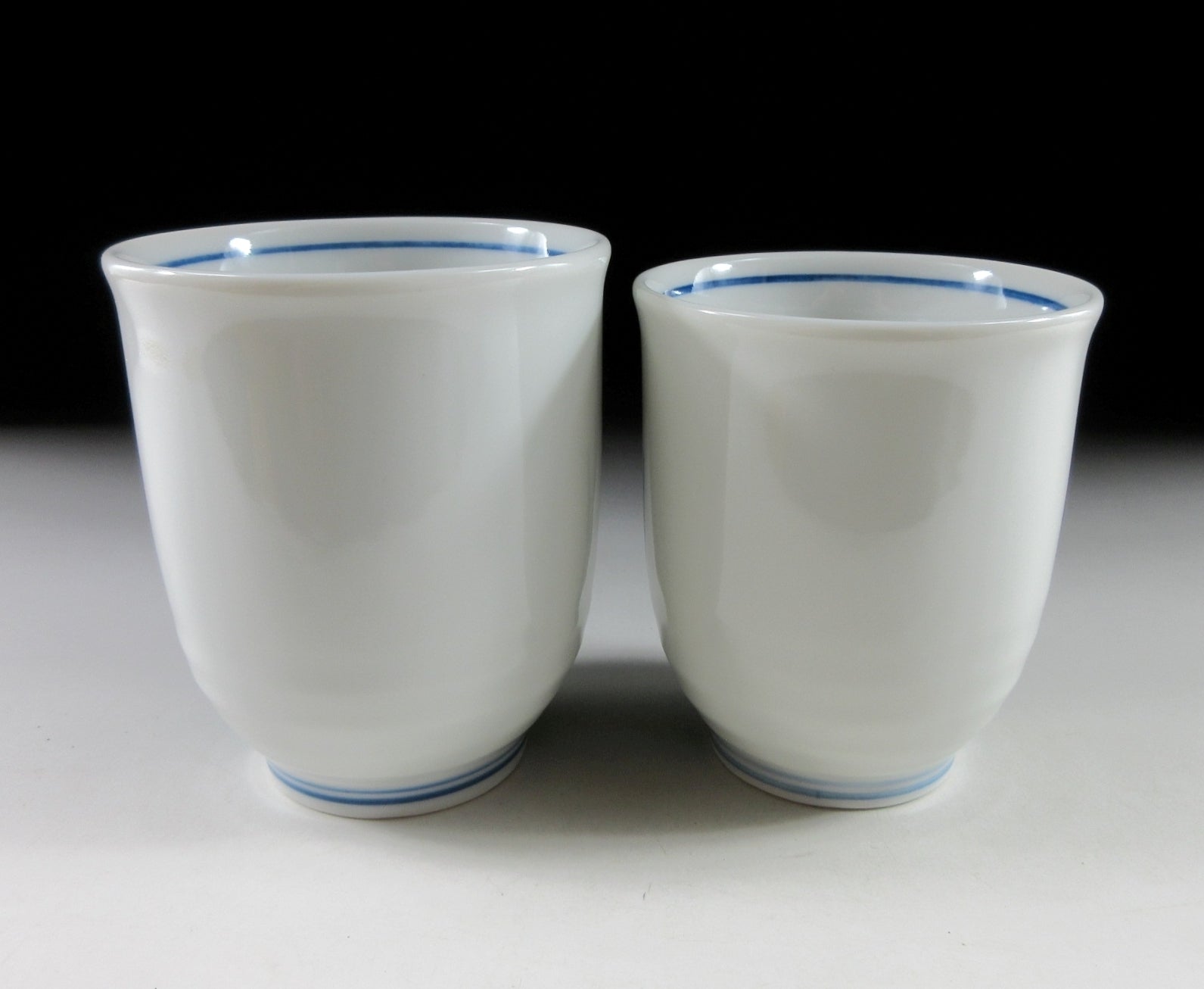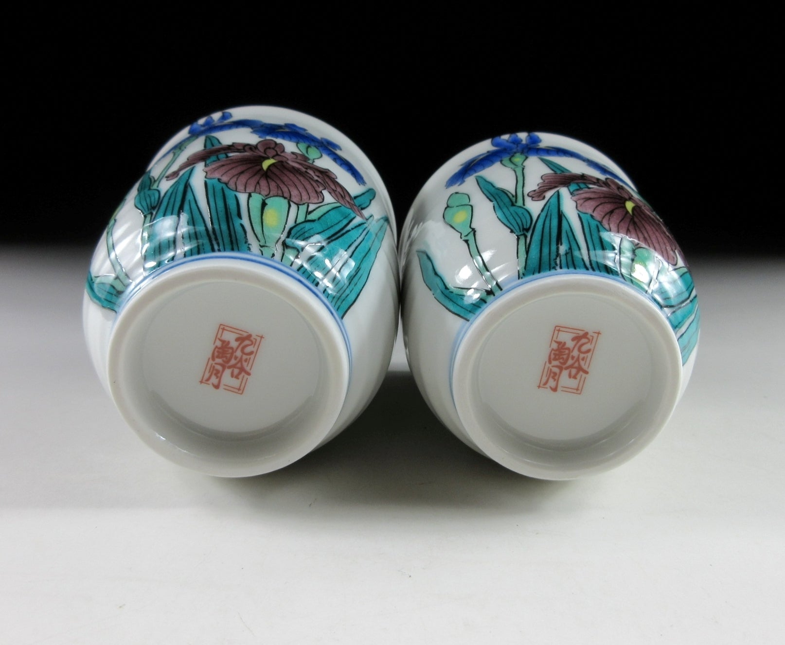 This listing is for a pair of Kutani-ware yunomi made around 20 years ago by Kutani Tougetsu. They are made of porcelain and the front of each cup is decorated with hand-painted irises. In Japan irises bloom from early to mid-summer and are associated with the annual rainy season. Their elegant blooms can be found in parks and gardens across Japan, and they are a common motif in woodblock prints and other types of artworks. Also these cups are what we call meoto style, meaning they are two different sizes and often referred to as a husband and wife pair. The signature of the kiln can be found on the bottom of each cup, and they come with their original paper storage box.