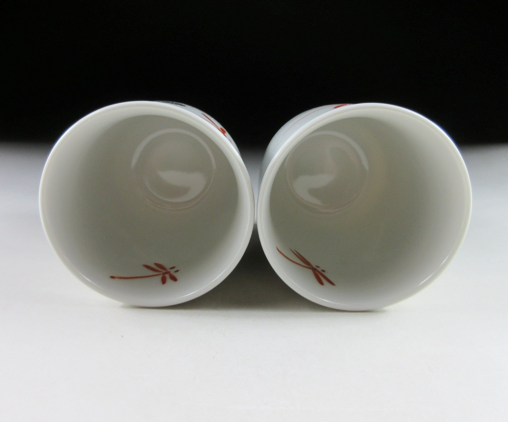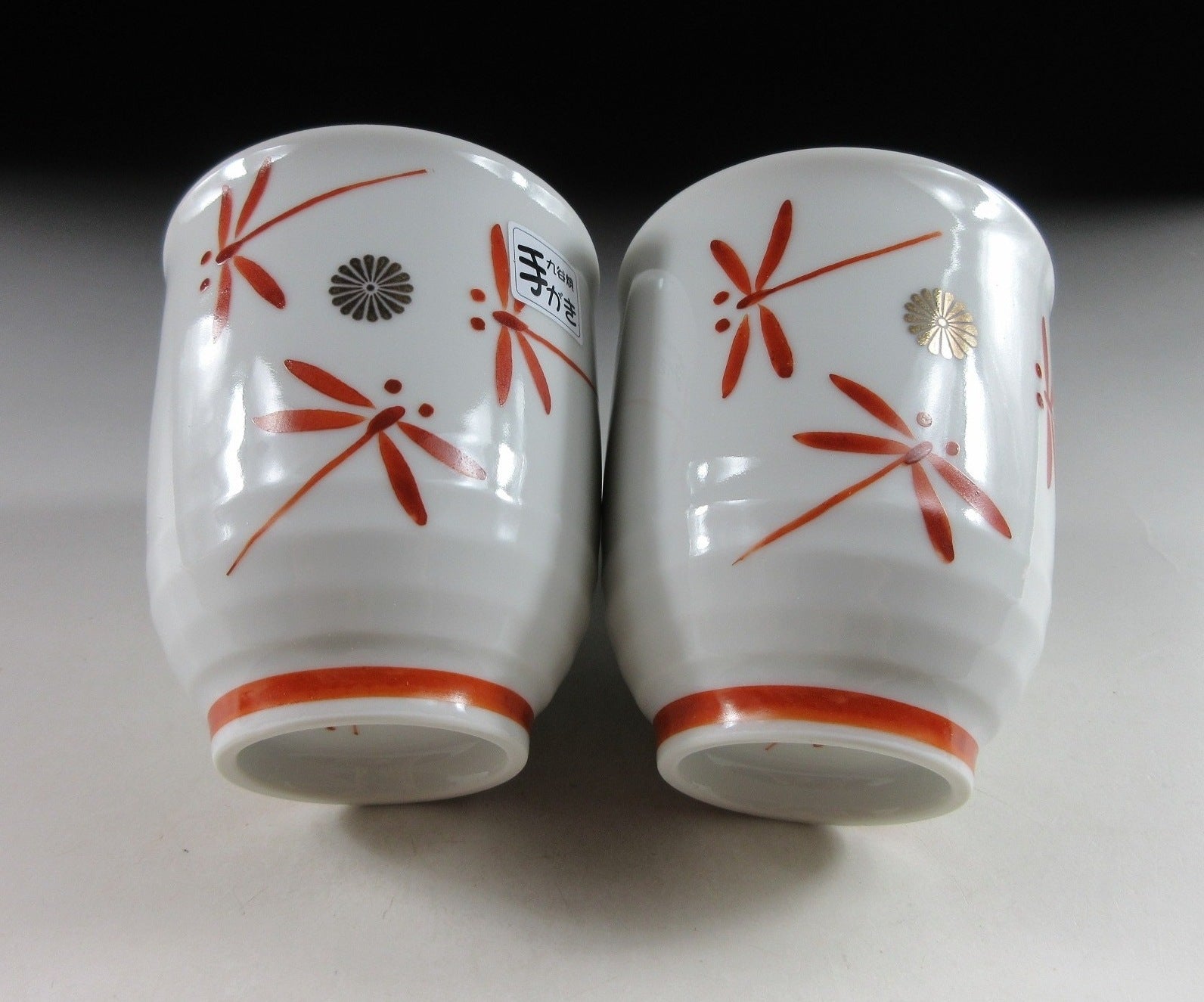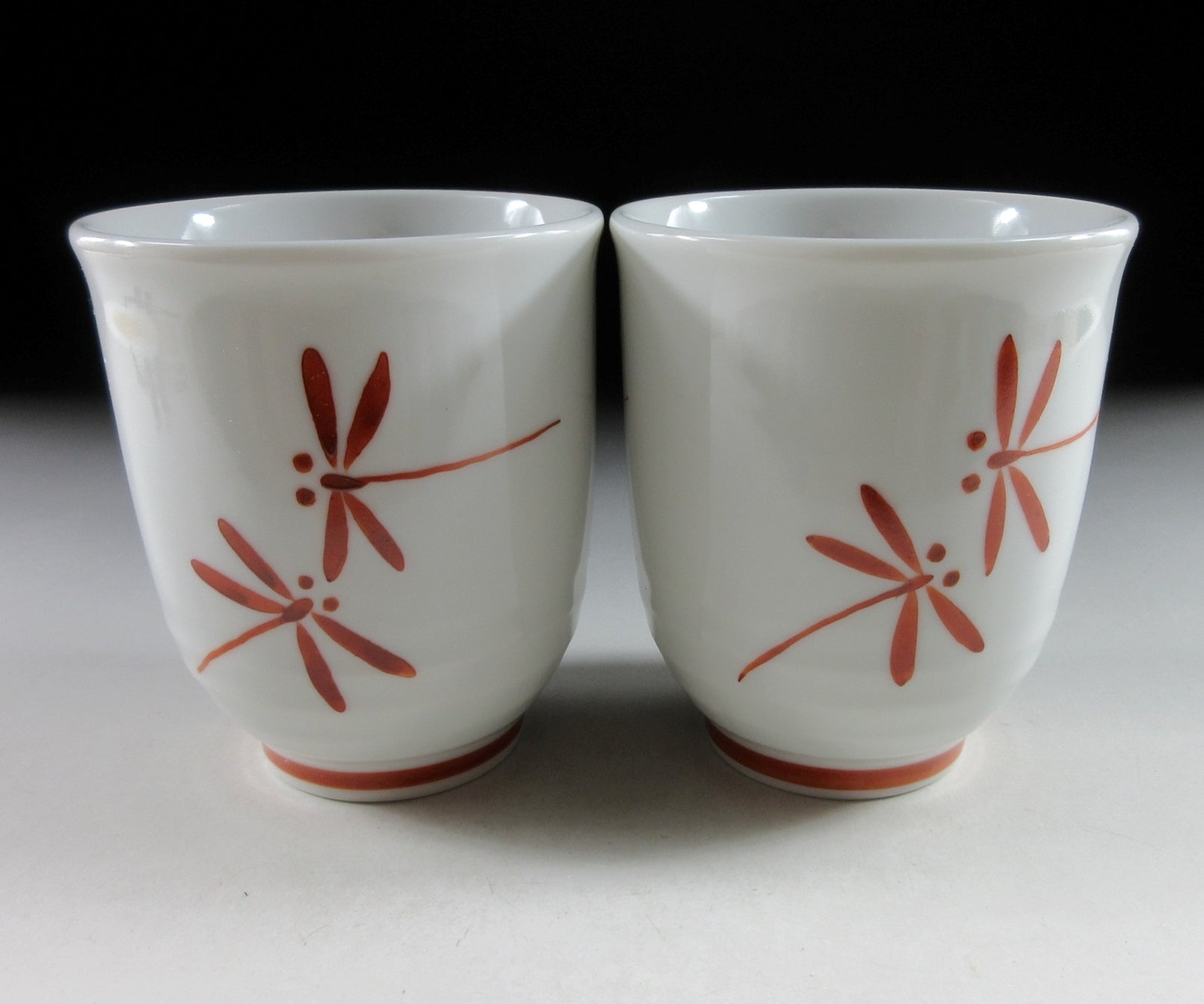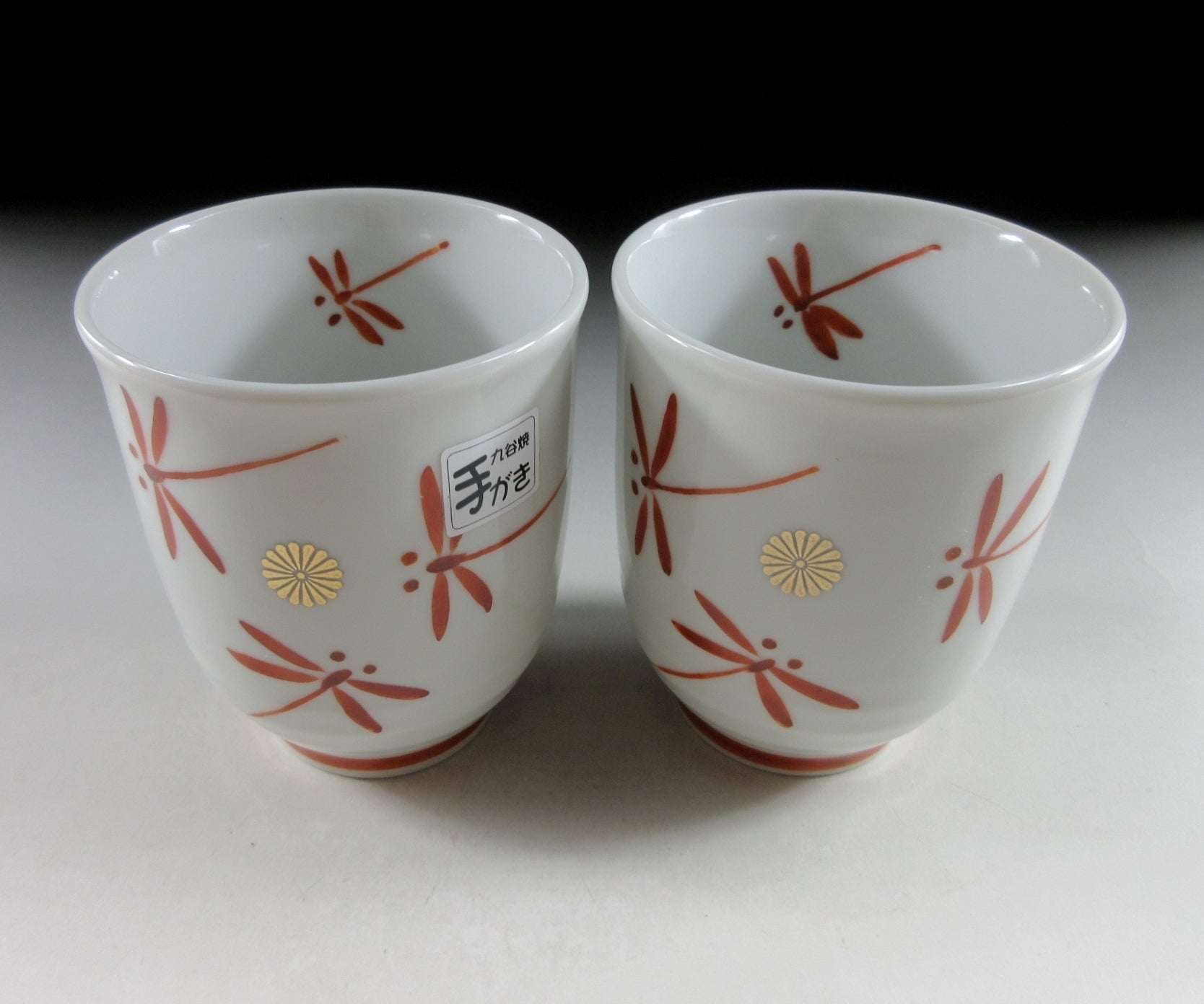 This listing is for a pair of Kutani-ware yunomi made around 5-10 years ago. They are made of porcelain and decorated with hand-painted depictions of dragonflies against a white background. Dragonflies signify a change in seasons, and are frequently used to decorate teaware and tableware designated for late summer, early autumn. They also feature a gold overglaze depiction of the imperial chrysanthemum on the front of each cup. The signature of the kiln can be found on the bottom of each cup, and they come with their original wooden storage box. They also come with a Japanese language profile paper about different types of Kutani-ware.