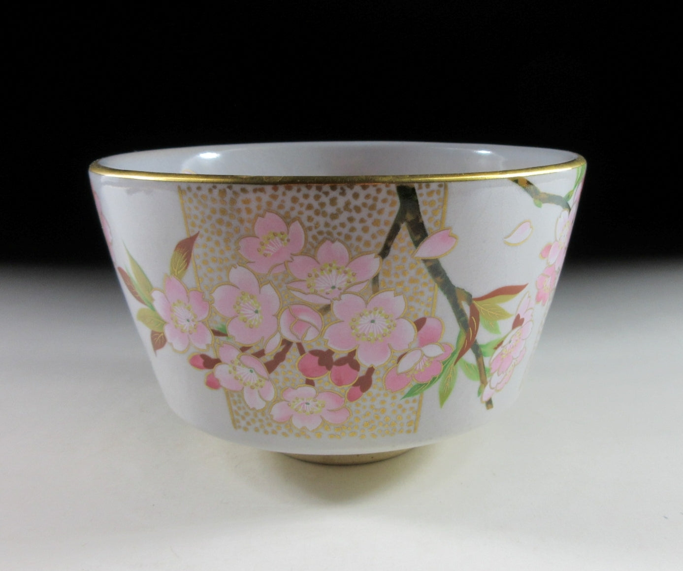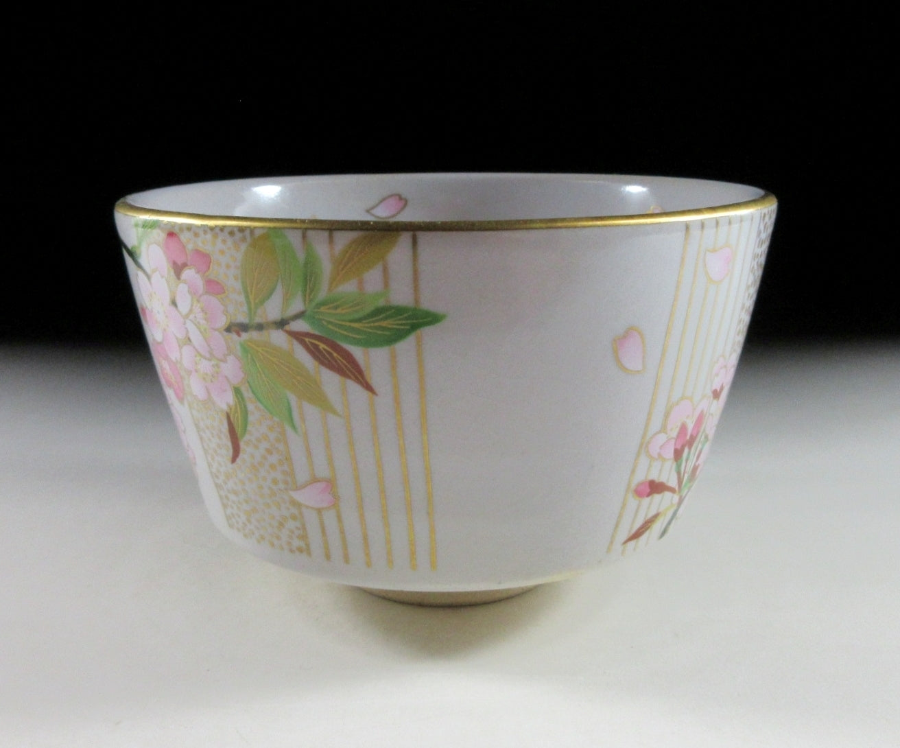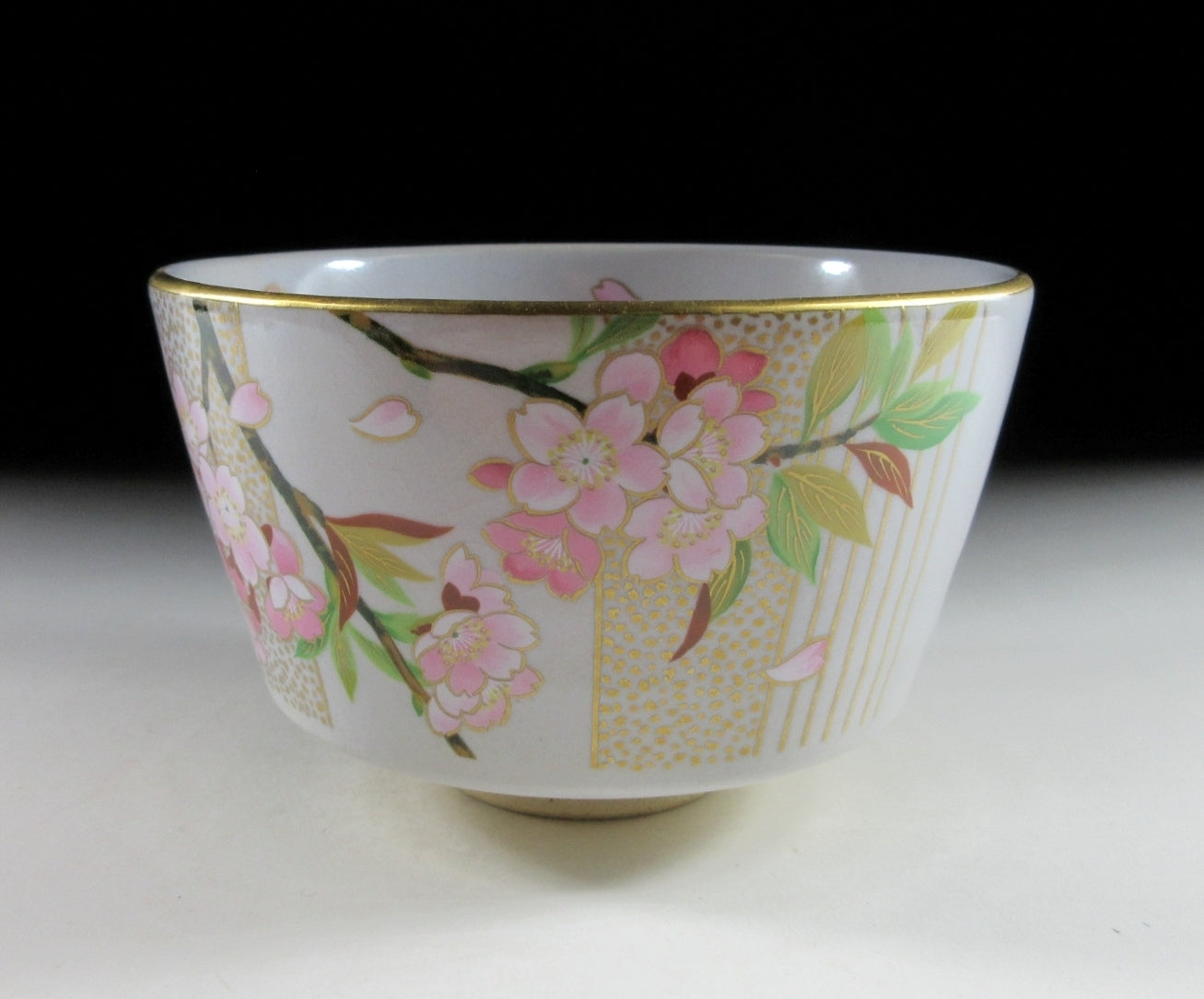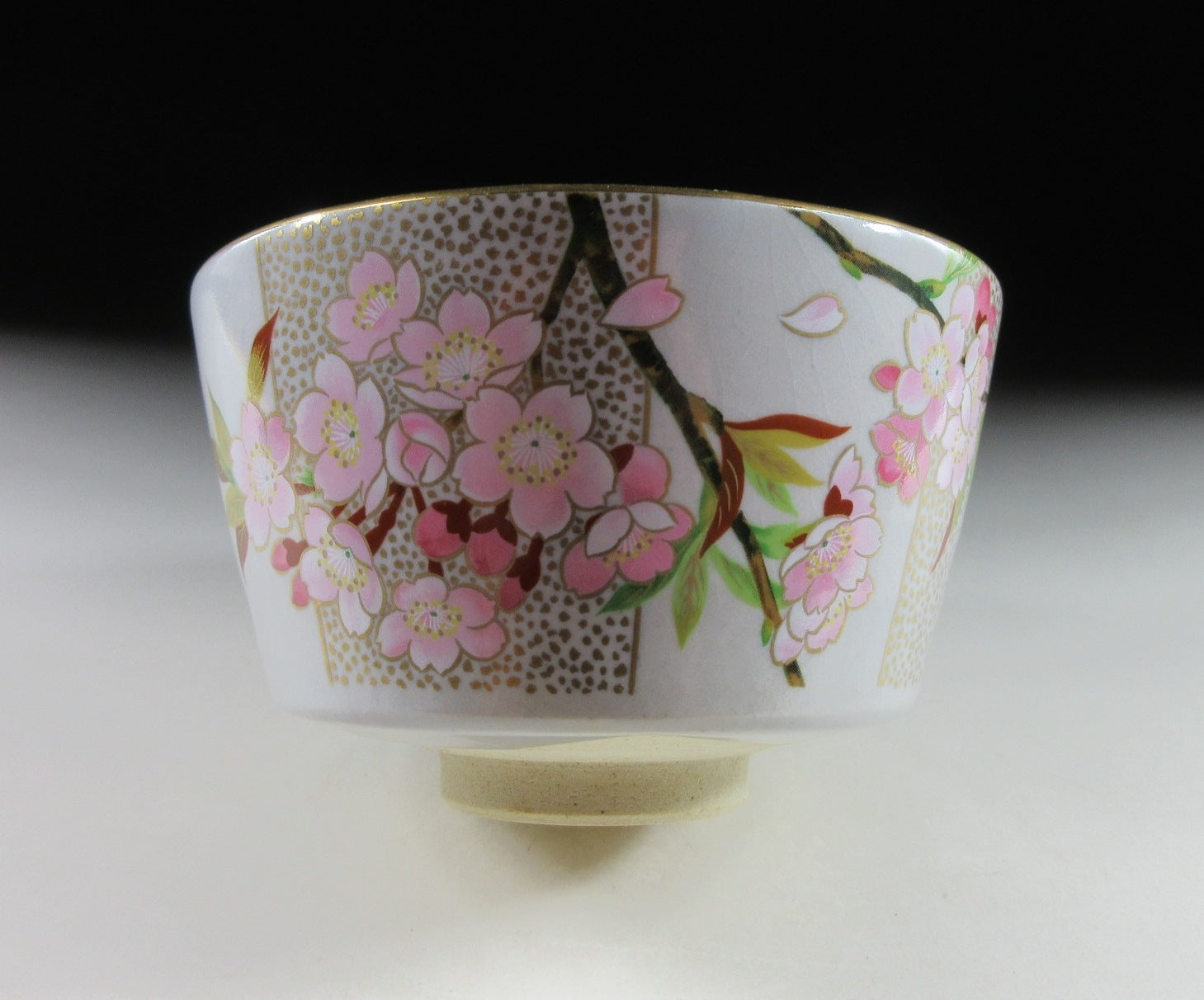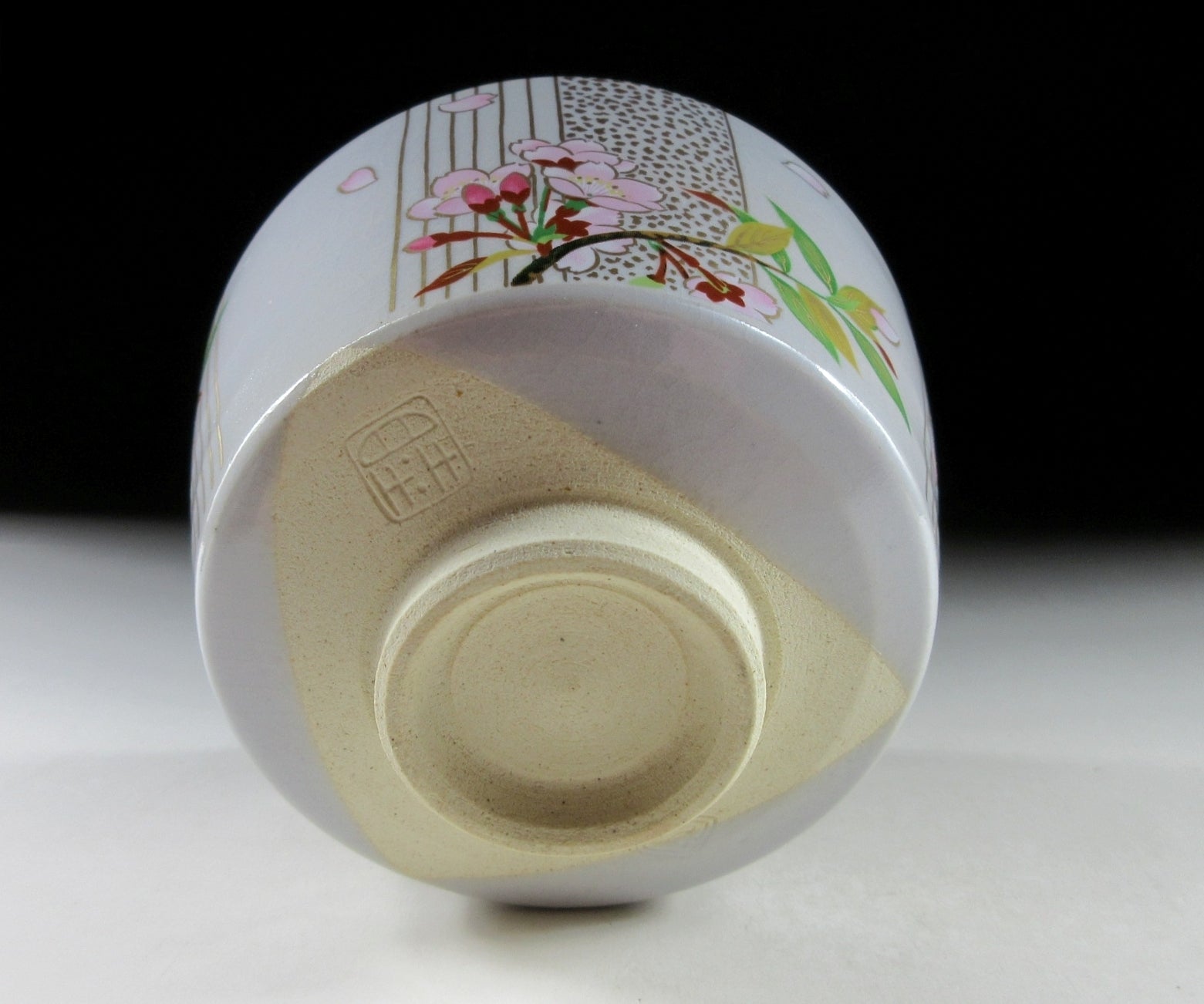 This listing is for a beautiful Kiyomizu-ware chawan made around 20 years ago. It is wheel thrown and decorated with an original illustration by Japanese female painter, Kuwano Mutsuko. This seasonal design features pink cherry blossoms, and it’s from the ‘Gosho no Hana’ series depicting twelve months of flowers growing in the Kyoto Imperial Palace Garden. This particular bowl represents the month of April from the series. The rim is trimmed with gold enamel, and the bowl has a pleasant and practical komogai shape. The stamp of Kuwano and the kiln can be found on the bottom, sorry no box for this one.