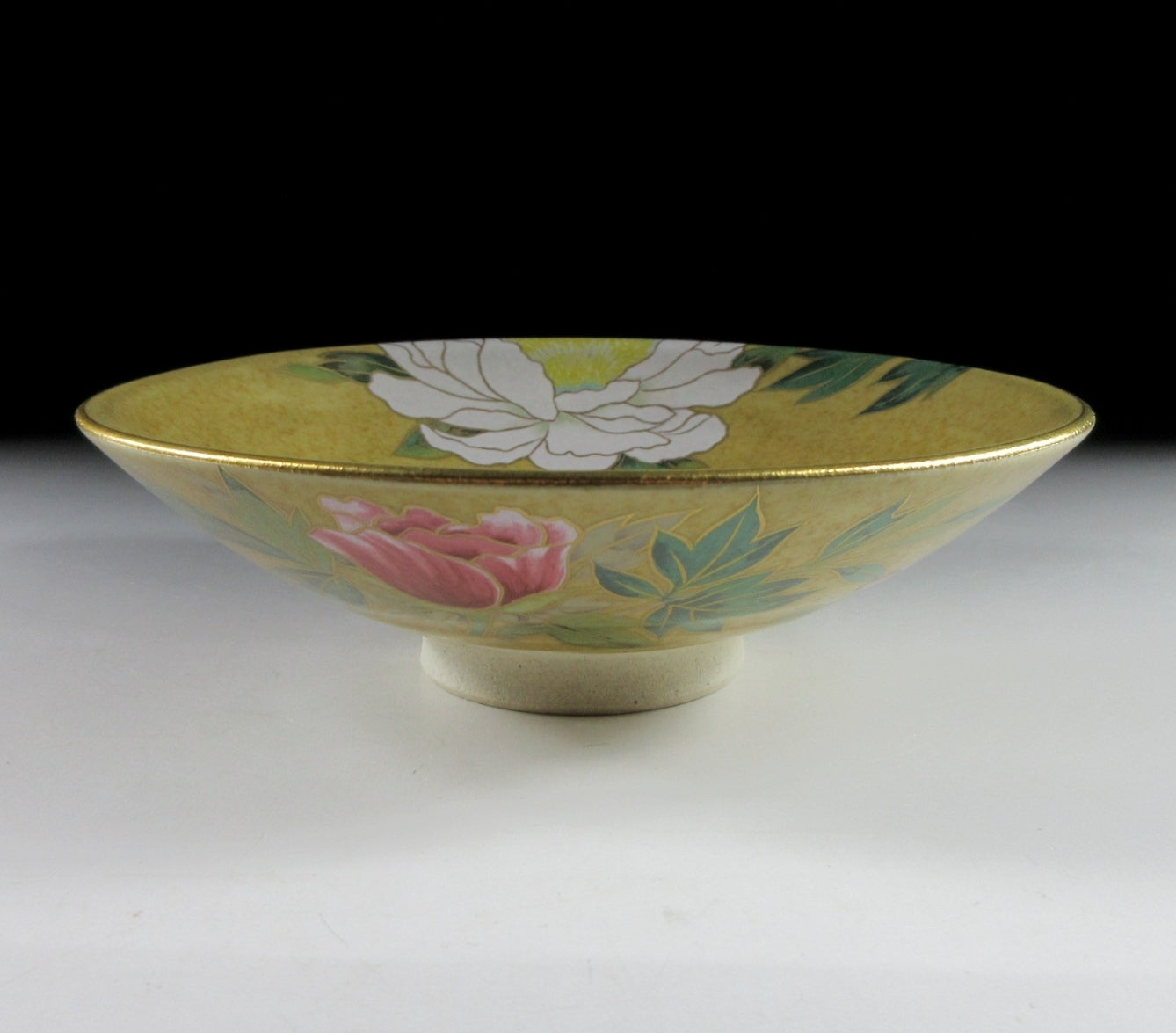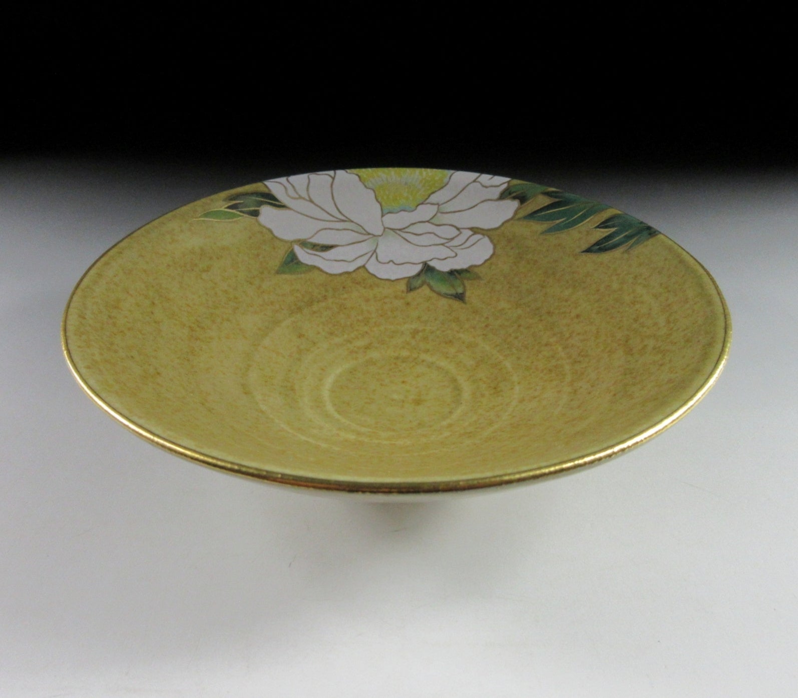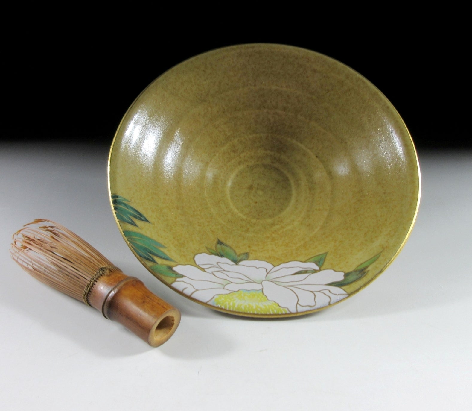 This listing is for a beautiful Kiyomizu-ware chawan made around 20 years ago. It is wheel thrown and decorated with an original illustration by Japanese female painter, Kuwano Mutsuko. This seasonal design features peonies over a yellowish background, and it’s from the ‘Gosho no Hana’ series depicting twelve months of flowers growing in the Kyoto Imperial Palace Garden. This particular bowl represents the month of July from the series. The rim is trimmed with gold enamel, and the bowl is the flat hira type used during the summer season. Hira chawan are shallow bowls with low sides designed to cool tea down faster. The stamp of Kuwano and the kiln can be found on the bottom. *PLEASE NOTE THAT THE CHASEN TEA WHISK IS NOT INCLUDED IN THIS LISTING.