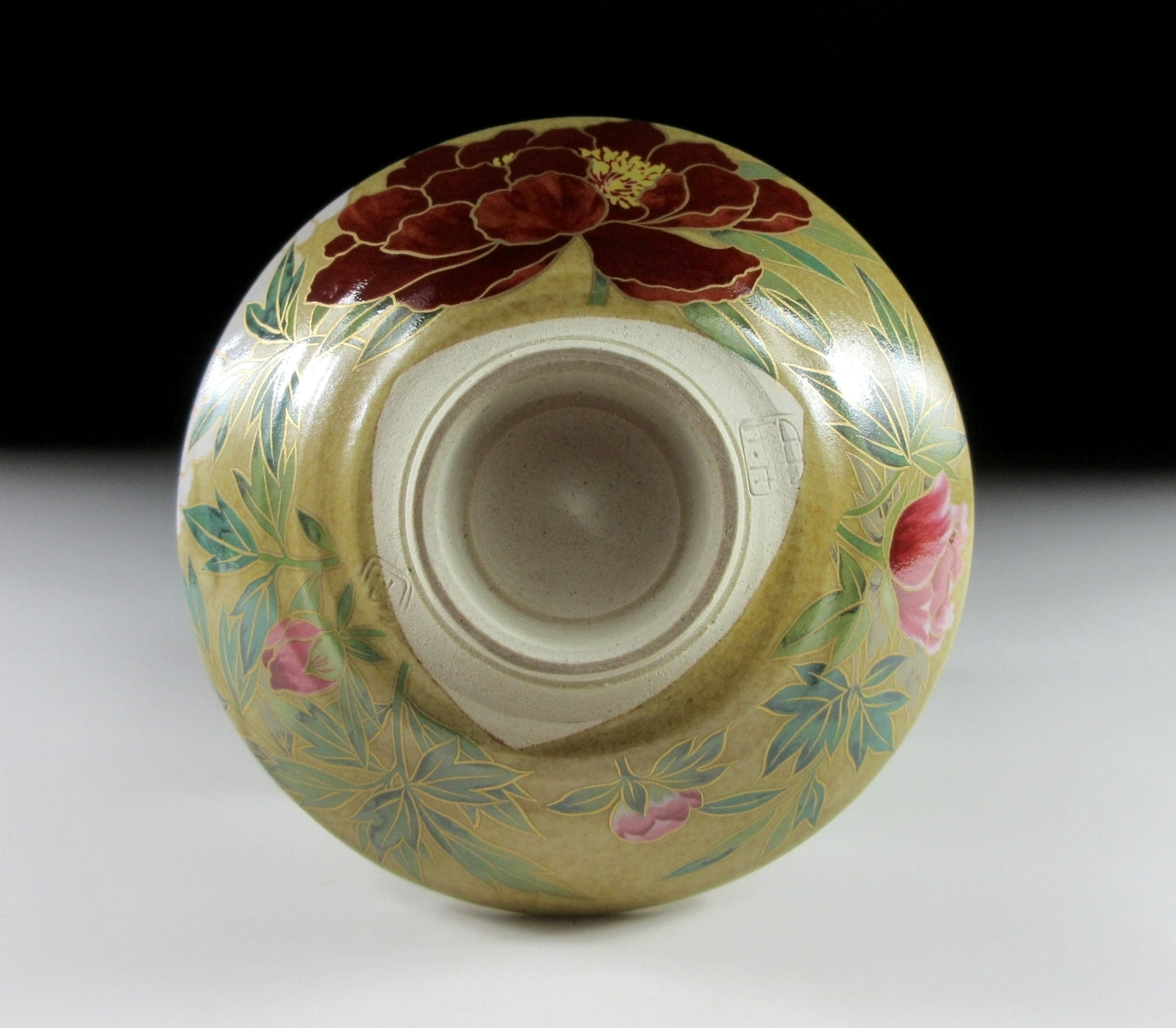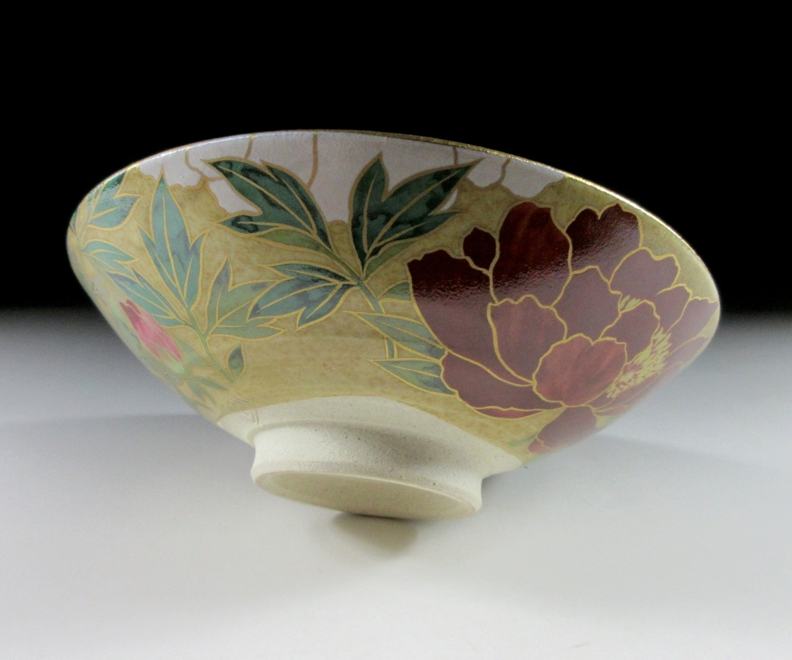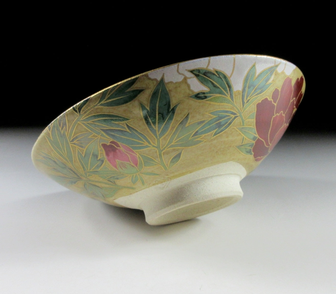 This listing is for a beautiful Kiyomizu-ware chawan made around 20 years ago. It is wheel thrown and decorated with an original illustration by Japanese female painter, Kuwano Mutsuko. This seasonal design features peonies over a yellowish background, and it’s from the ‘Gosho no Hana’ series depicting twelve months of flowers growing in the Kyoto Imperial Palace Garden. This particular bowl represents the month of July from the series. The rim is trimmed with gold enamel, and the bowl is the flat hira type used during the summer season. Hira chawan are shallow bowls with low sides designed to cool tea down faster. The stamp of Kuwano and the kiln can be found on the bottom. *PLEASE NOTE THAT THE CHASEN TEA WHISK IS NOT INCLUDED IN THIS LISTING.