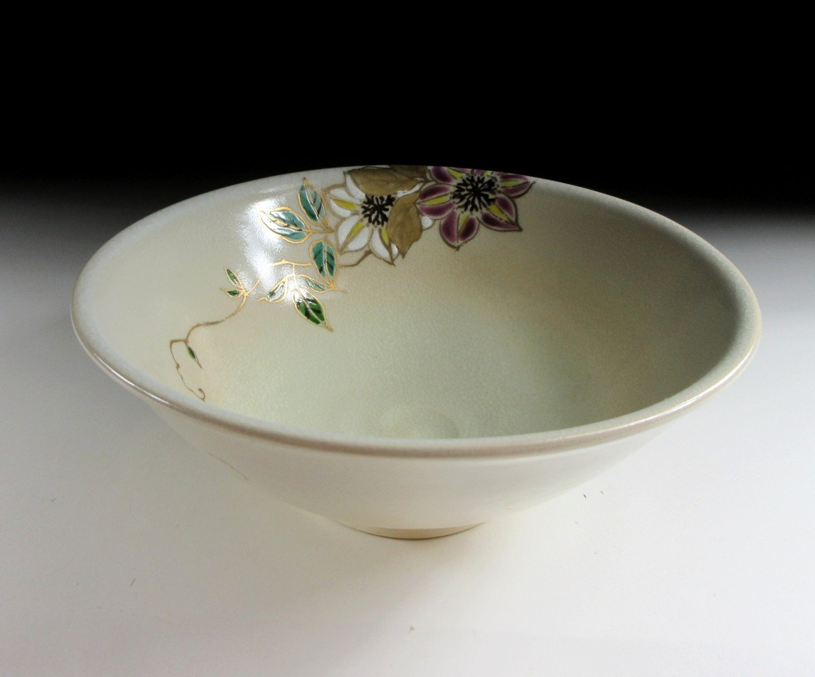 This listing is for a Kyo-ware hira chawan made around 20 years ago and signed ‘Hirokusa’. It is wheel-thrown and the flat hira type used during the summer season. Hira chawan are shallow bowls with low sides designed to cool tea down faster. The bowl in this listing is decorated with purple and white clematis flowers with green and gold enamel leaves. Clematis is an intriguing climbing plant that blooms from late spring to early summer, the perfect motif for a summer tea bowl. The stamp of the potter can be found on the bottom, and it comes with its original wooden storage box.