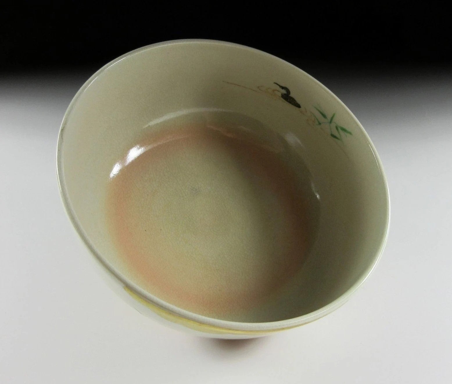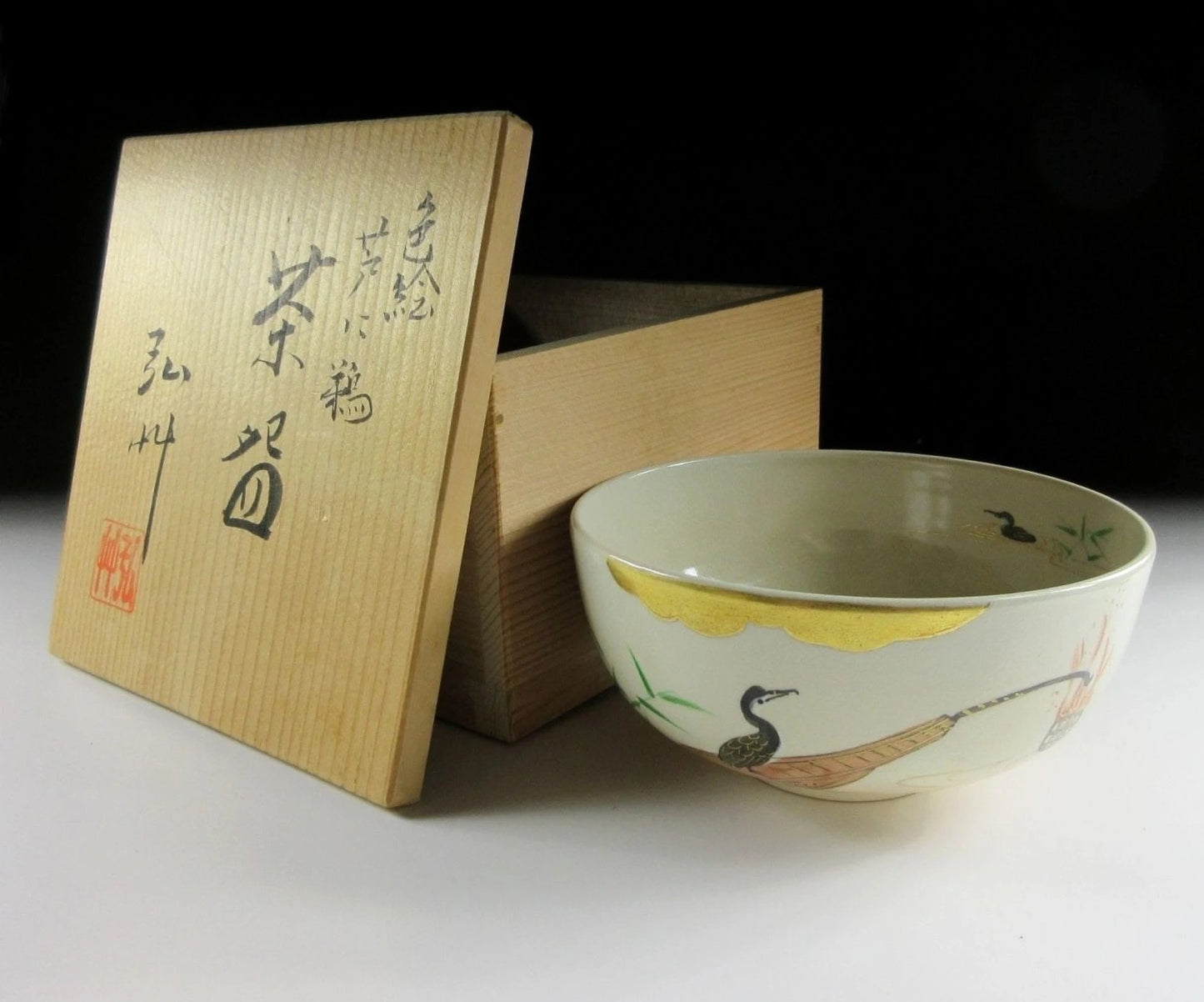 This listing is for a Kyo-ware hira chawan made around 30 years ago and signed ‘Hirokusa’. It is wheel-thrown and the flat hira type used during the summer season. Hira chawan are shallow bowls with low sides designed to cool tea down faster. The bowl in this listing is decorated with a hand-painted depiction of a cormorant on a fishing boat, with a smaller cormorant in the water on the interior of the bowl. Cormorant fishing, or ukai as its known in Japanese, is a 1300 year old tradition that takes place during summer. Fishermen in long wooden boats lead cormorants that swim alongside the boat to catching fish. The event attracts many visitors during the summer season, and master fishermen have official patronage from the emperor. The stamp of the potter can be found on the bottom, and it comes with its original signed wooden storage box.