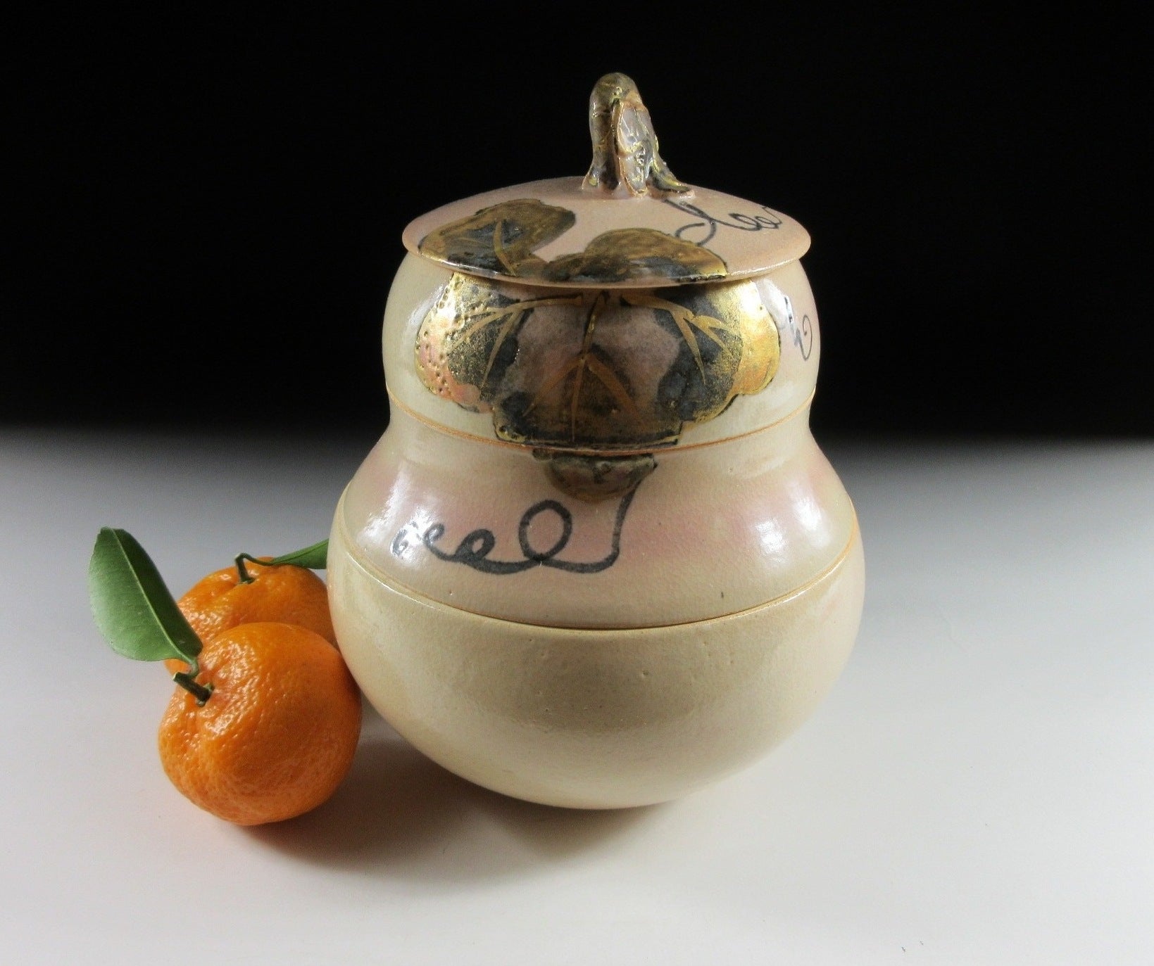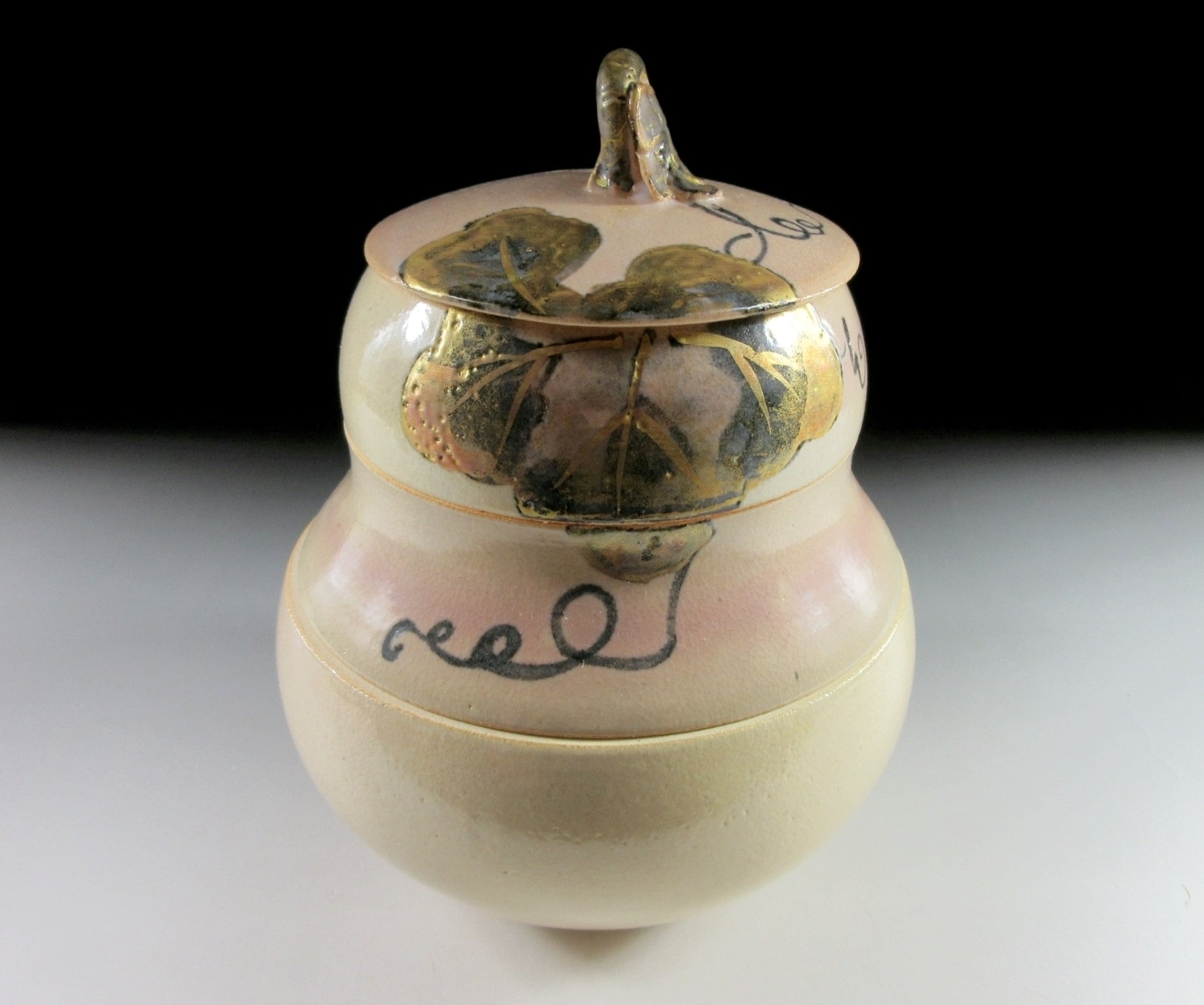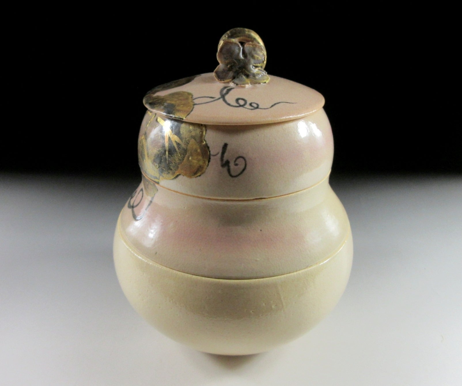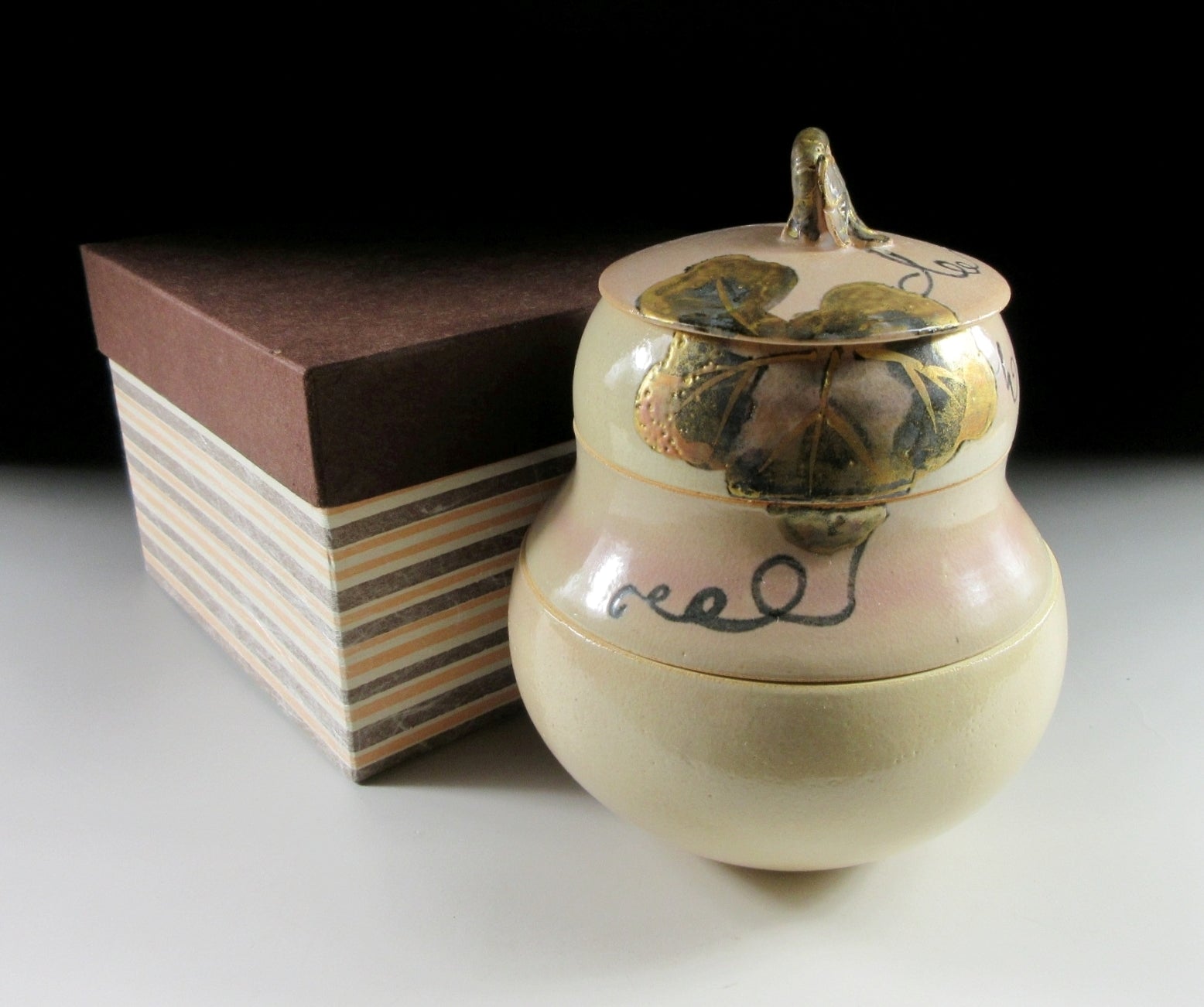 This listing is for a small Kyo-ware hyotan shaped jubako made around 30 years ago. It is wheel-thrown and shaped to resemble a gourd. Gourds are an auspicious symbol linked to longevity and fertility. They were also used as seed containers, and older Japanese will tell you that seeds kept in such containers were always fruitful. This item appears unused and is intended for serving New Year cuisine, however it could also be used for serving sweets or for holding trinkets. The stamp of the potter can be found on the bottom and it comes with its original paper storage box.
