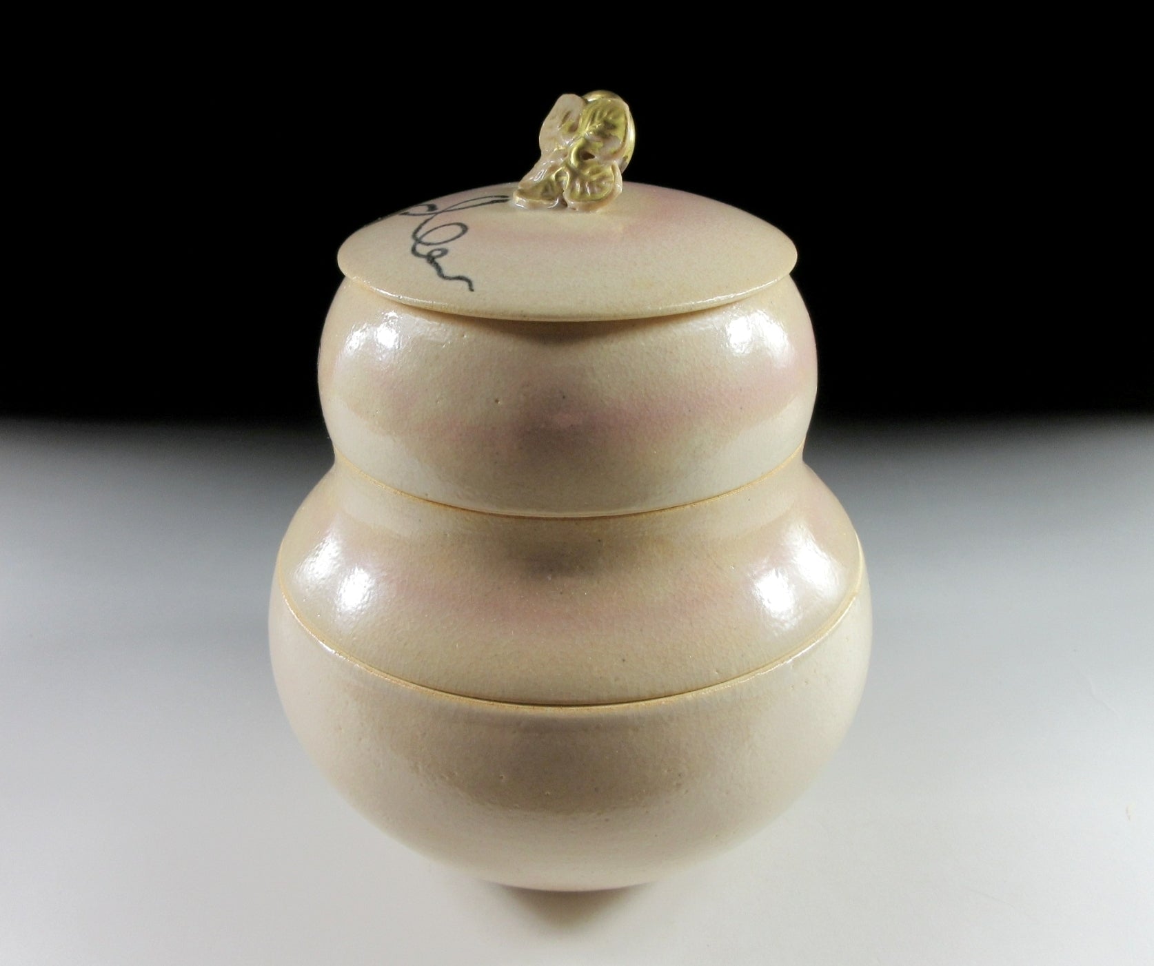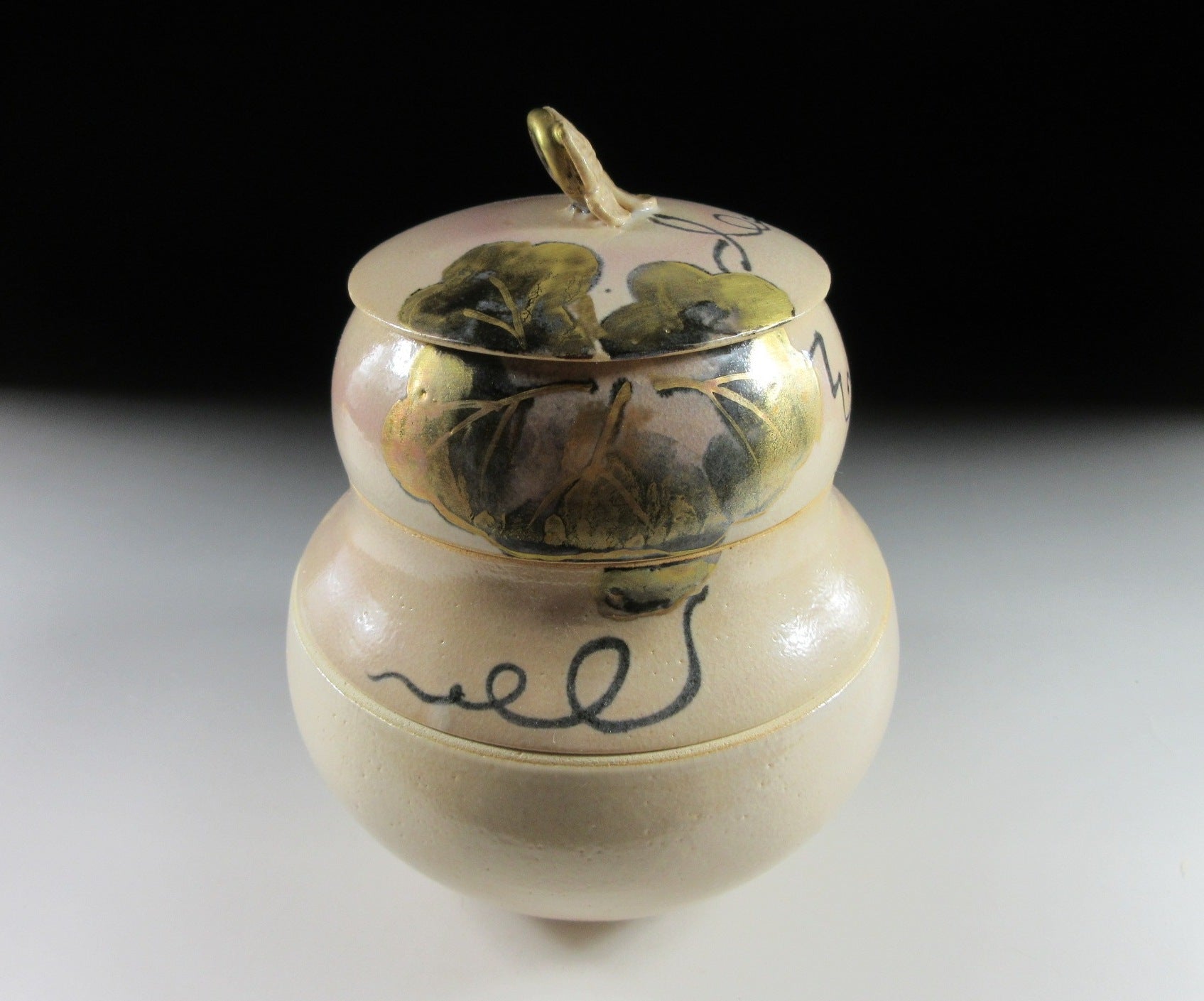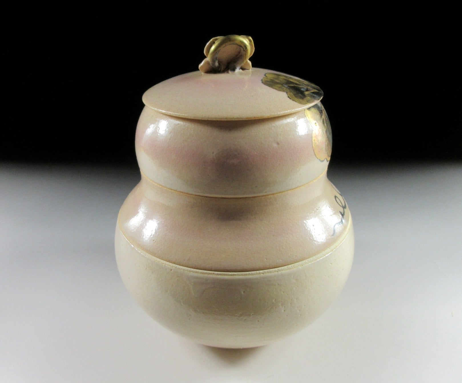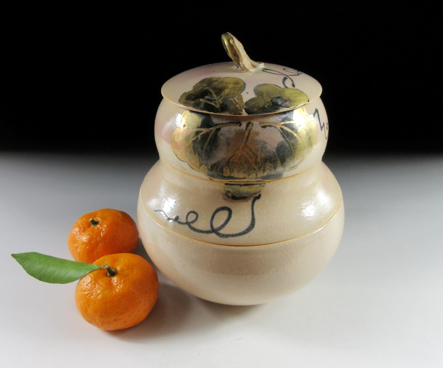 This listing is for a small Kyo-ware hyotan shaped jubako made around 30 years ago. It is wheel-thrown and shaped to resemble a gourd. Gourds are an auspicious symbol linked to longevity and fertility. They were also used as seed containers, and older Japanese will tell you that seeds kept in such containers were always fruitful. This item appears unused and is intended for serving New Year cuisine, however it could also be used for serving sweets or for holding trinkets. The stamp of the potter can be found on the bottom and it comes with its original paper storage box.