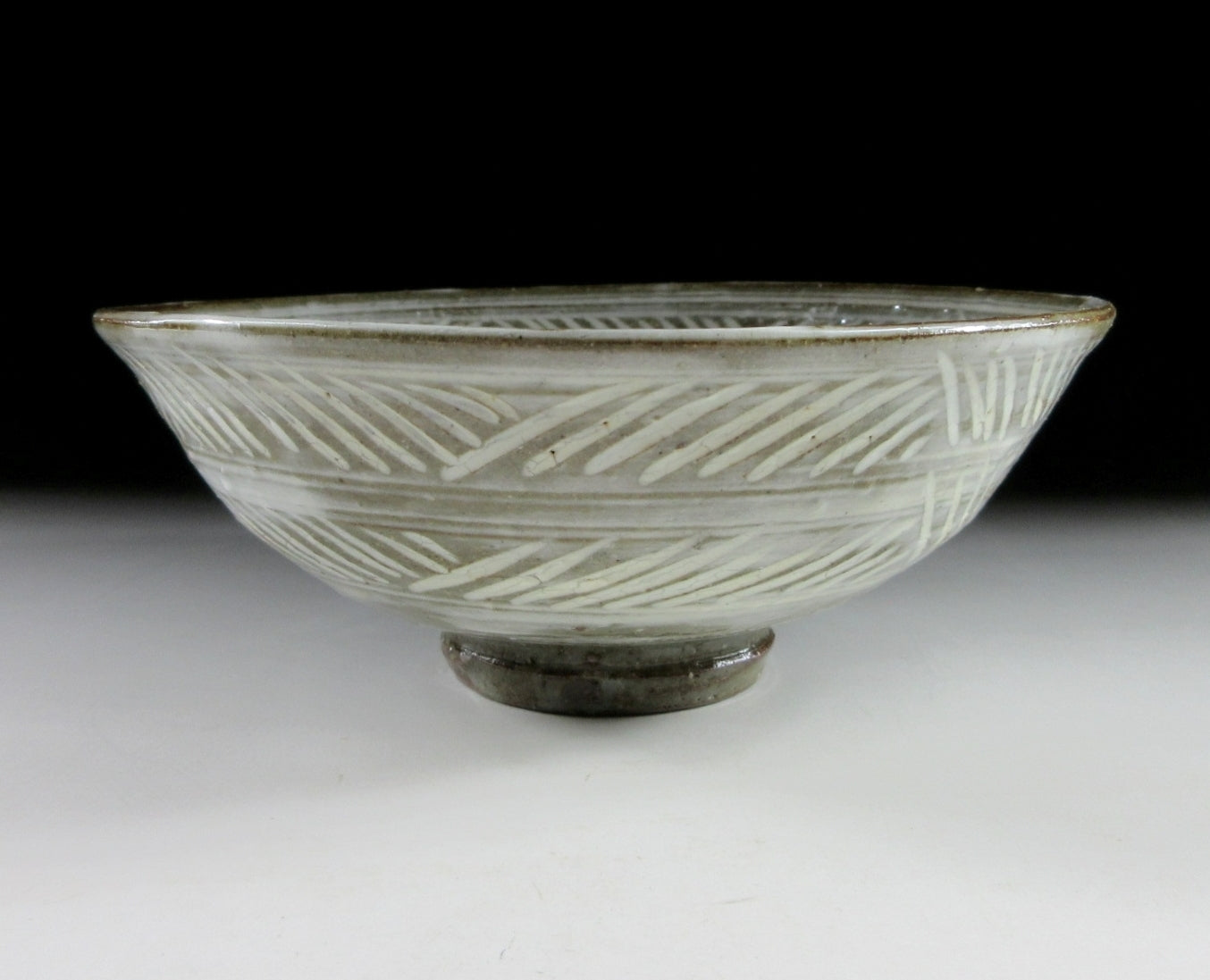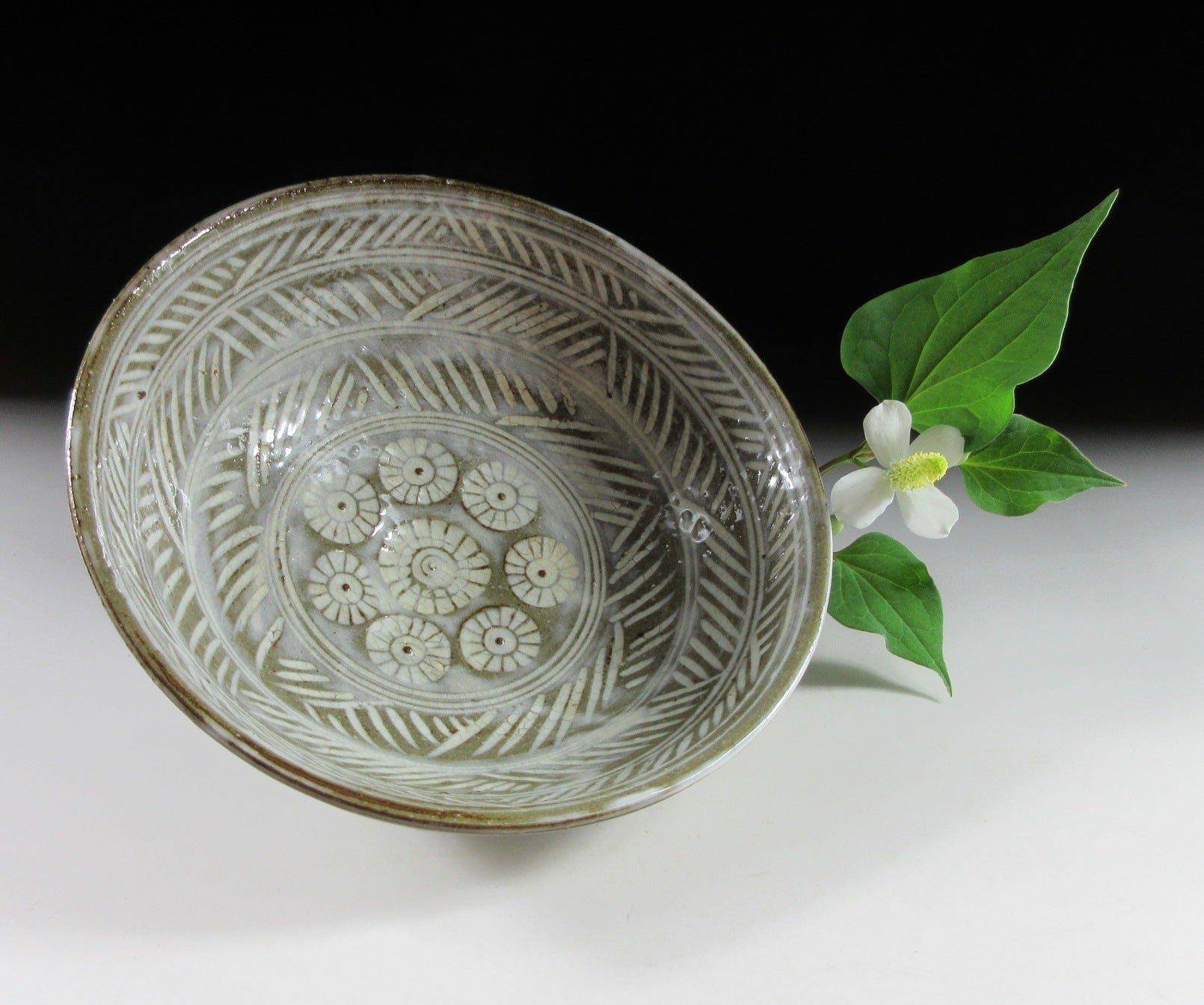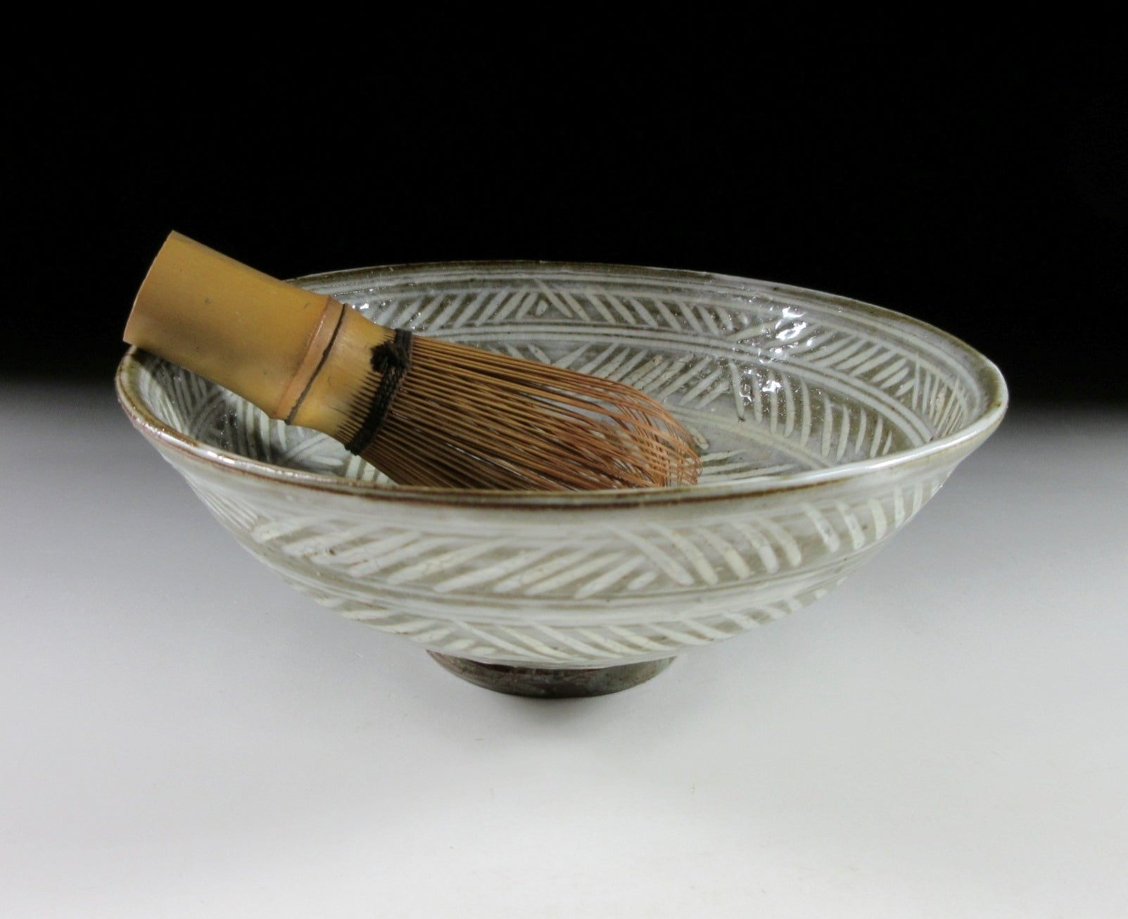 This listing is for a Kyo-ware chawan made around 20-30 years ago. It is wheel-thrown and the flat hira type used during the summer season. Hira chawan are shallow bowls with low sides designed to cool tea down faster. The bowl in this listing is decorated using the mishima technique. The mishima technique is Korean in origin and spread to Japan during the 17th century. The technique involves incising designs into the surface of green-ware, adding slip to them, and then coating the piece in a clear glaze. It is made of high-fired stoneware and the stamp of the potter can be found on the bottom. *PLEASE NOTE THAT THE CHASHAKU TEA SCOOP AND CHASEN TEA WHISK ARE NOT INCLUDED IN THIS LISTING.