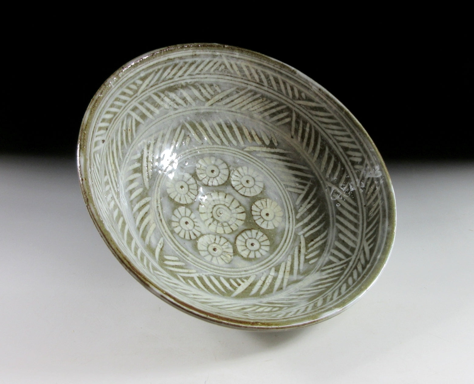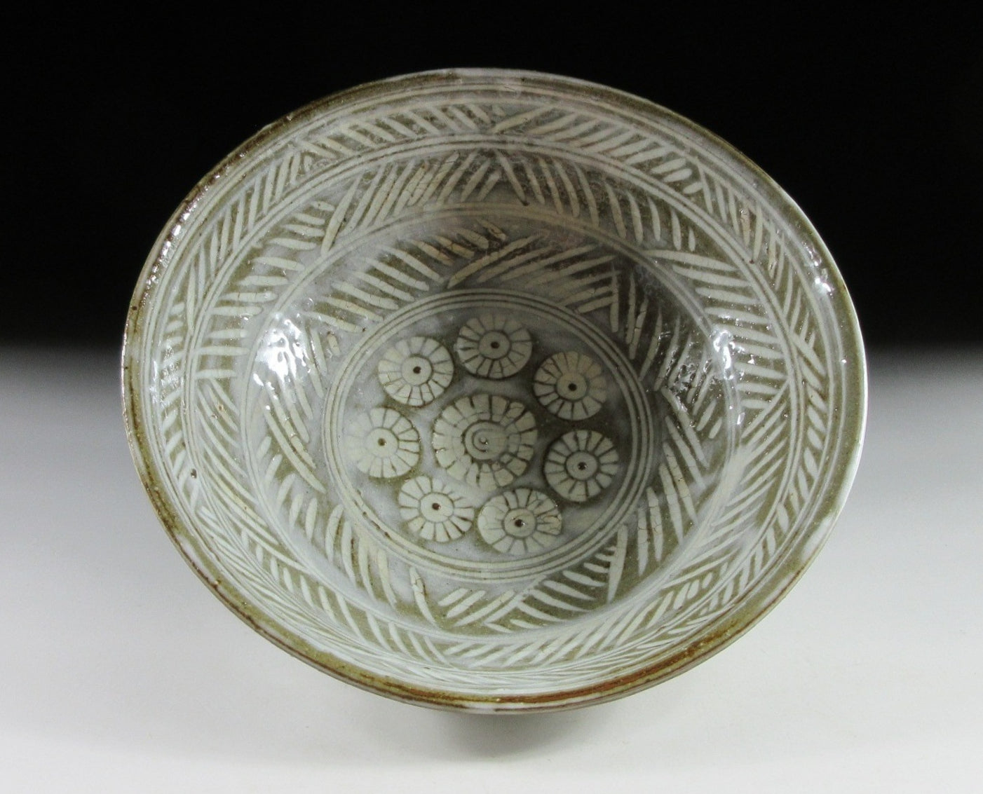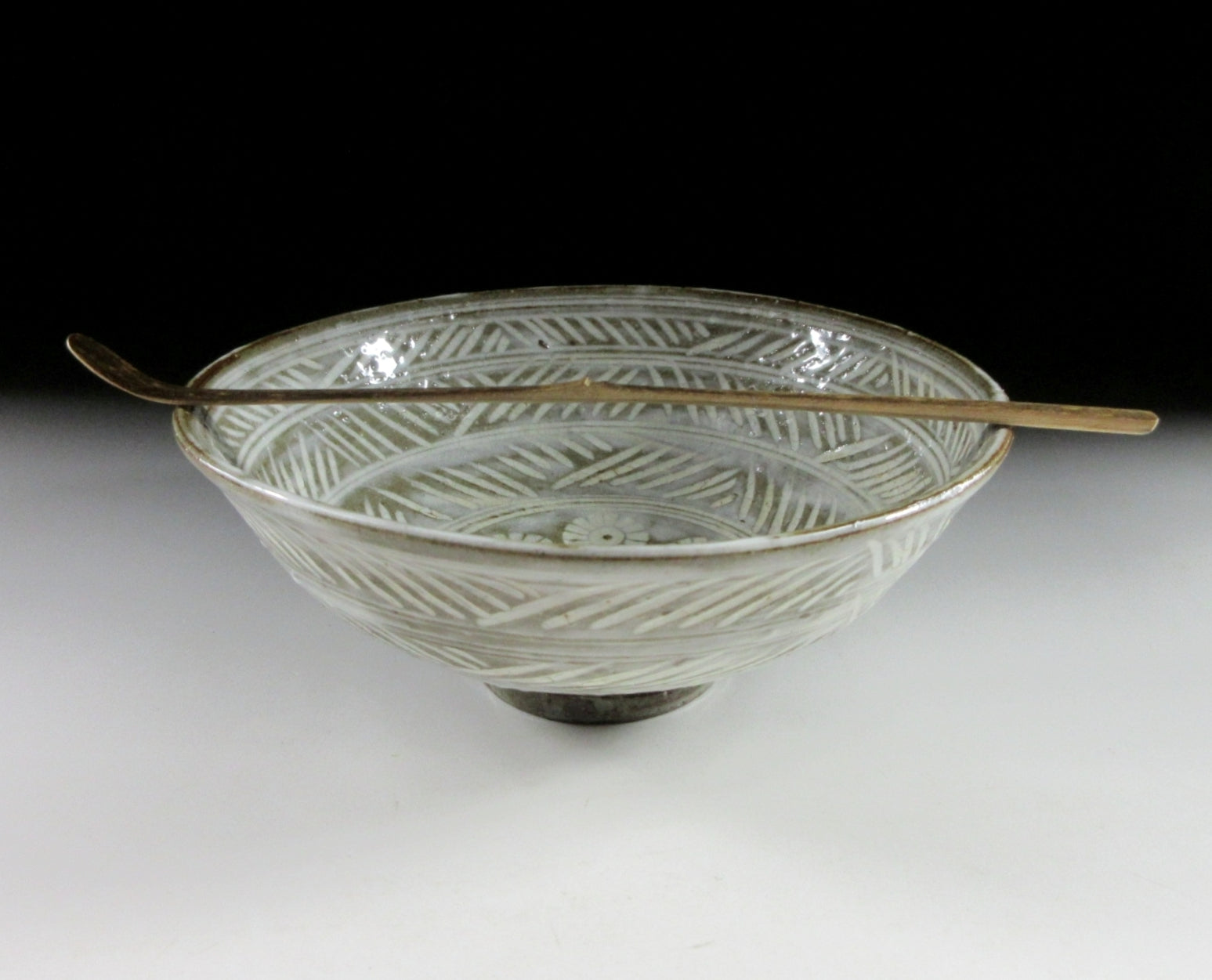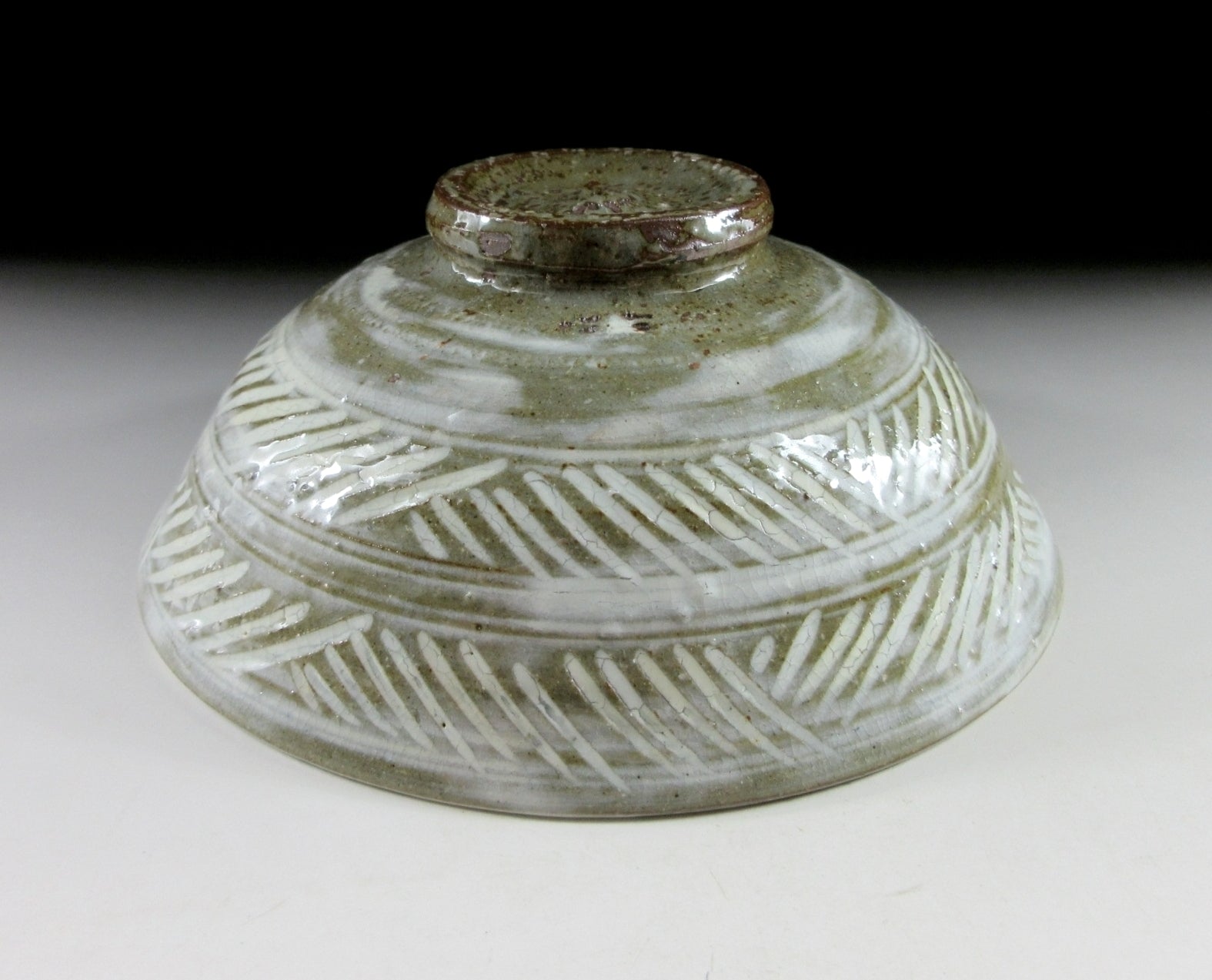 This listing is for a Kyo-ware chawan made around 20-30 years ago. It is wheel-thrown and the flat hira type used during the summer season. Hira chawan are shallow bowls with low sides designed to cool tea down faster. The bowl in this listing is decorated using the mishima technique. The mishima technique is Korean in origin and spread to Japan during the 17th century. The technique involves incising designs into the surface of green-ware, adding slip to them, and then coating the piece in a clear glaze. It is made of high-fired stoneware and the stamp of the potter can be found on the bottom. *PLEASE NOTE THAT THE CHASHAKU TEA SCOOP AND CHASEN TEA WHISK ARE NOT INCLUDED IN THIS LISTING.