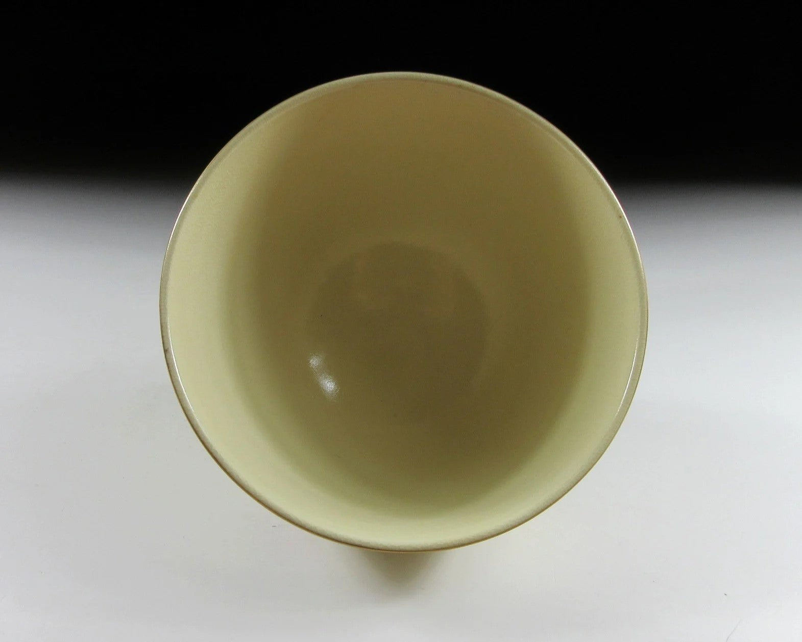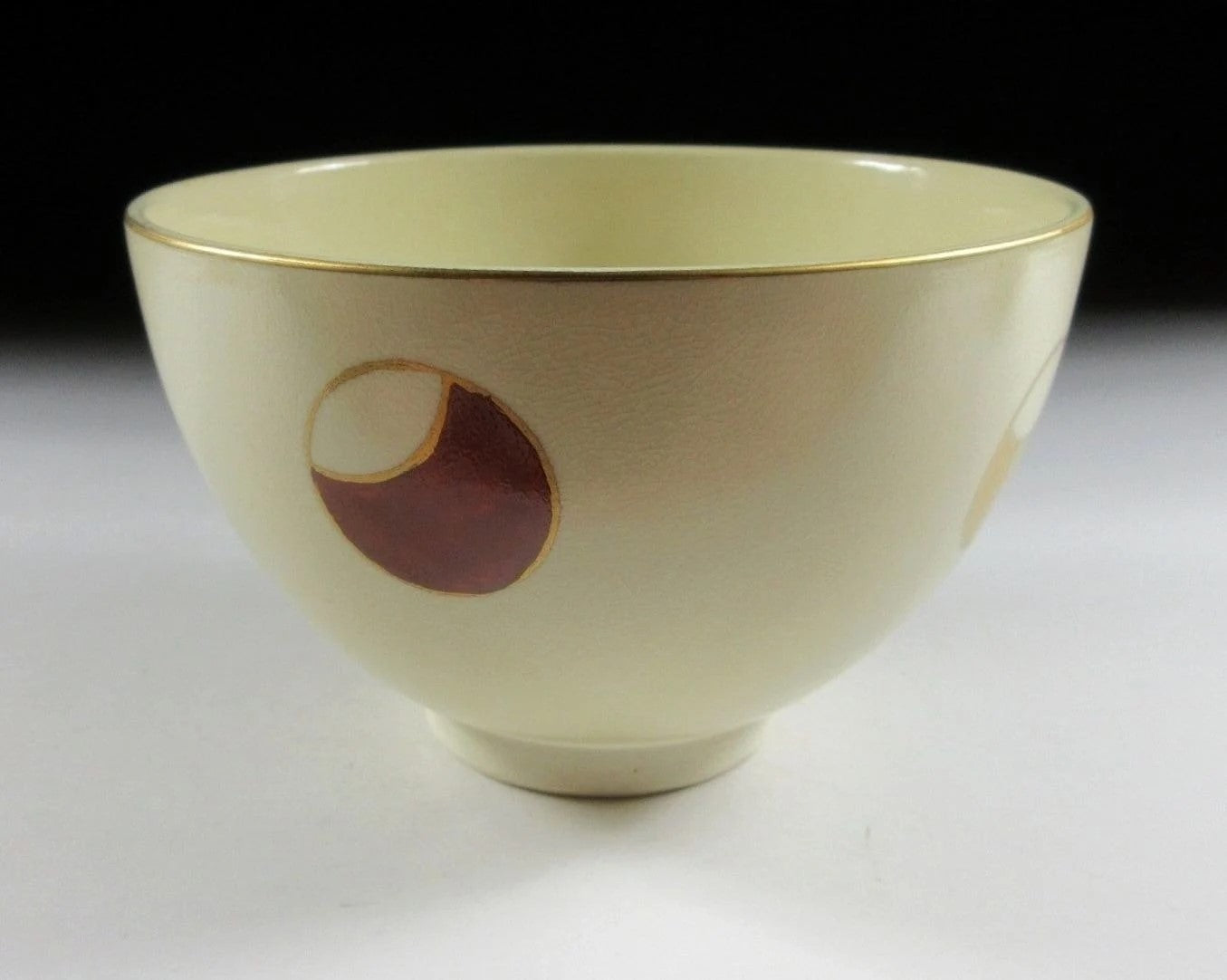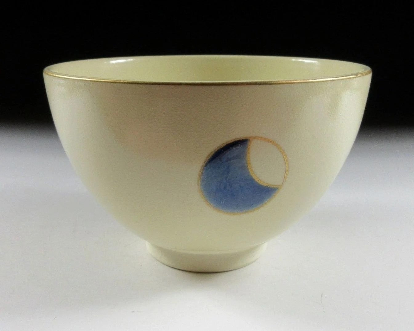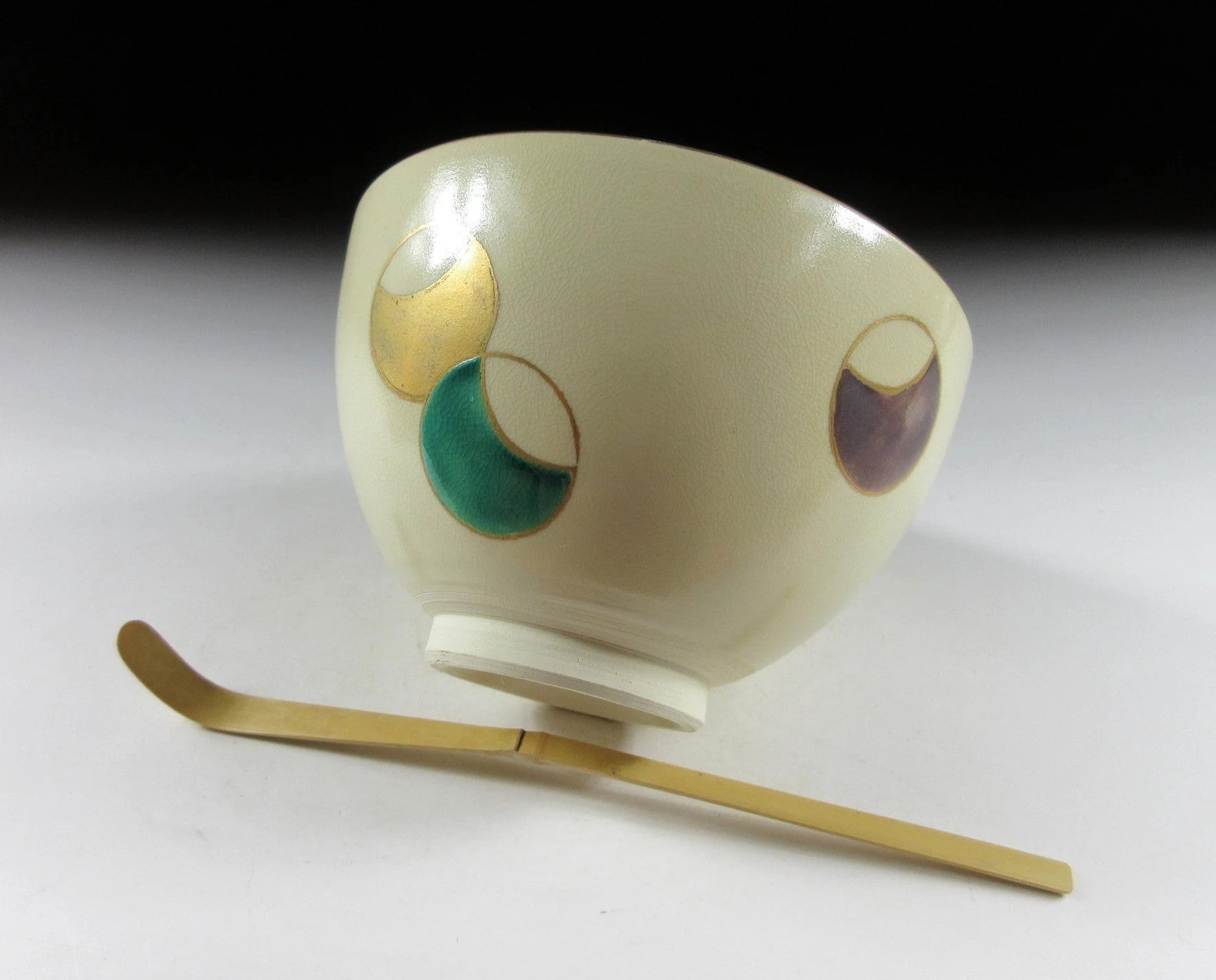 This listing is for a Kyo-ware chawan made around 20 years ago. It is wheel-thrown and decorated with a traditional Urasenke 'tsubo-tsubo' pattern. It is thin walled, and the rim is trimmed with gold enamel. The signature of the potter can be found on the bottom. *PLEASE NOTE THAT THE CHASHAKU IS NOT INCLUDED.
